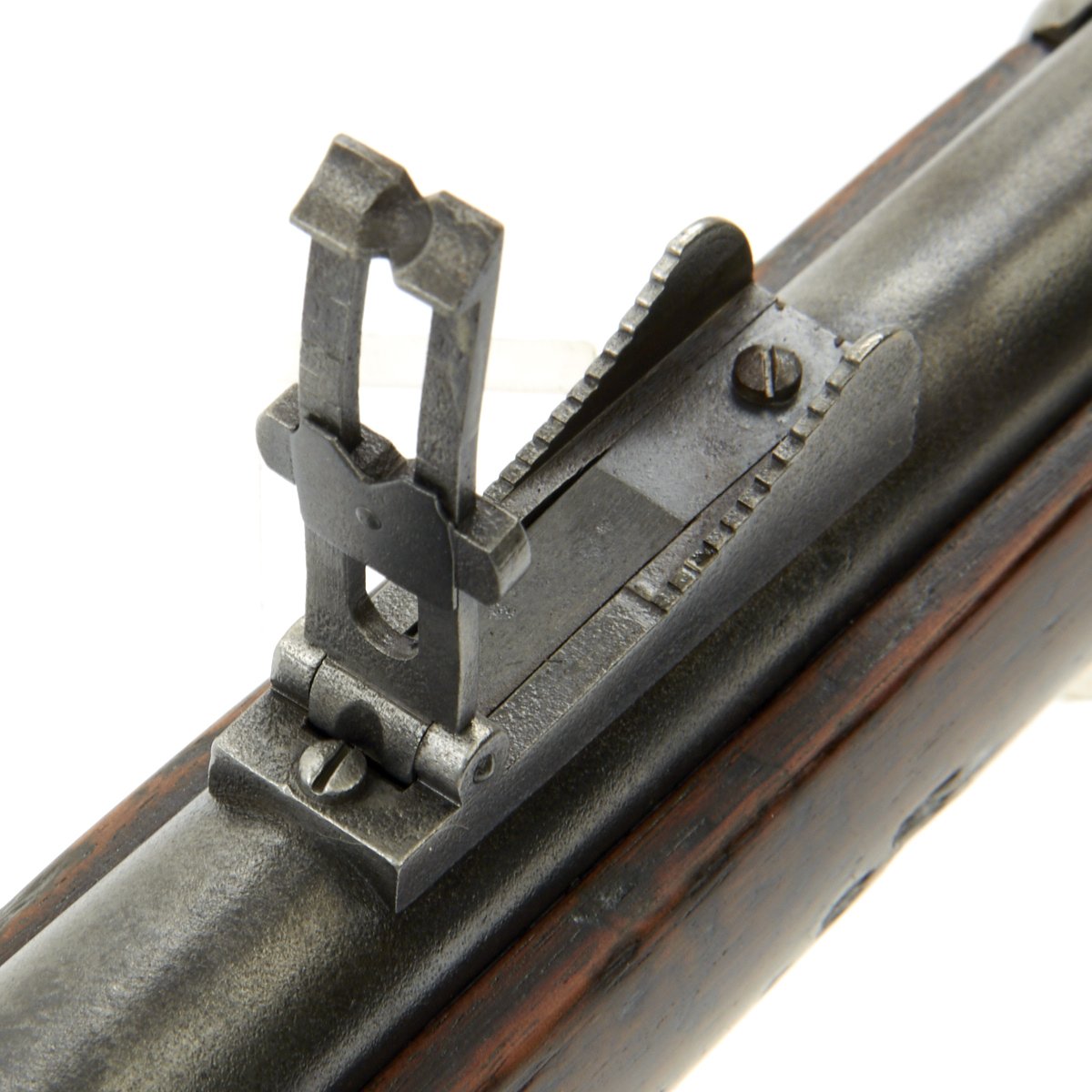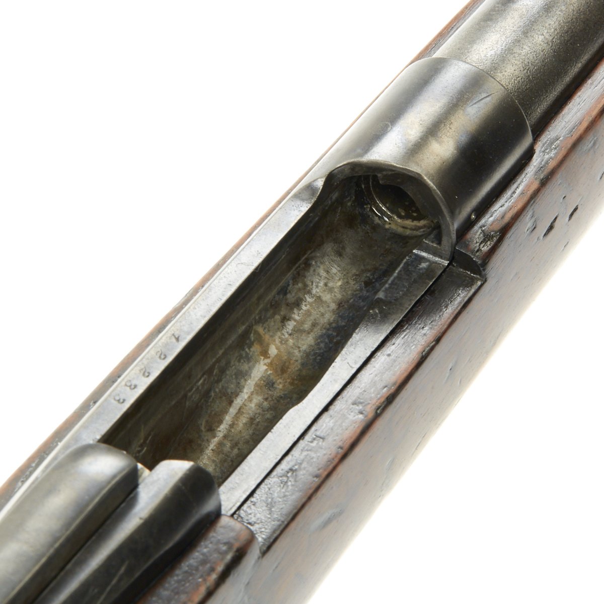 Our example has been fully cleaned and is in really good condition, all complete except for the front sight blade. It has a nice cavalry saddle-ring attached to the left side of the carbine. The stock has the expected dings and scratches from age and use, but no splits at the wrist, which were common due to the amount of wood removed for the magazine cutoff safety. The bore is in very good condition, with clear land and grooves, and a mostly bright finish with small areas of oxidation.