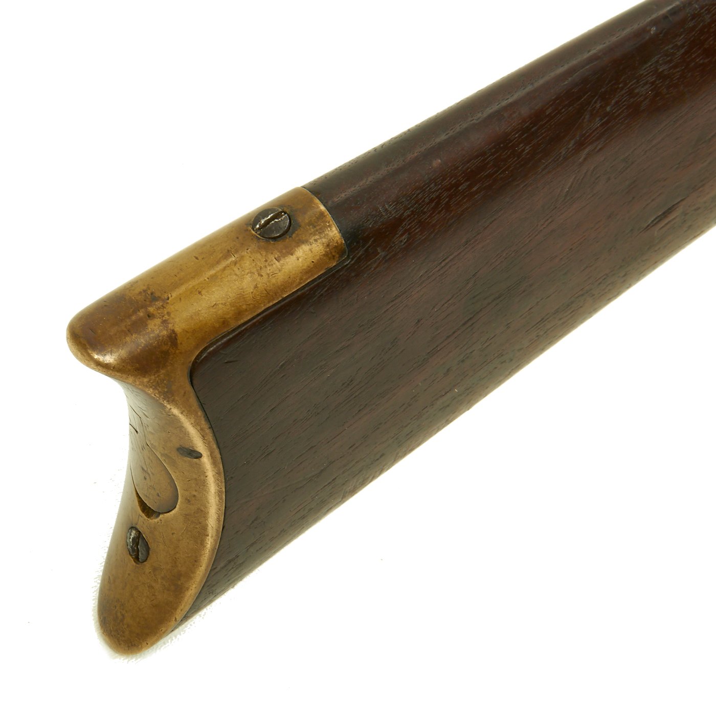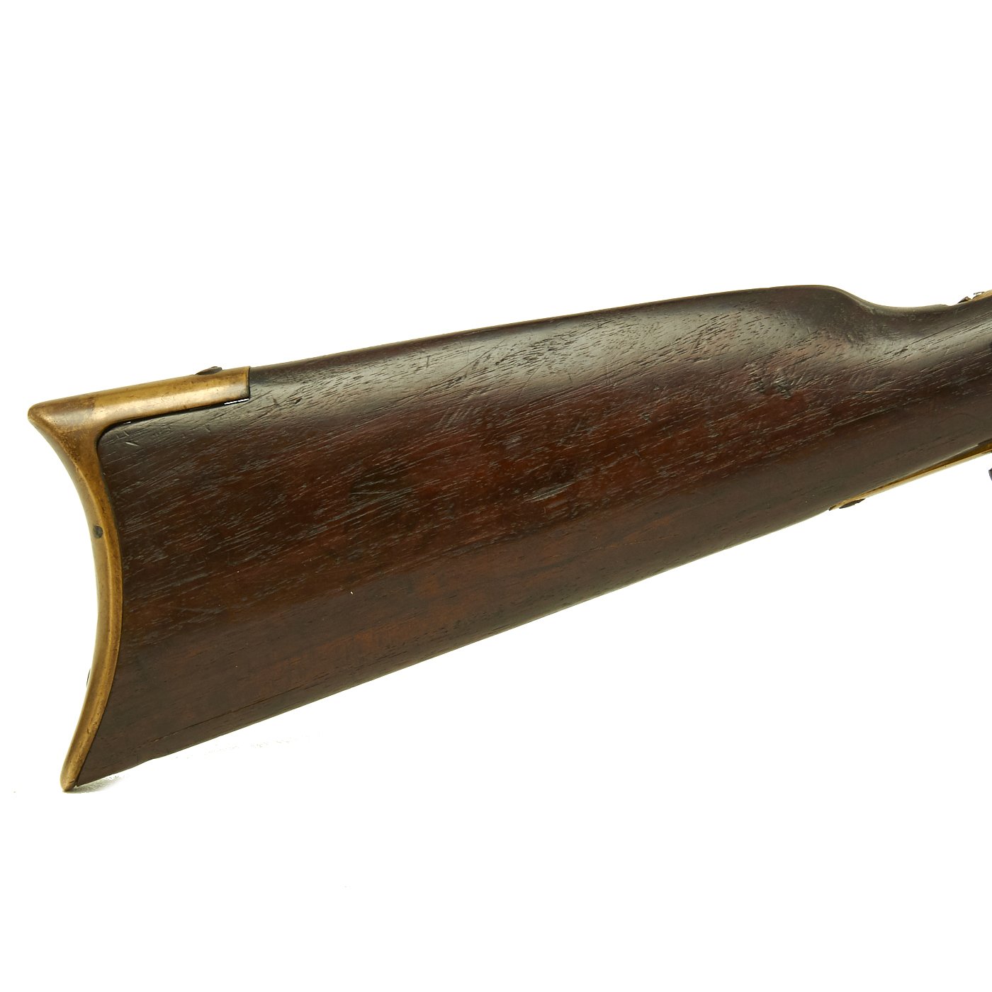 This Yellow "Gunmetal"-Framed Beauty is in .44 centerfire with a 20" round barrel and full-length magazine tube. These were originally all made in .44 Henry Rimfire, however a few late production Winchester 1866 rifles were configured to fire .44 Henry Centerfire. There were also period conversions to other centerfire cartridges. We unfortunately have not been able to determine whether this was a factory centerfire rifle, or whether it was converted shortly after.