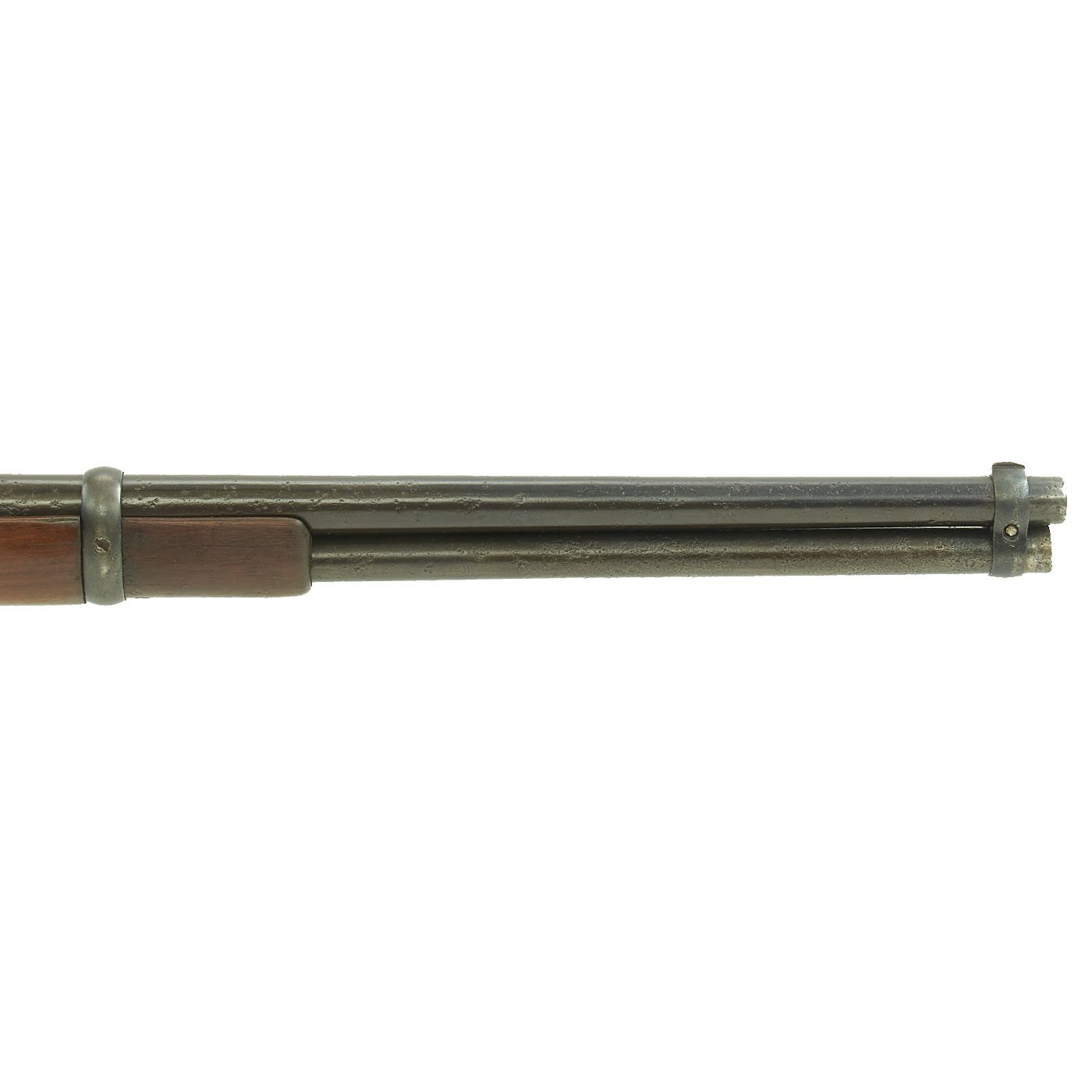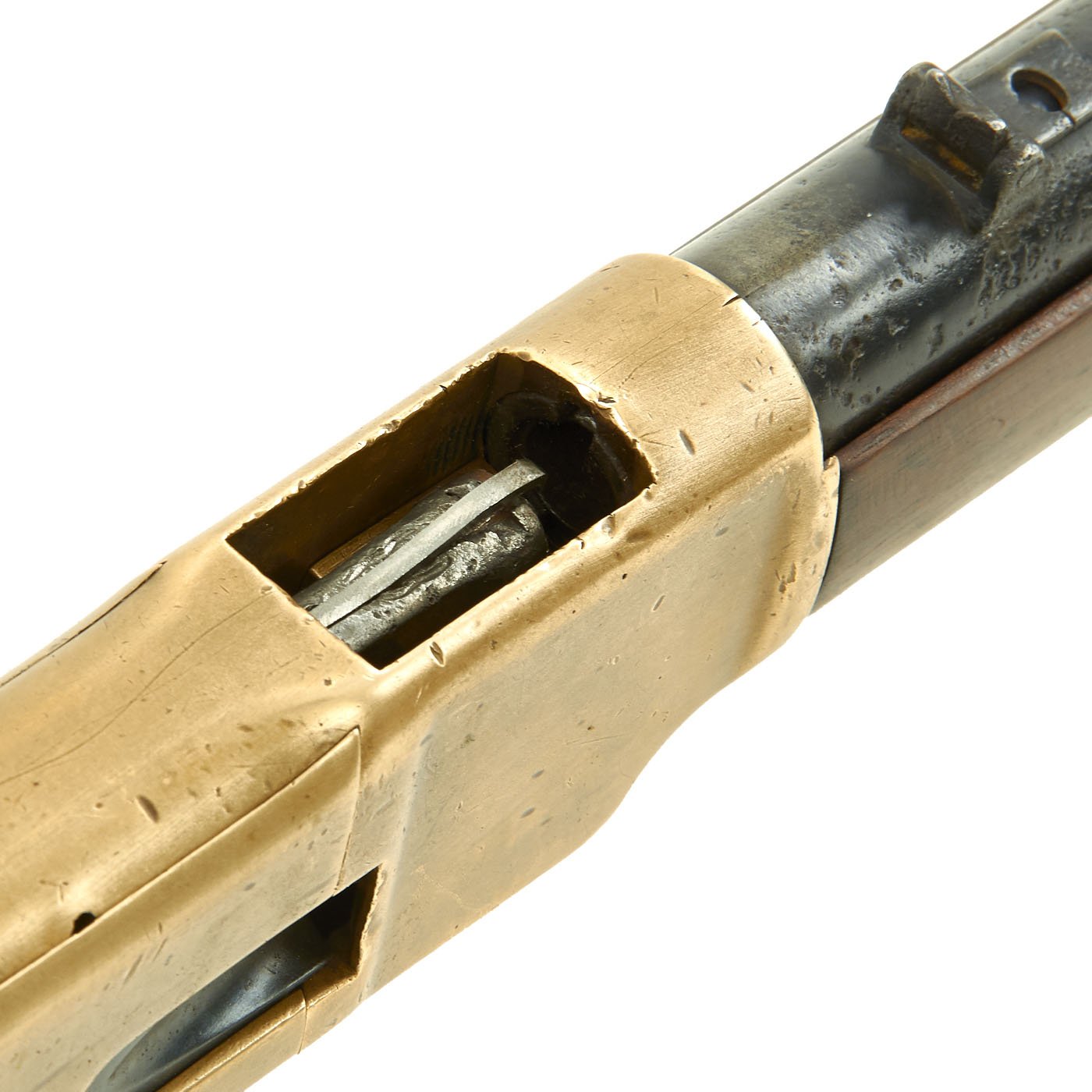 This example has seen quite a bit of use, so the barrel patent markings are completely gone, having been worn away from cleaning over the years. This example also looks to originally have had a saddle ring, but it was removed and the holes on the left receiver filled with brass.
