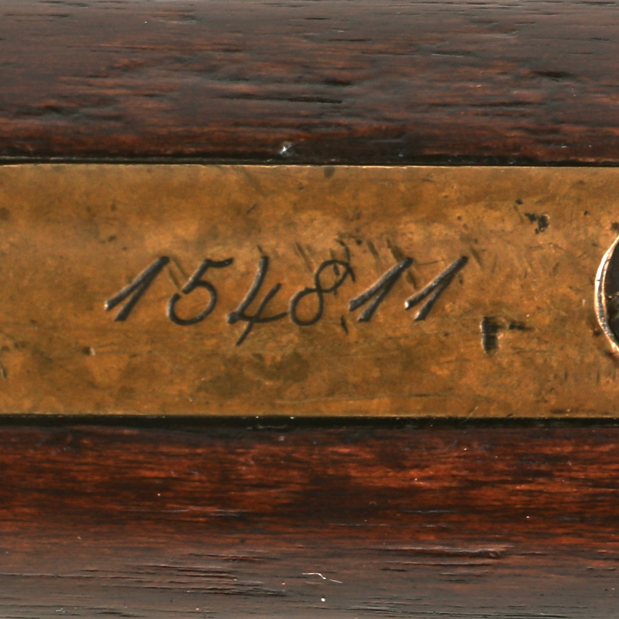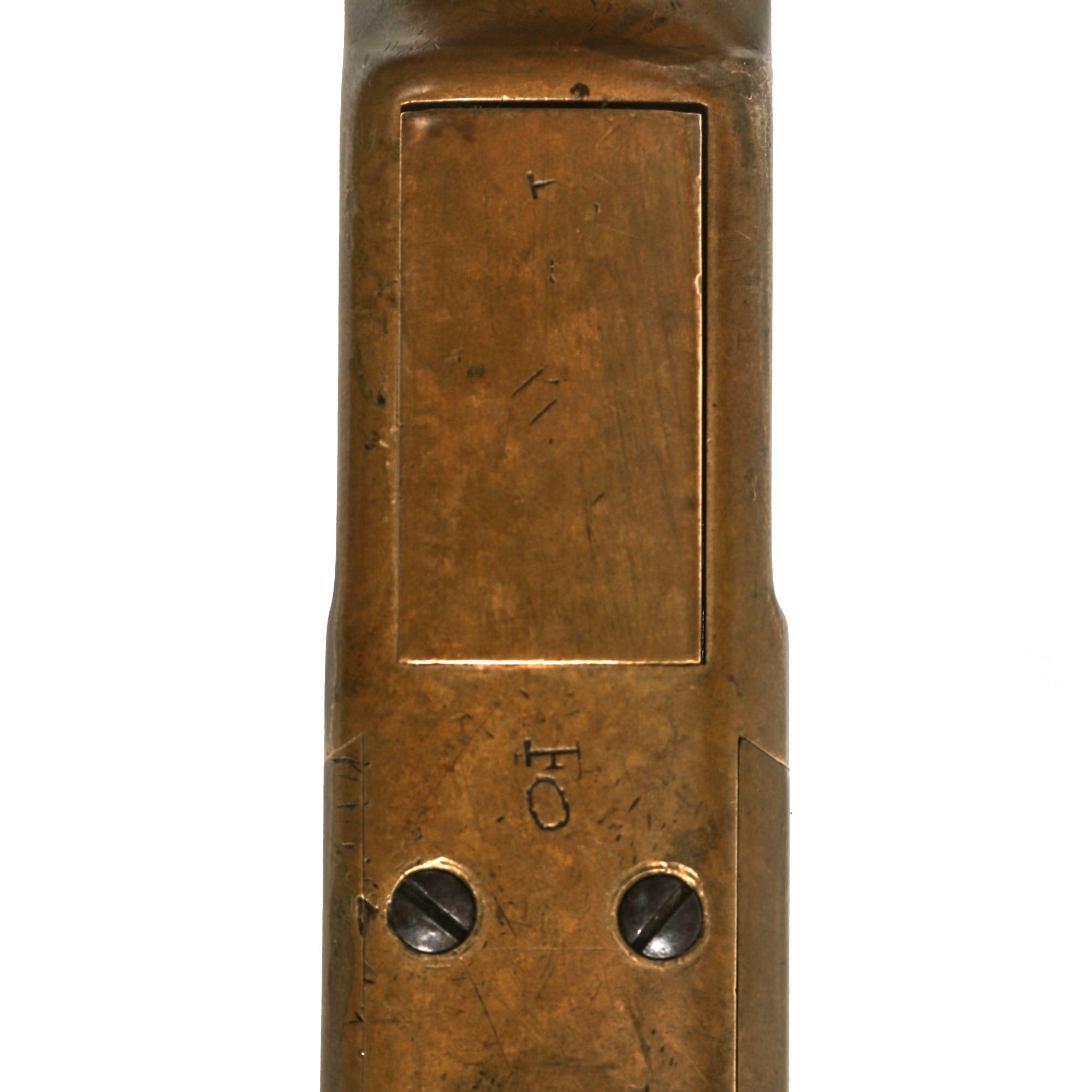The stocks are in very good condition, showing wear but also a lovely color, having been refinished some time in the past. The fore stock has some dents and dings, but not any cracks or other major damage. The butt stock is in similar condition, with some cracks next to the frame on the right side, which were repaired long ago. The hook-shaped gunmetal butt plate is in great shape, with a beautiful color, and the butt trap opens easily, but is unfortunately empty.