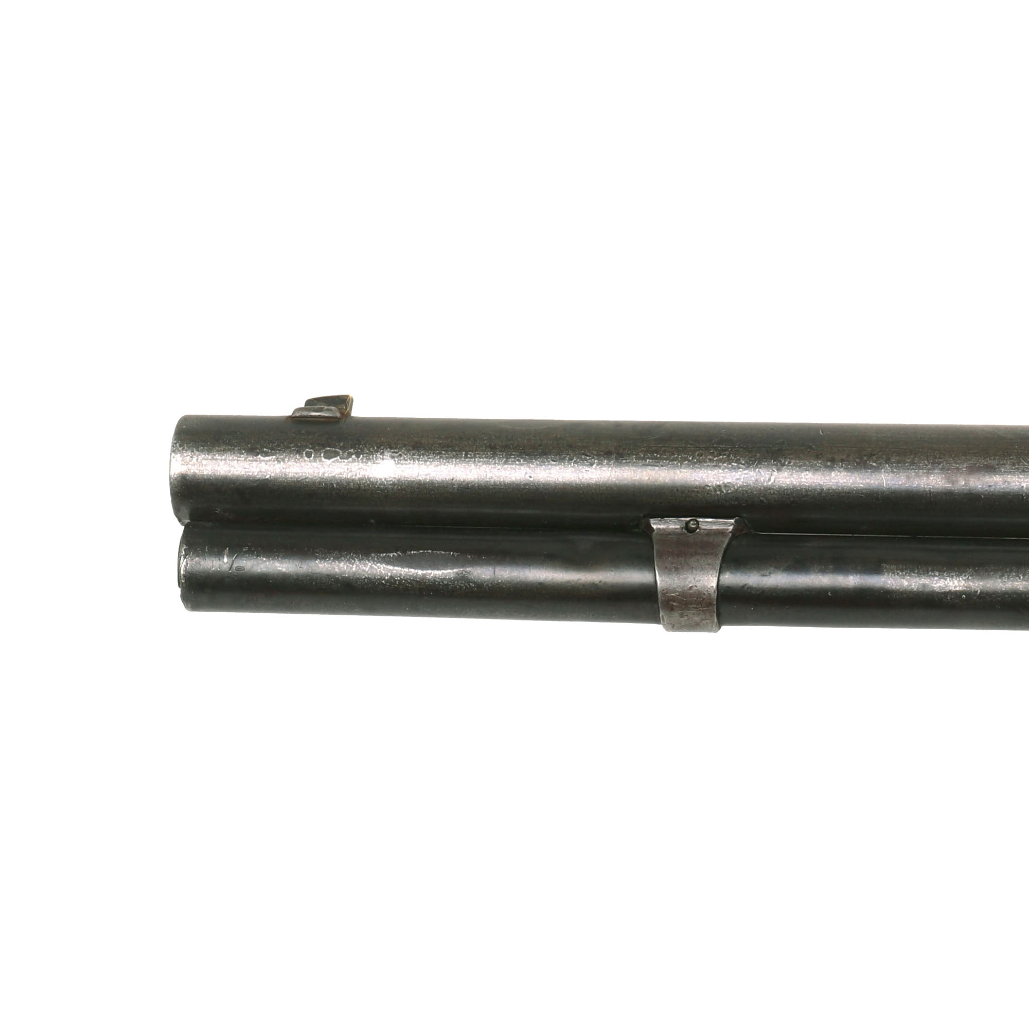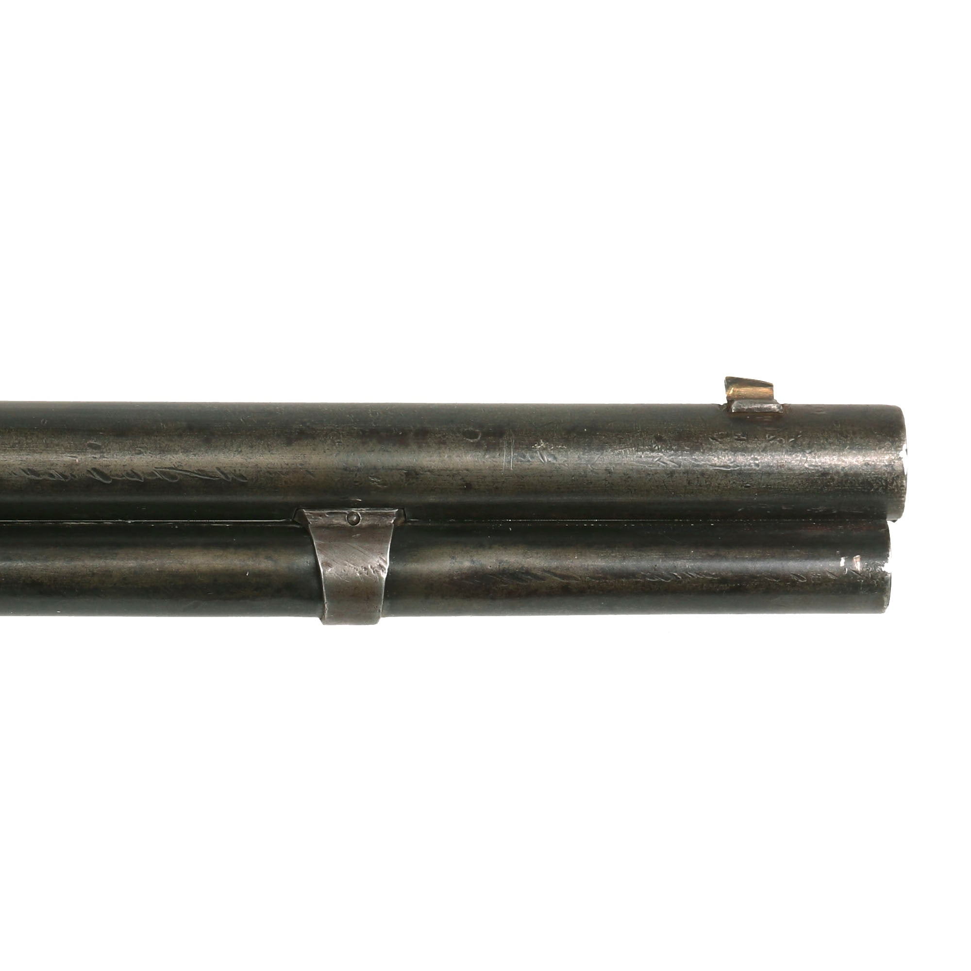 The action has a beautiful patina on the "gunmetal" frame, which we have left intact. The barrel has had the original bluing fade to a gray oxidized patina, but there is no major oxidation or peppering we can see, just wear from use and cleaning. The magazine tube is in similar condition, and does show a few small dents on the side, so we do not know if it is able to feed at present.
