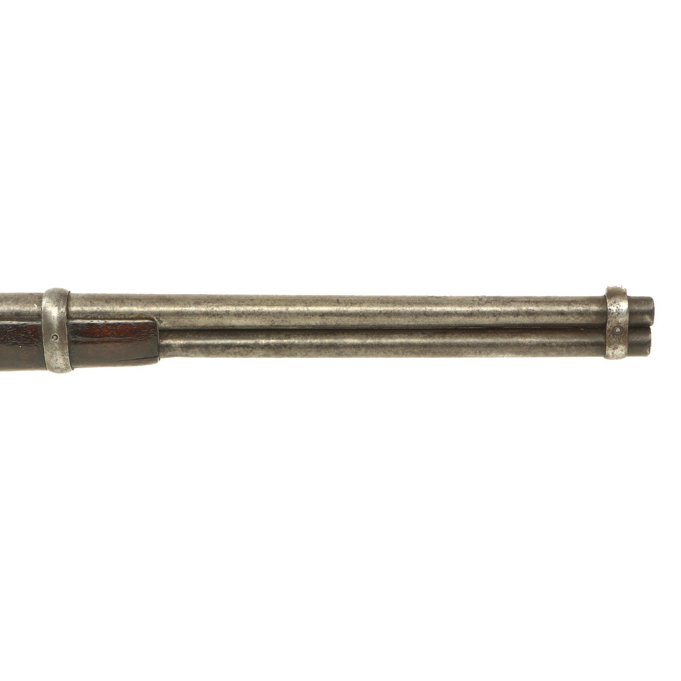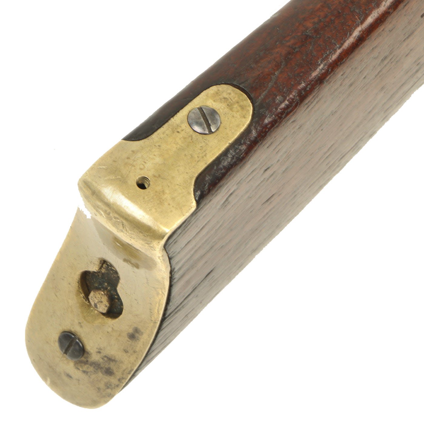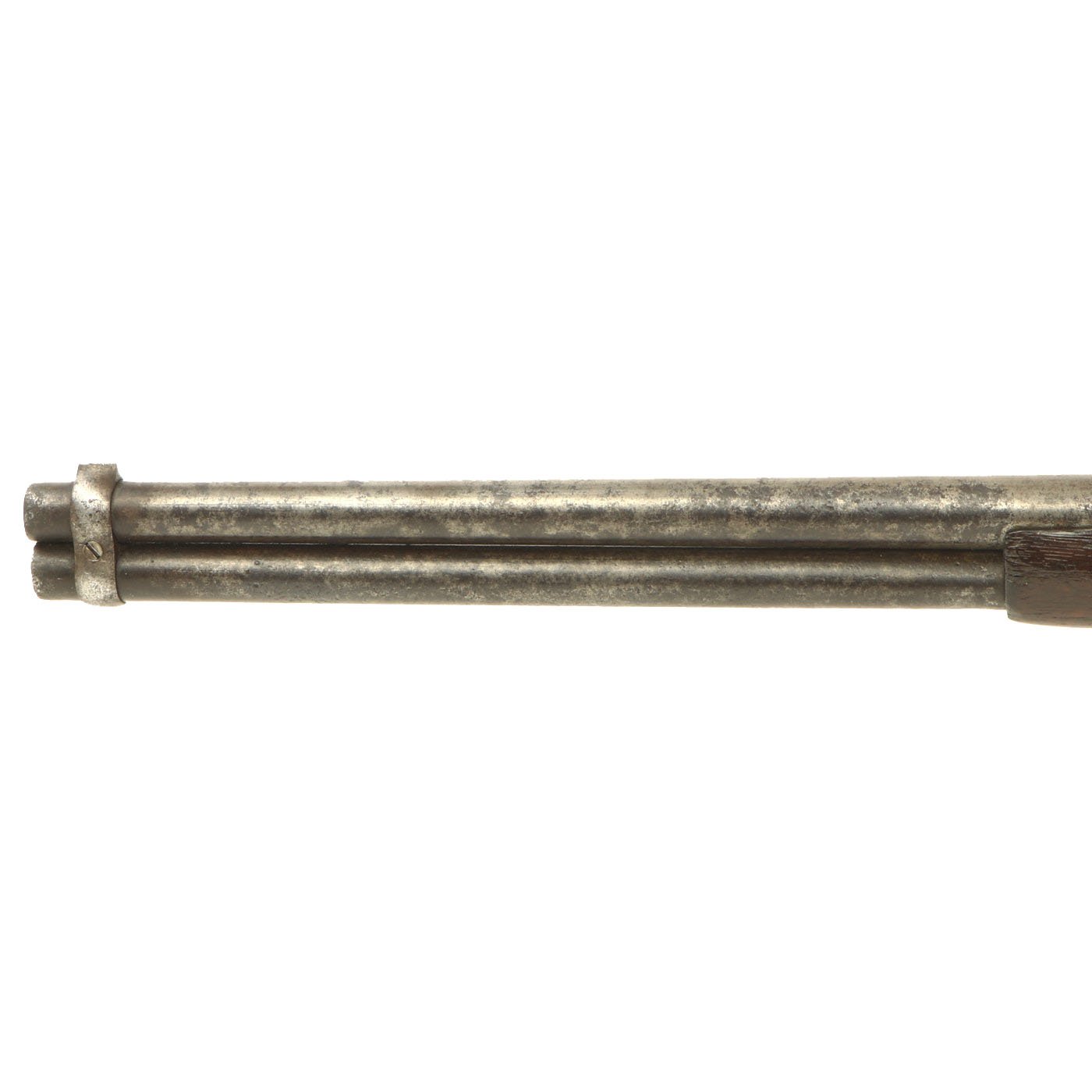 The receiver also still has the original saddle ring attached on the left side, which is often missing, though the loop is a bit loose. Stocks are in good condition, showing wear but also a lovely color, having been refinished some time in the past. The action has a beautiful patina on the "gunmetal" frame, which we have left intact. Barrel looks to have been cleaned and over the years, with areas of peppering and staining. Features a brass "flat" butt plate, with a working storage compartment.