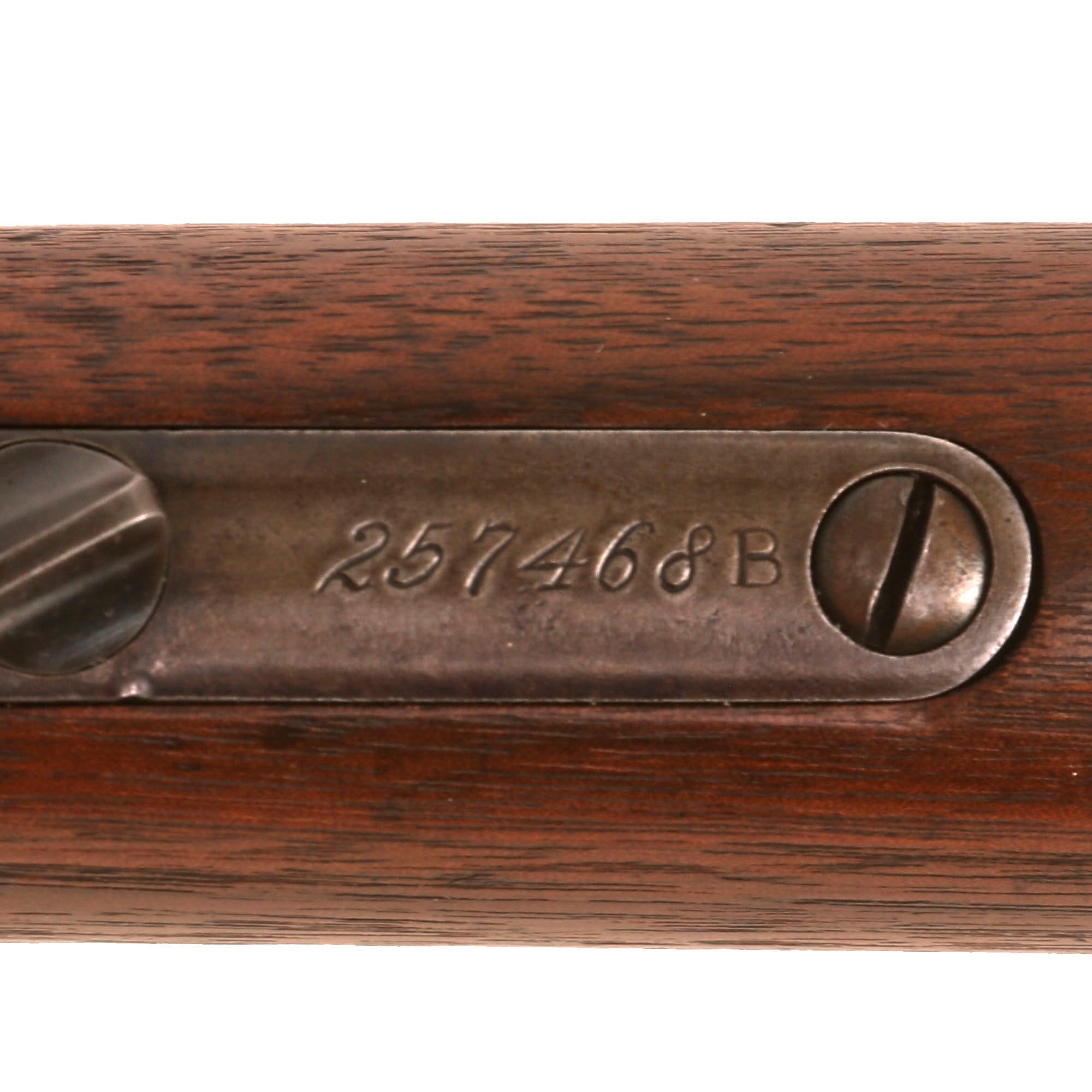 Condition of the rifle is very good, still showing the original blued finish very well, having worn to a faded plum patina in areas. There is not really any major oxidation or peppering, and the markings are still quite crisp, so we see no reason to think that it was refinished at any time. The wood stocks are solid, showing light wear from use, with the expected scratches, dents, and dings, but no major damage such as cracks or repairs. The crescent butt plate on this example does not have a storage compartment.