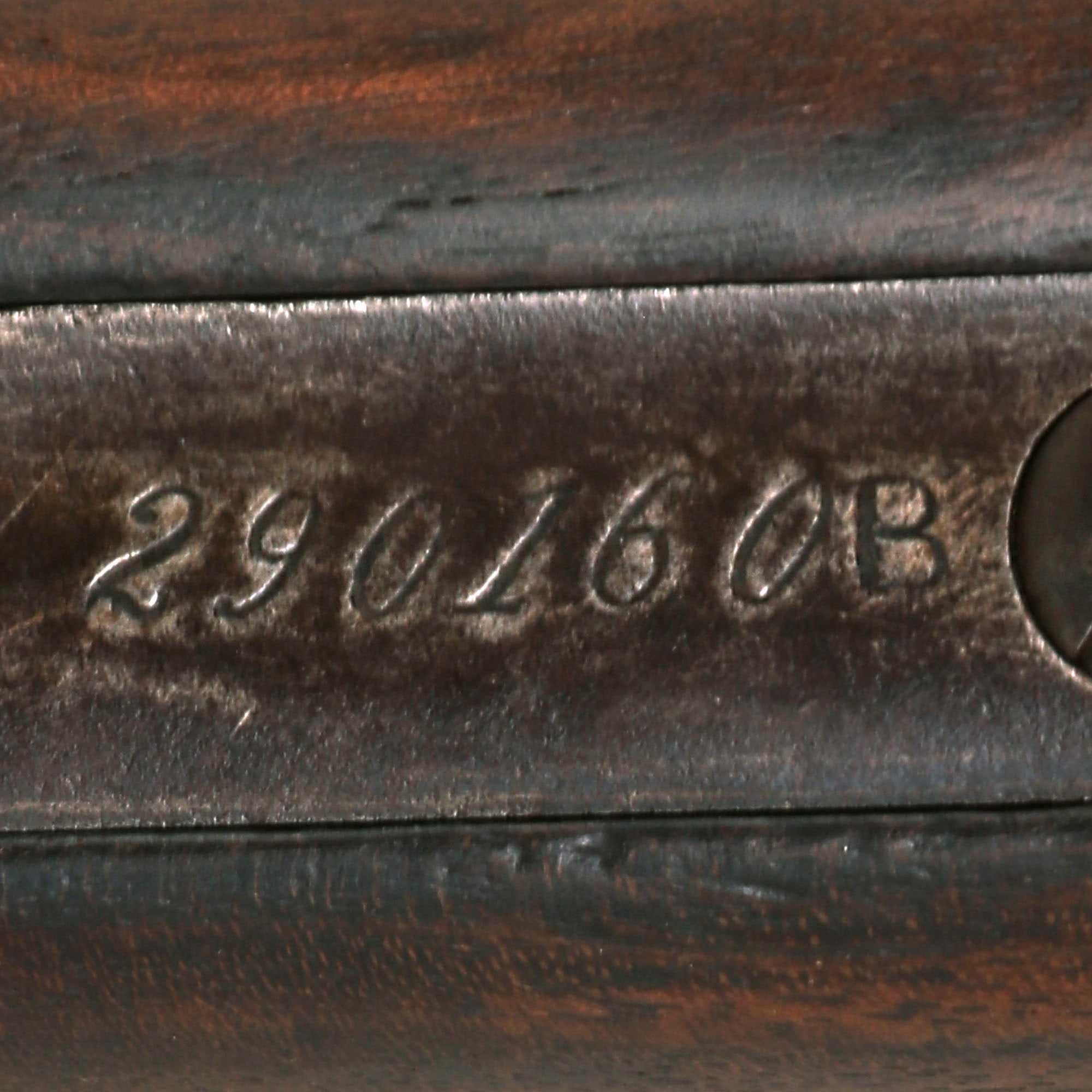 Condition of the rifle is very good, with the metalwork showing a lovely worn gray patina overall, faded from the original blue. There are just a few small areas of rust peppering, but they are only minor. The wood stocks are in very good service used condition, with a lovely dark red brown color, showing moderate wear from use, including scratches and dents. The butt stock is definitely in a bit better shape than the fore stock, which shows more wear to the surface, which is common due to sweat and oils from handling. The crescent butt plate on this example does not have a storage compartment.