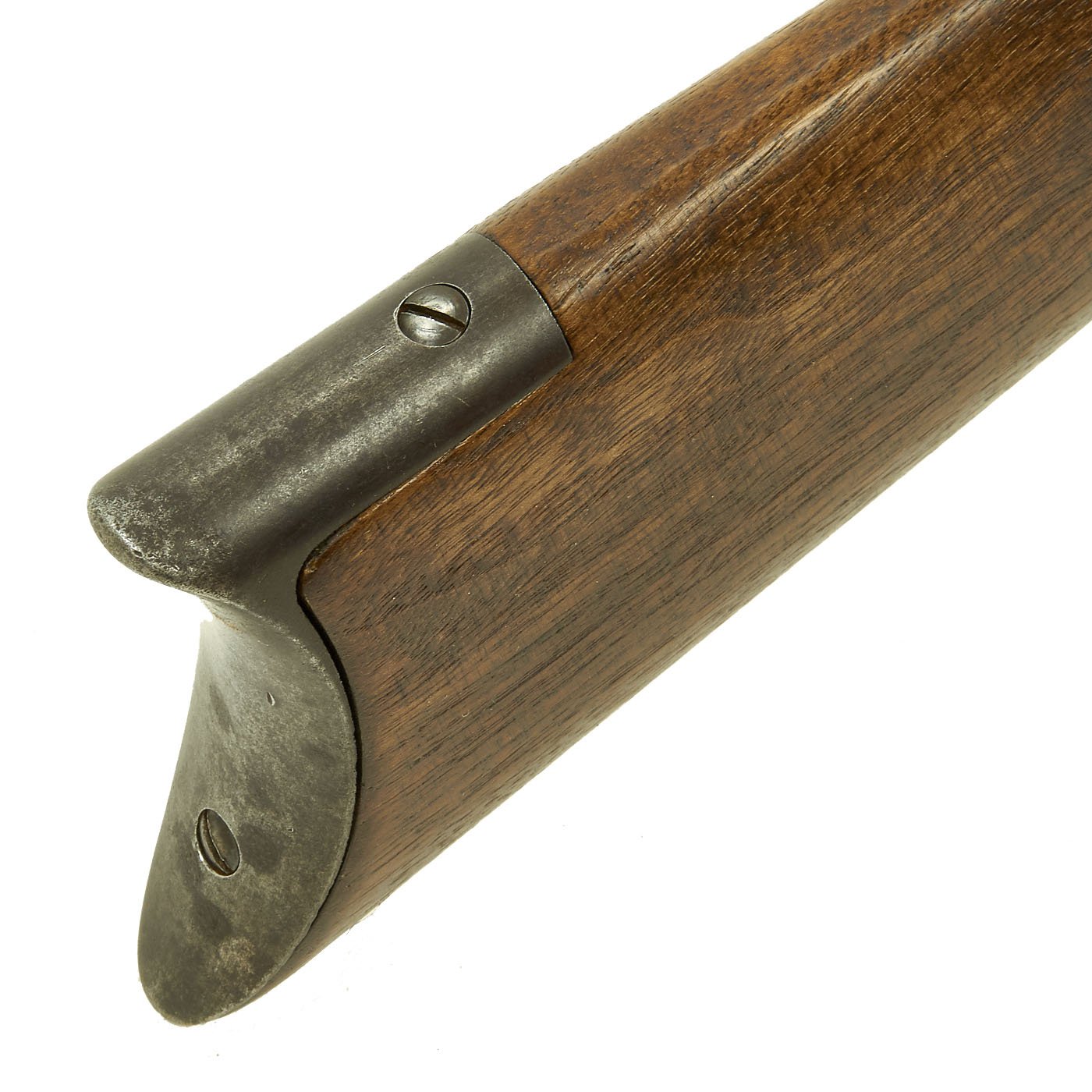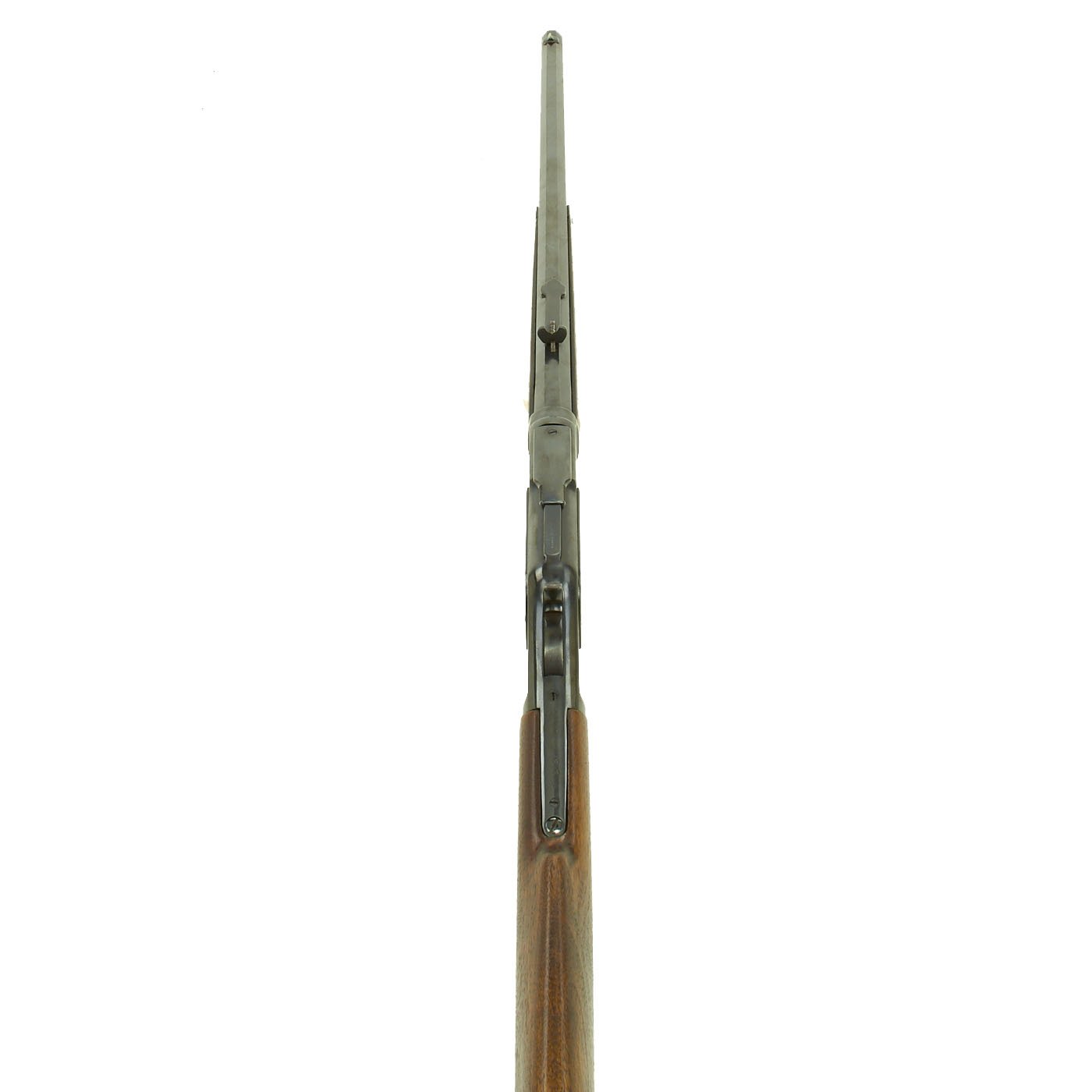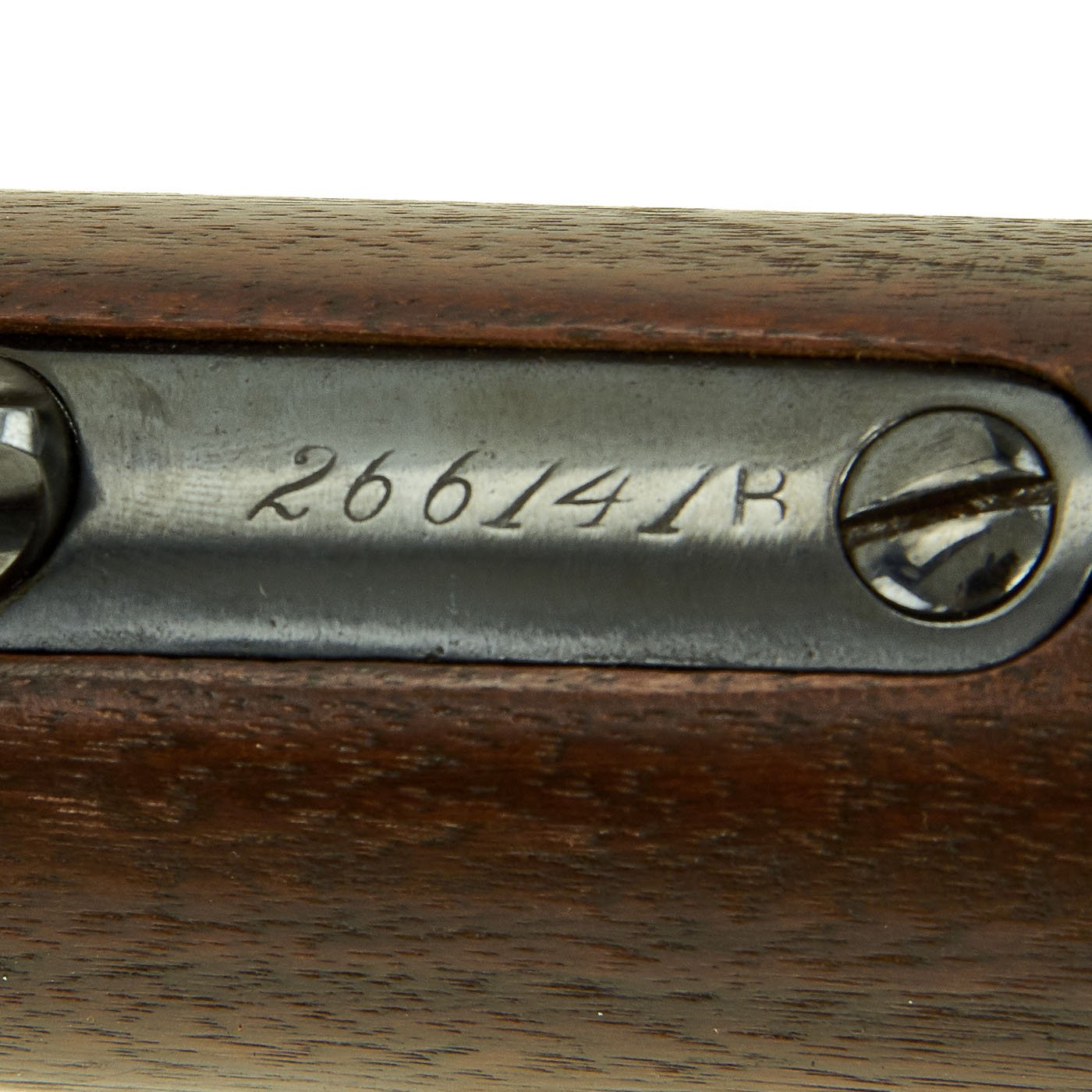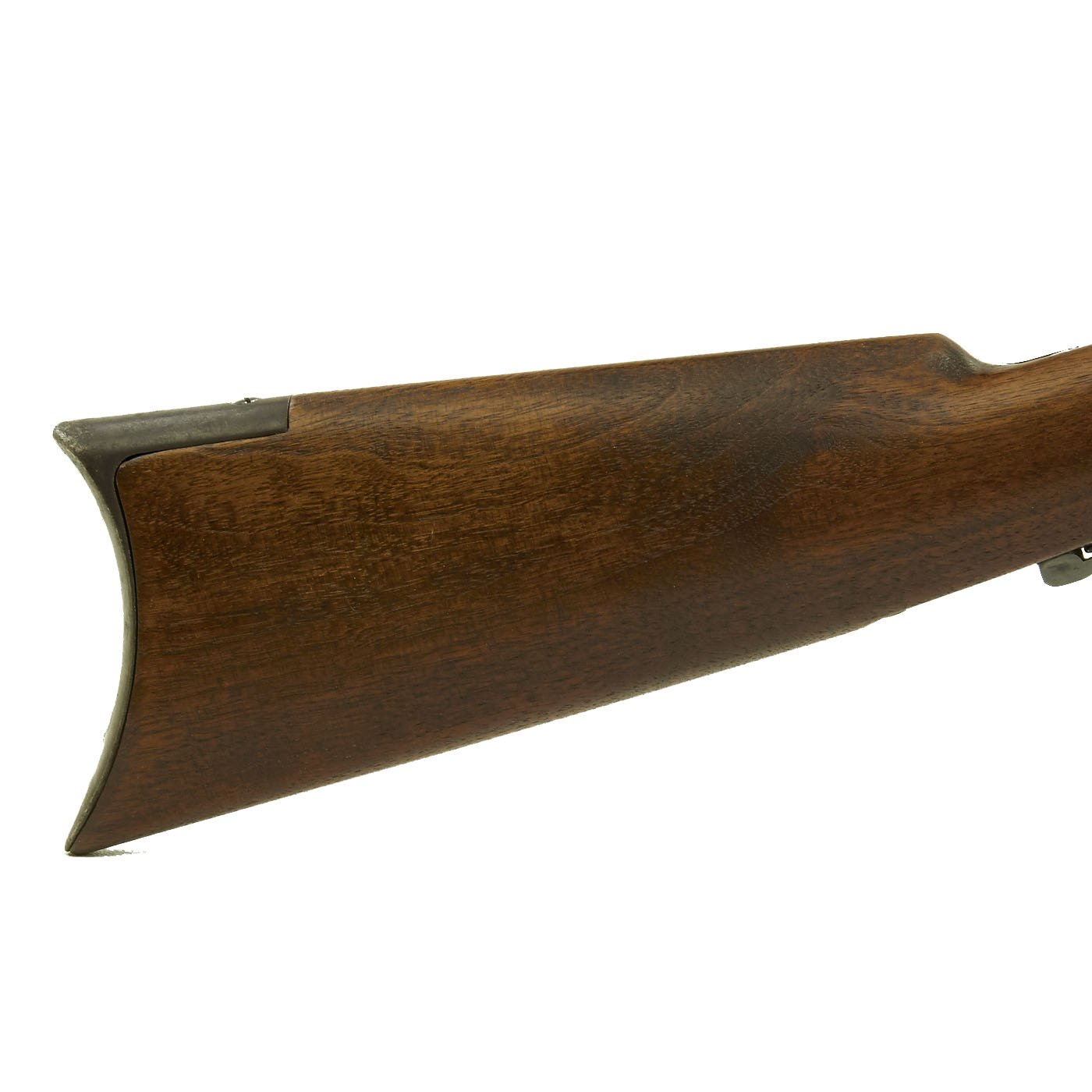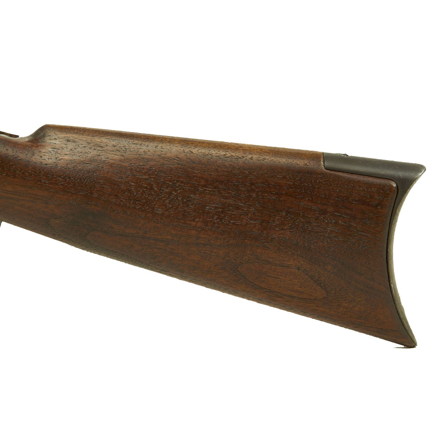 Original walnut stocks are in good solid condition, and have been redone fabulously, though the hook butt plate was not redone at this time, and has a lovely worn patina. It does not have a storage compartment, which were sometimes omitted on the .32-20 rifles.