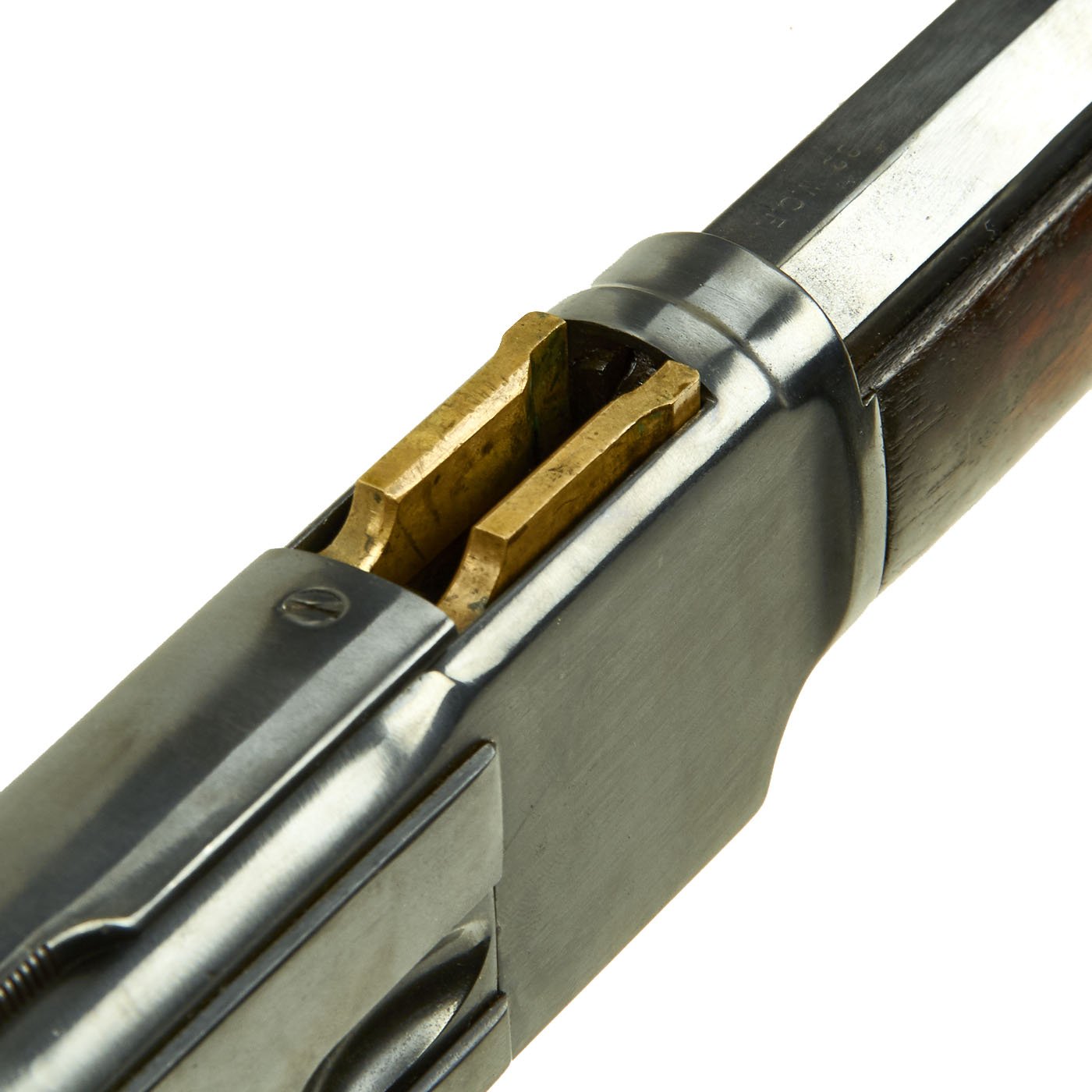 The barrel is still marked .32 W.C.F. over the barrel chamber, indicating the .32-20 caliber. This marking often wears off, as does the .32 CAL. marking on the bottom of the brass feed block, which is still partly visible as well.
