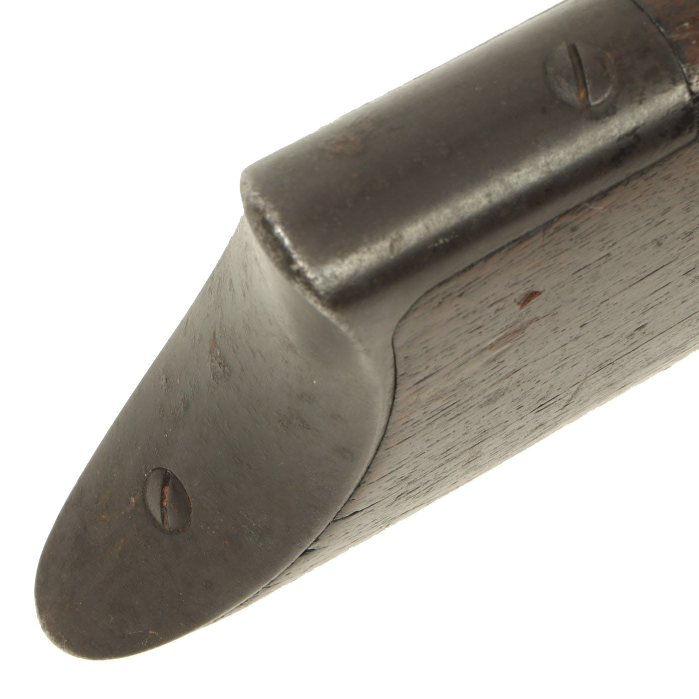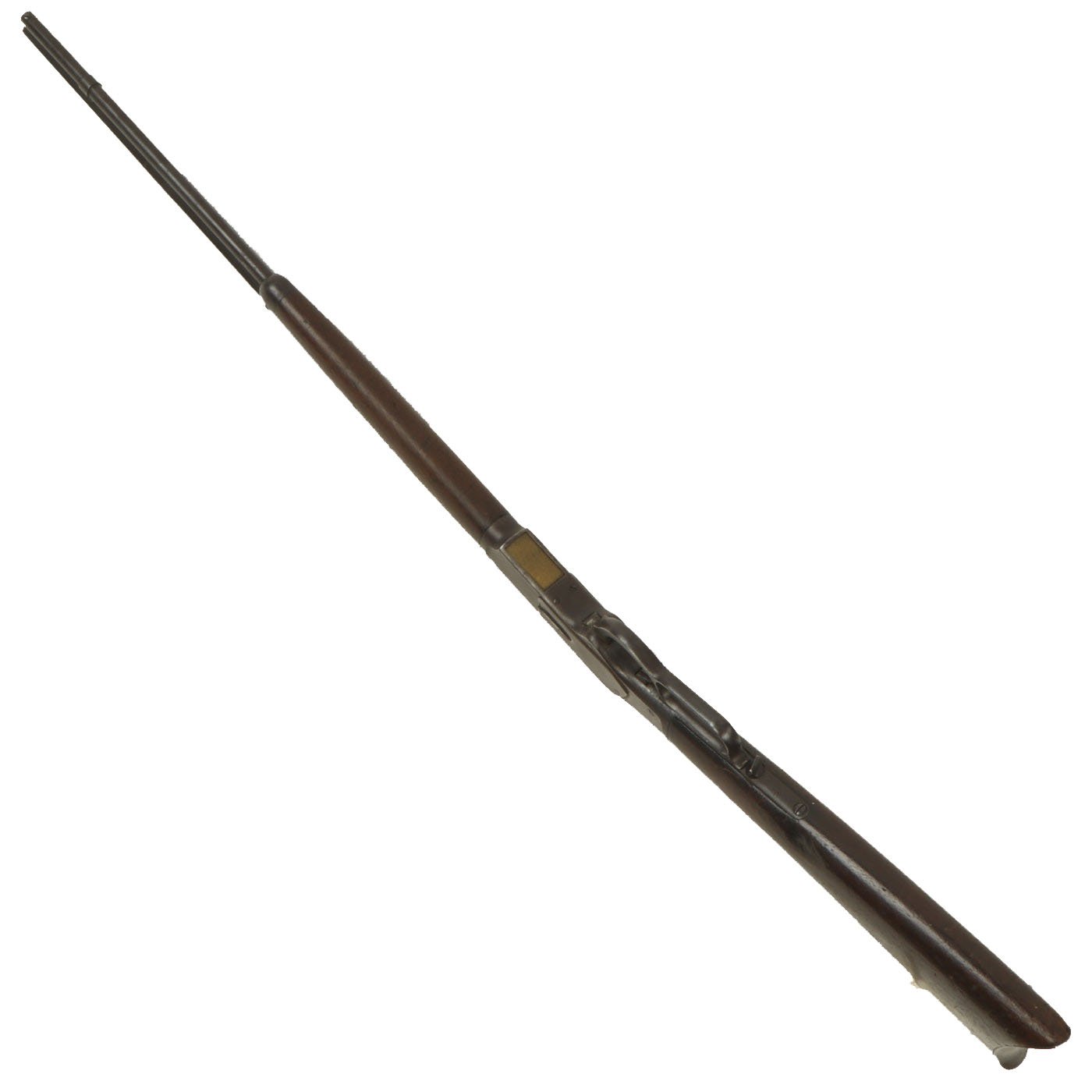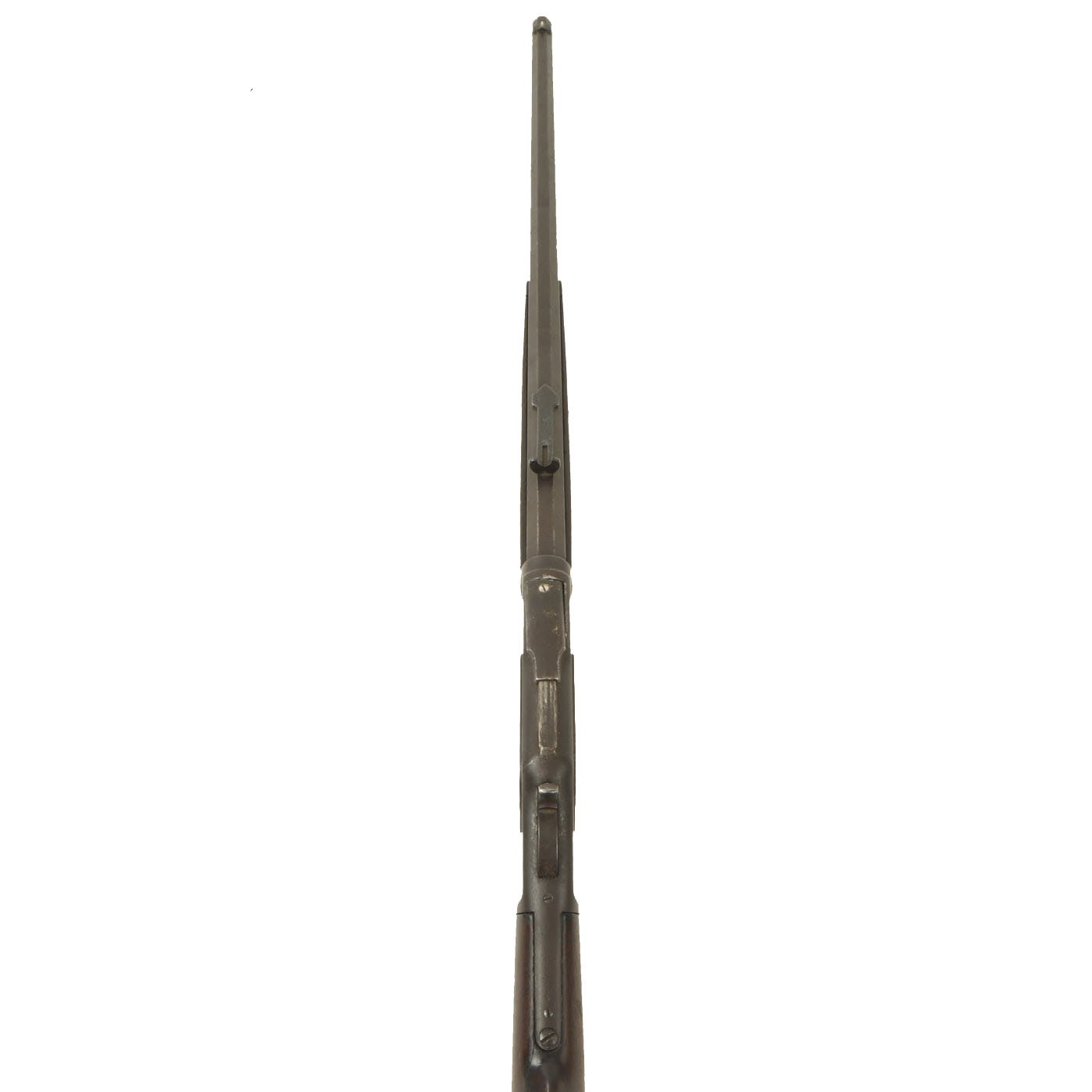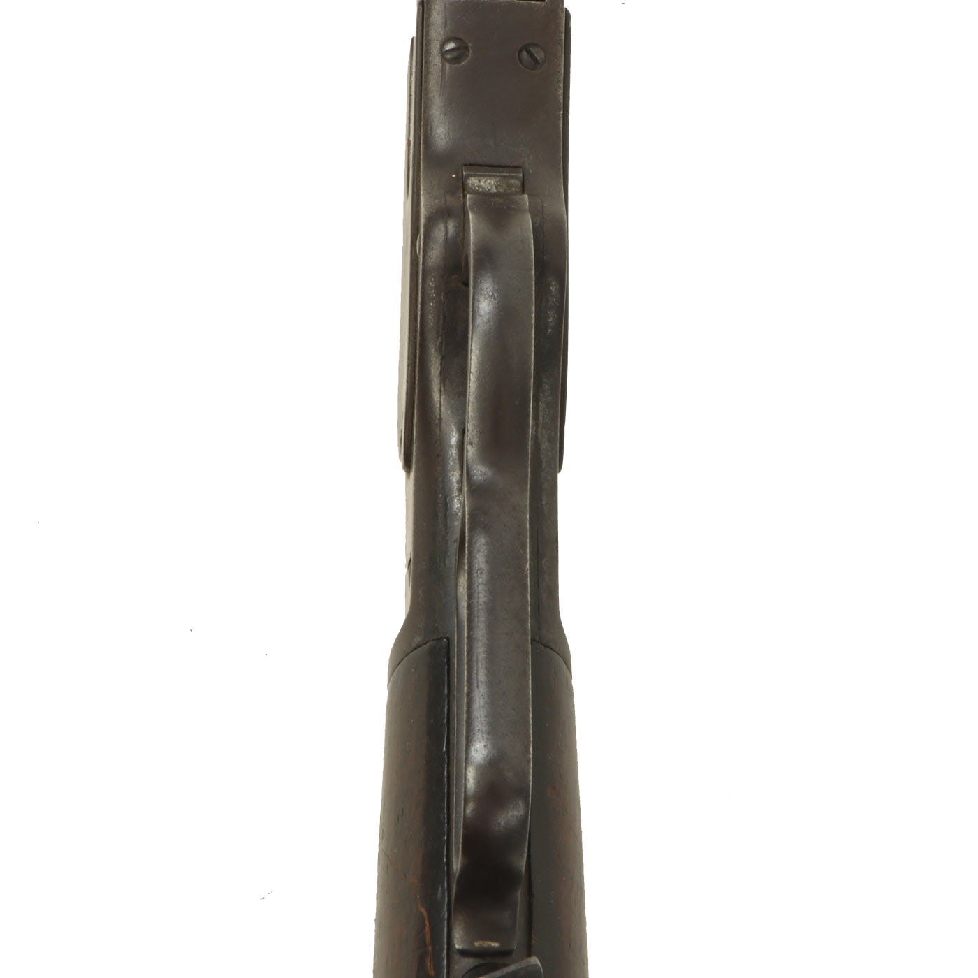 The bore still shows rifling, however there is also wear, and what look to possibly be rings or heavier oxidation in one place in the bore. It also has overall fouling that we were not able to remove. The action is in fully functional condition with the original dust cover, and cycles well. The metal work is a nice lightly worn blue, with some light peppering in places.