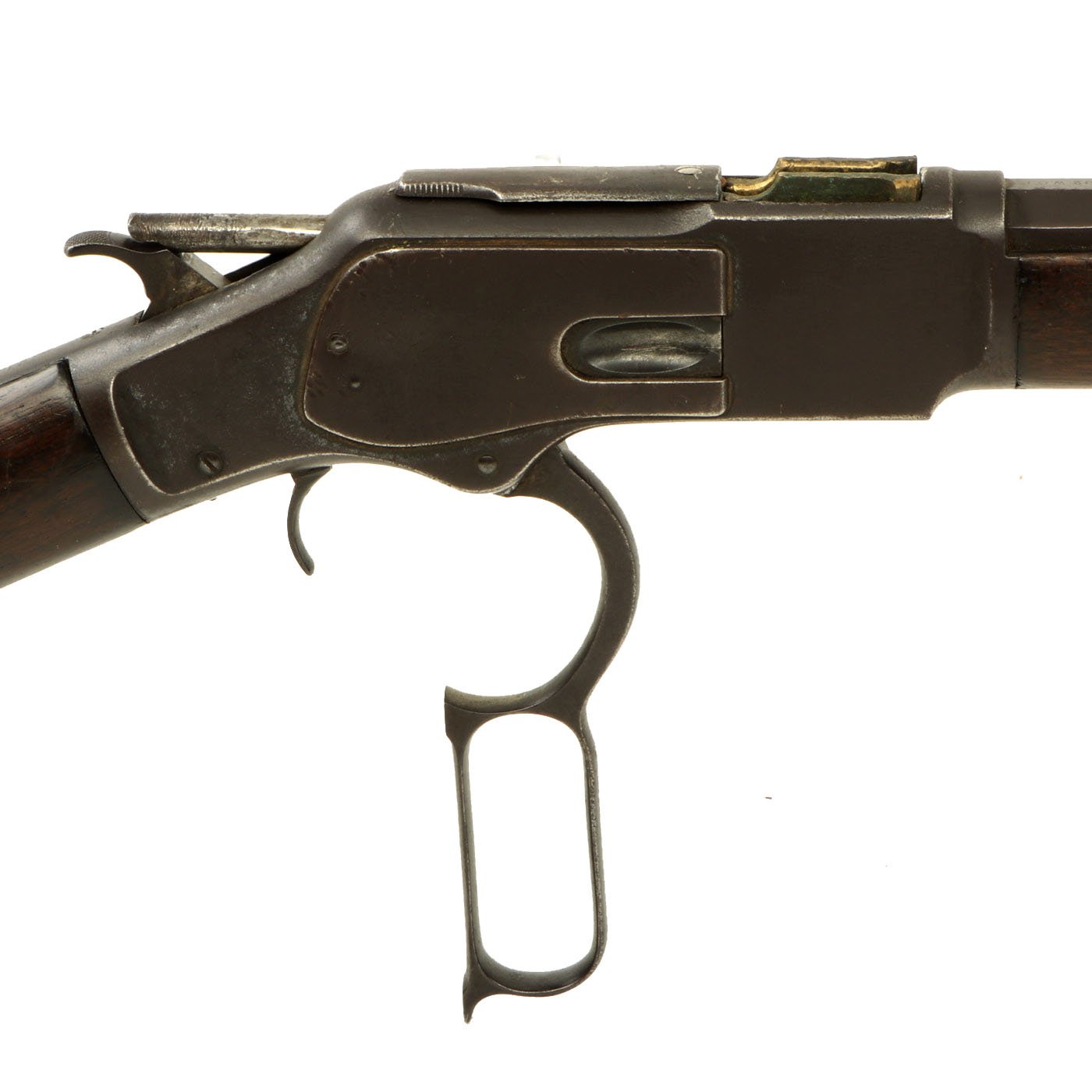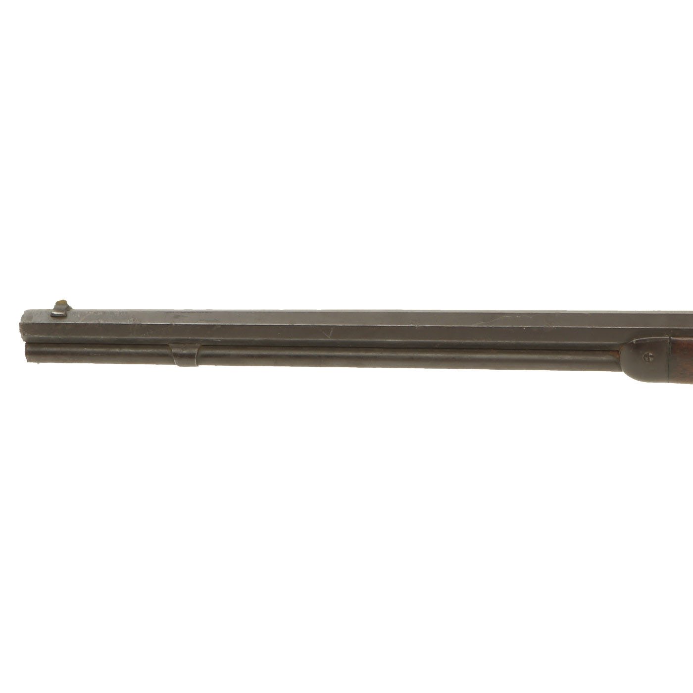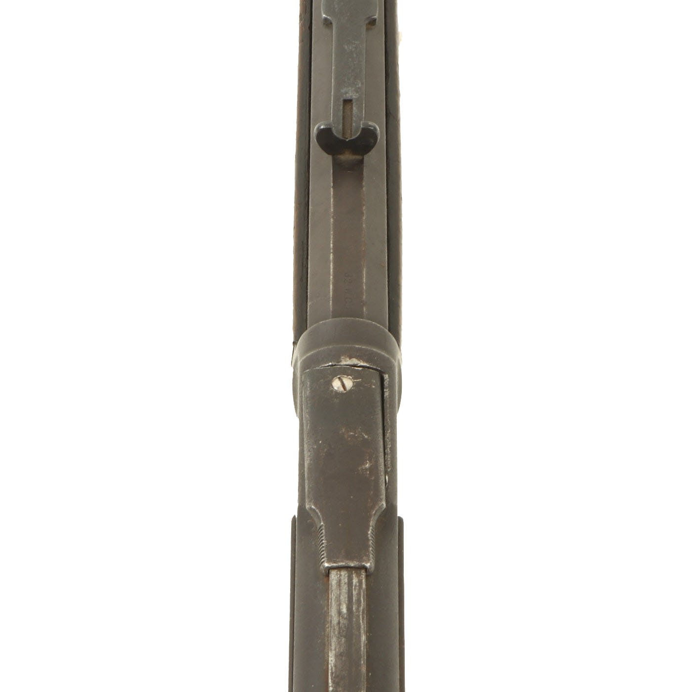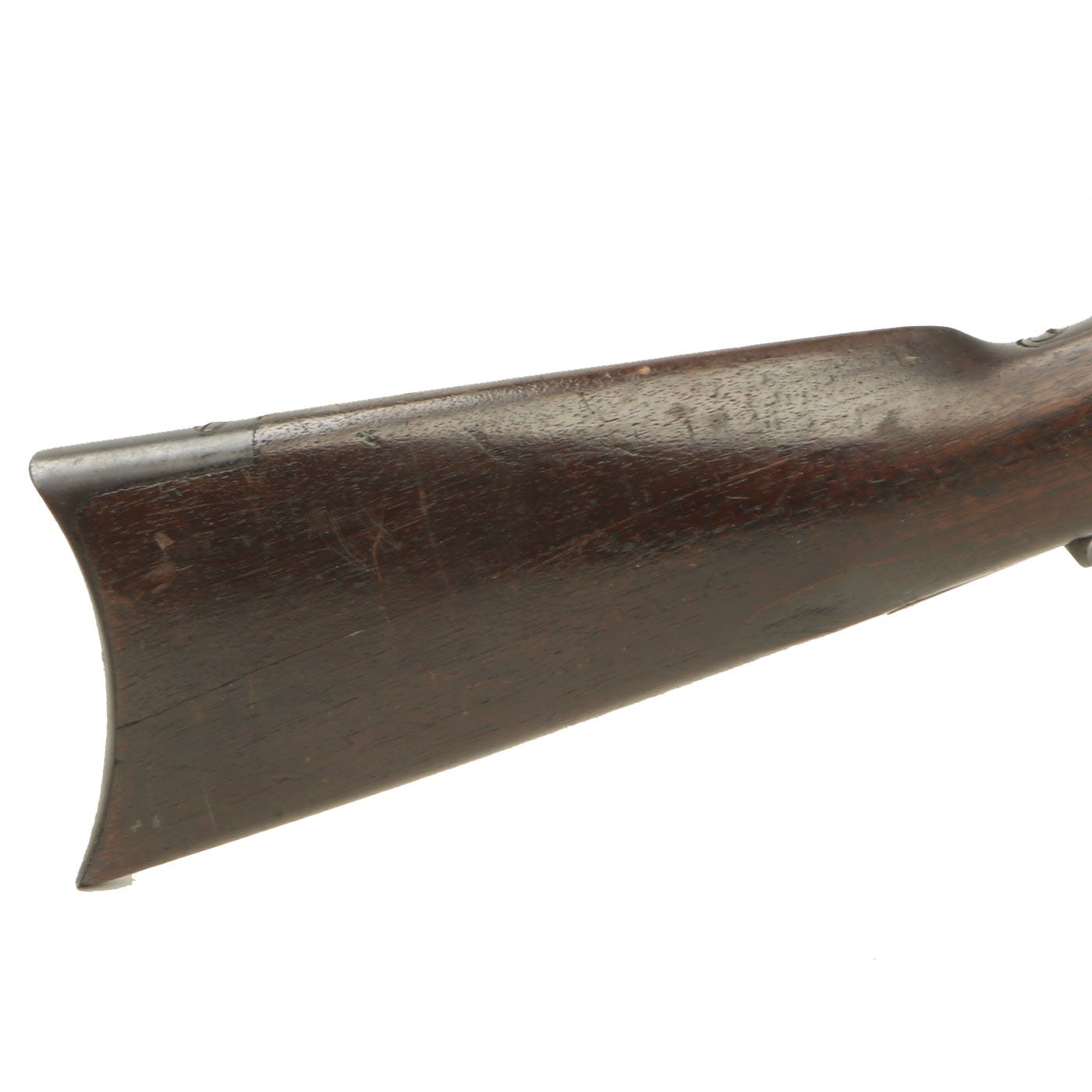 It is also clearly marked 32 W.C.F over the barrel chamber, indicating the .32-20 caliber. This marking often wears off, as does the .32 CAL. marking on the bottom of the brass feed block, however on this example it is still present. Original walnut stocks are in good solid condition with the classic dark brown color of aged oiled walnut. The fore stock is in very good condition, while the butt stock also looks very nice, but does have a crack running back from the receiver tang. Features a crescent butt plate without a storage compartment, which shows some oxidation.