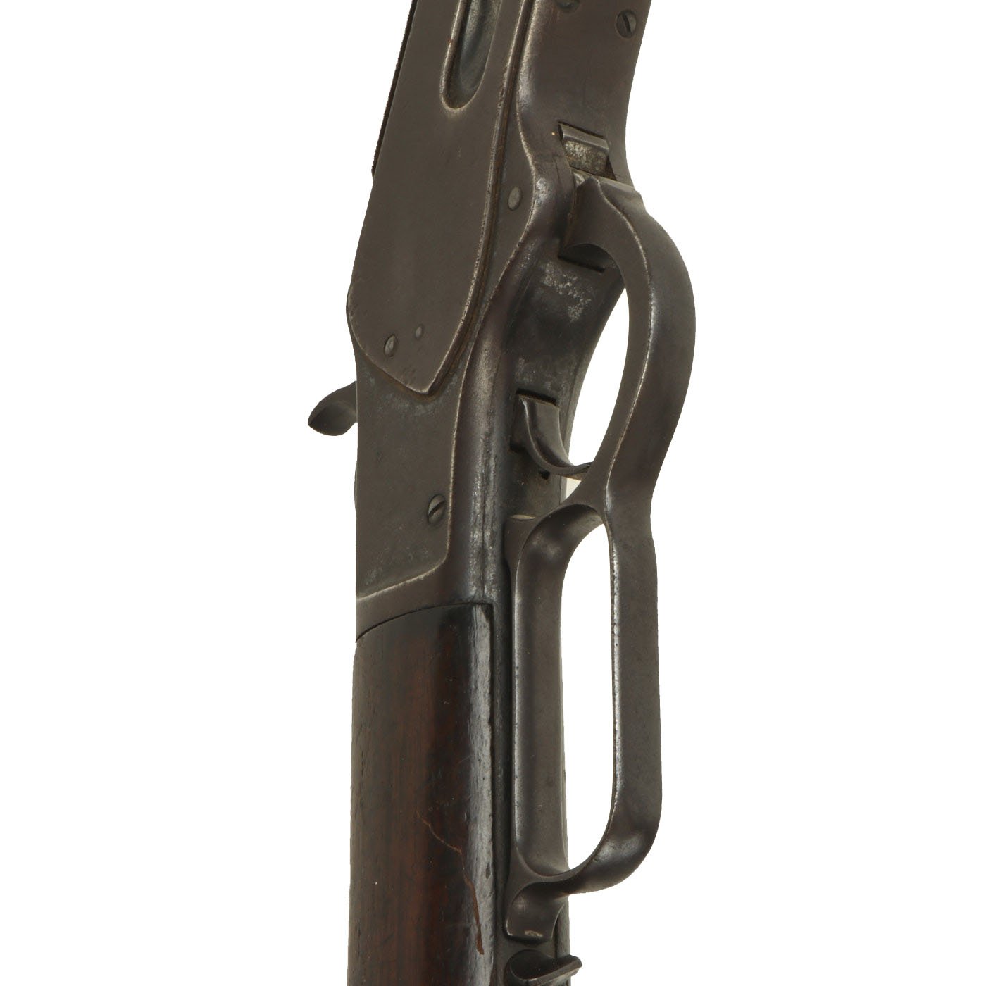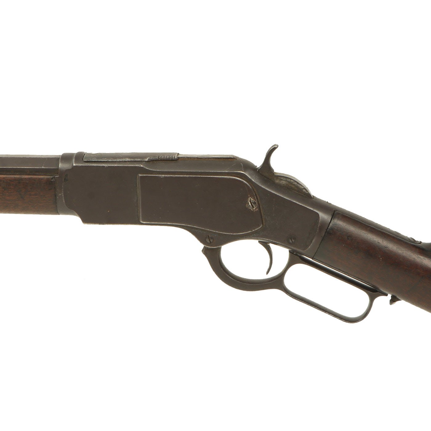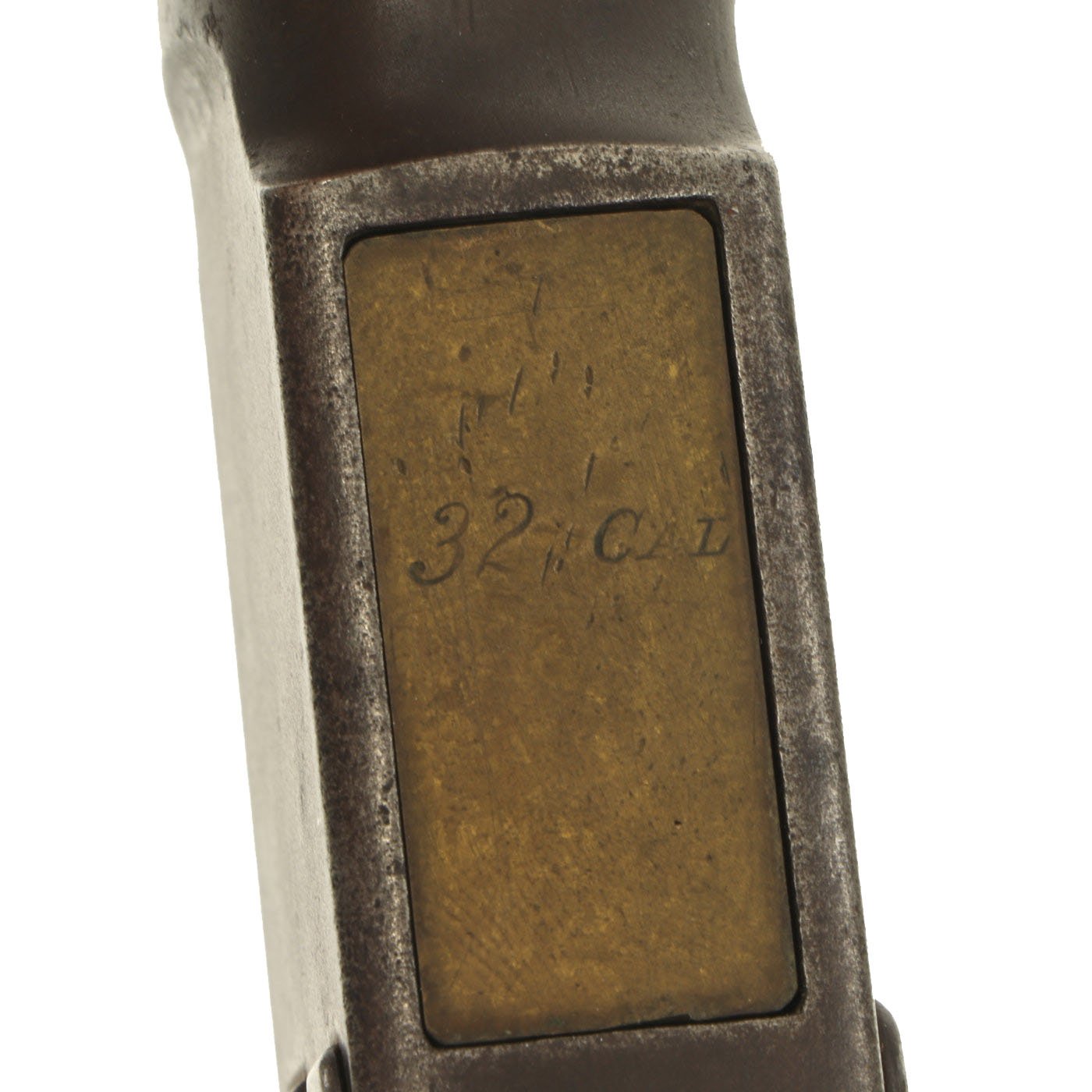It is also clearly marked 32 W.C.F over the barrel chamber, indicating the .32-20 caliber. This marking often wears off, as does the .32 CAL. marking on the bottom of the brass feed block, however on this example it is still present. Original walnut stocks are in good solid condition with the classic dark brown color of aged oiled walnut. The fore stock is in very good condition, while the butt stock also looks very nice, but does have a crack running back from the receiver tang. Features a crescent butt plate without a storage compartment, which shows some oxidation.