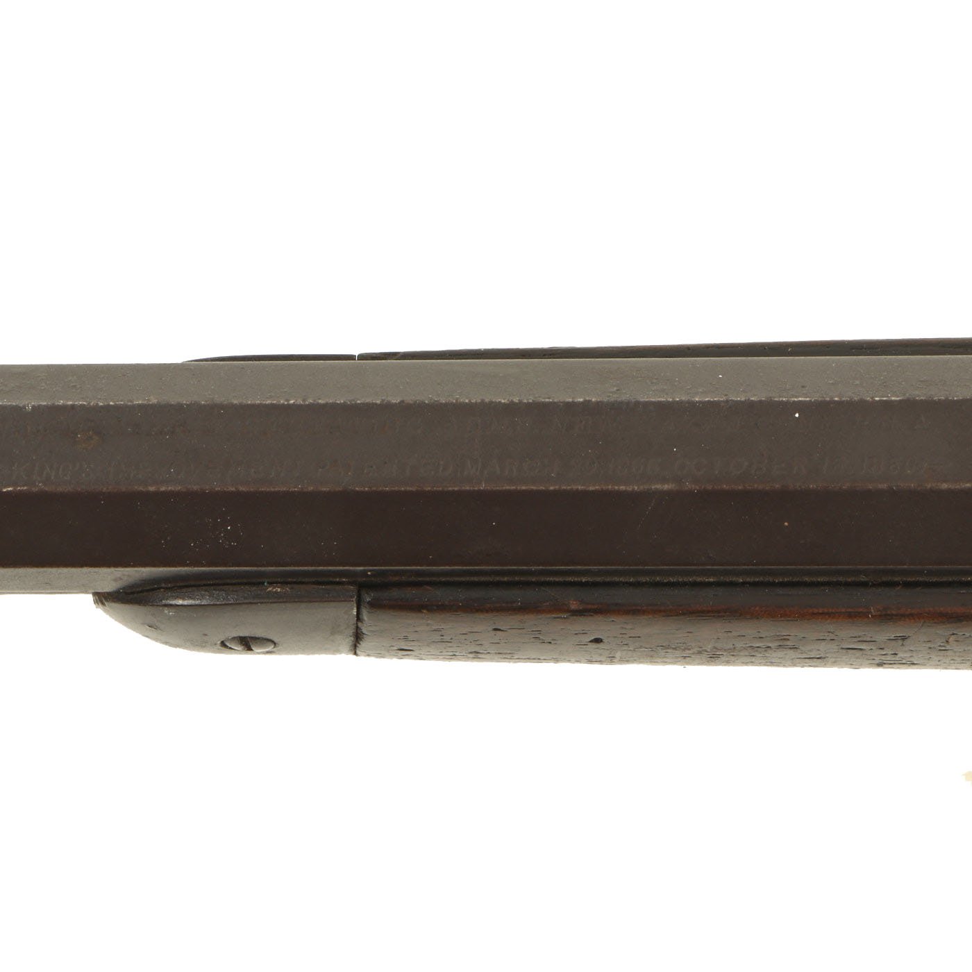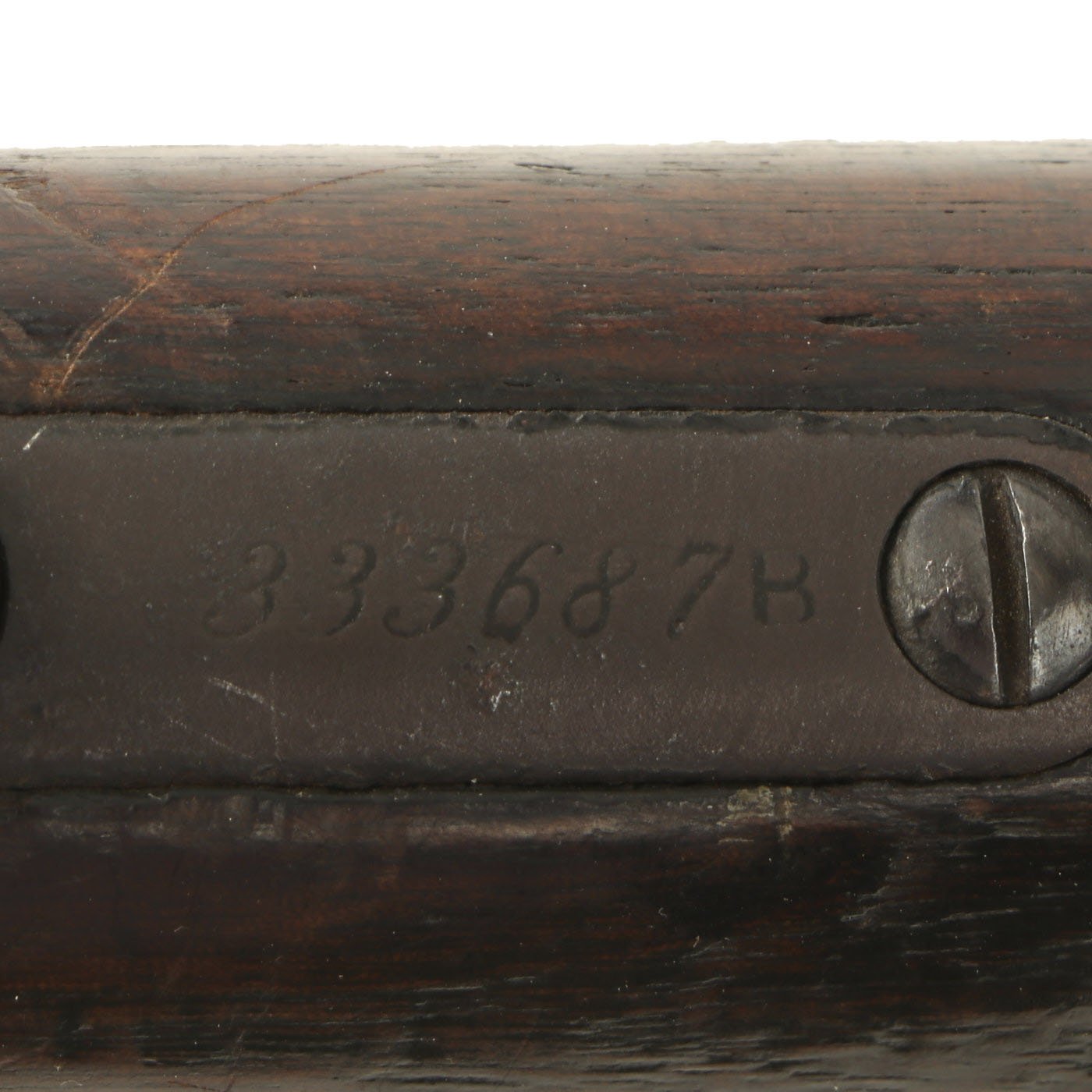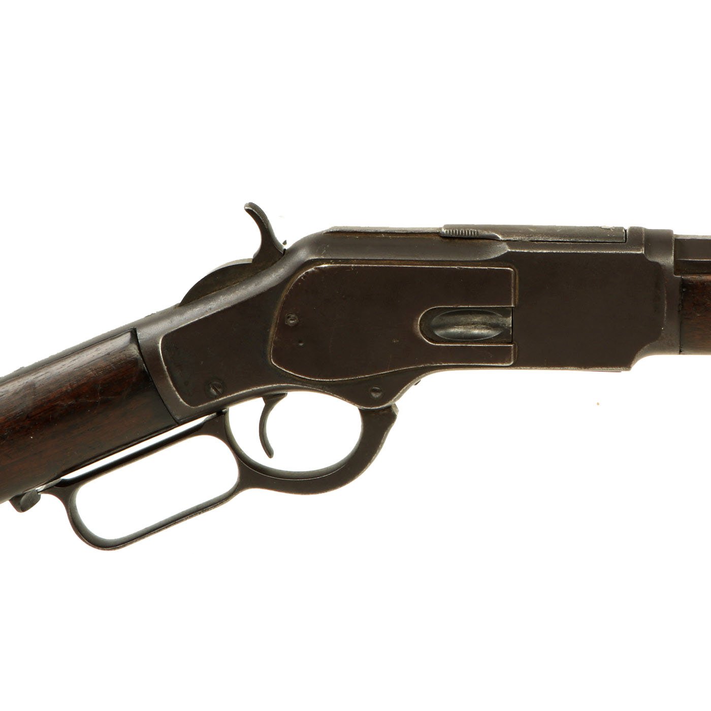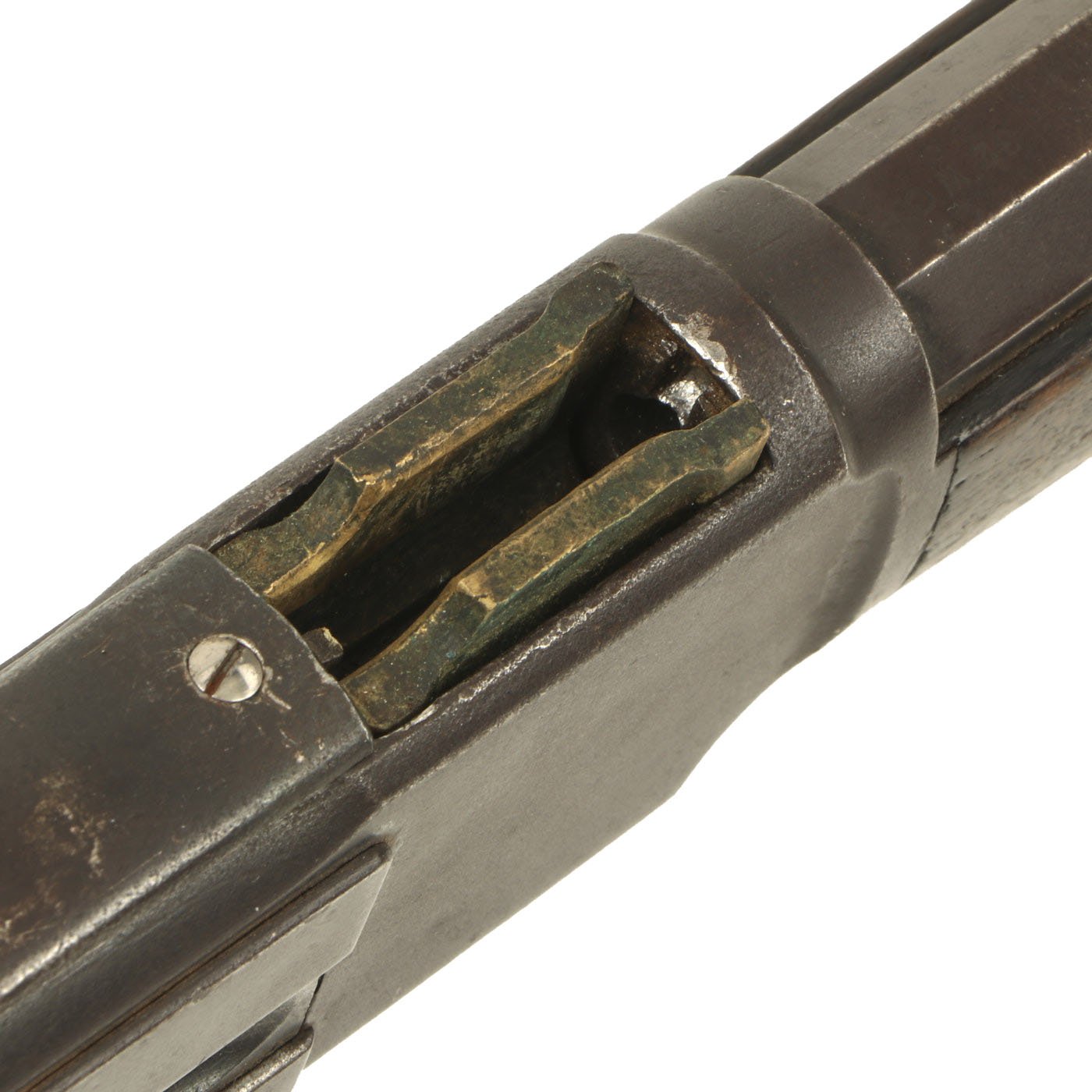 It is also clearly marked 32 W.C.F over the barrel chamber, indicating the .32-20 caliber. This marking often wears off, as does the .32 CAL. marking on the bottom of the brass feed block, however on this example it is still present. Original walnut stocks are in good solid condition with the classic dark brown color of aged oiled walnut. The fore stock is in very good condition, while the butt stock also looks very nice, but does have a crack running back from the receiver tang. Features a crescent butt plate without a storage compartment, which shows some oxidation.