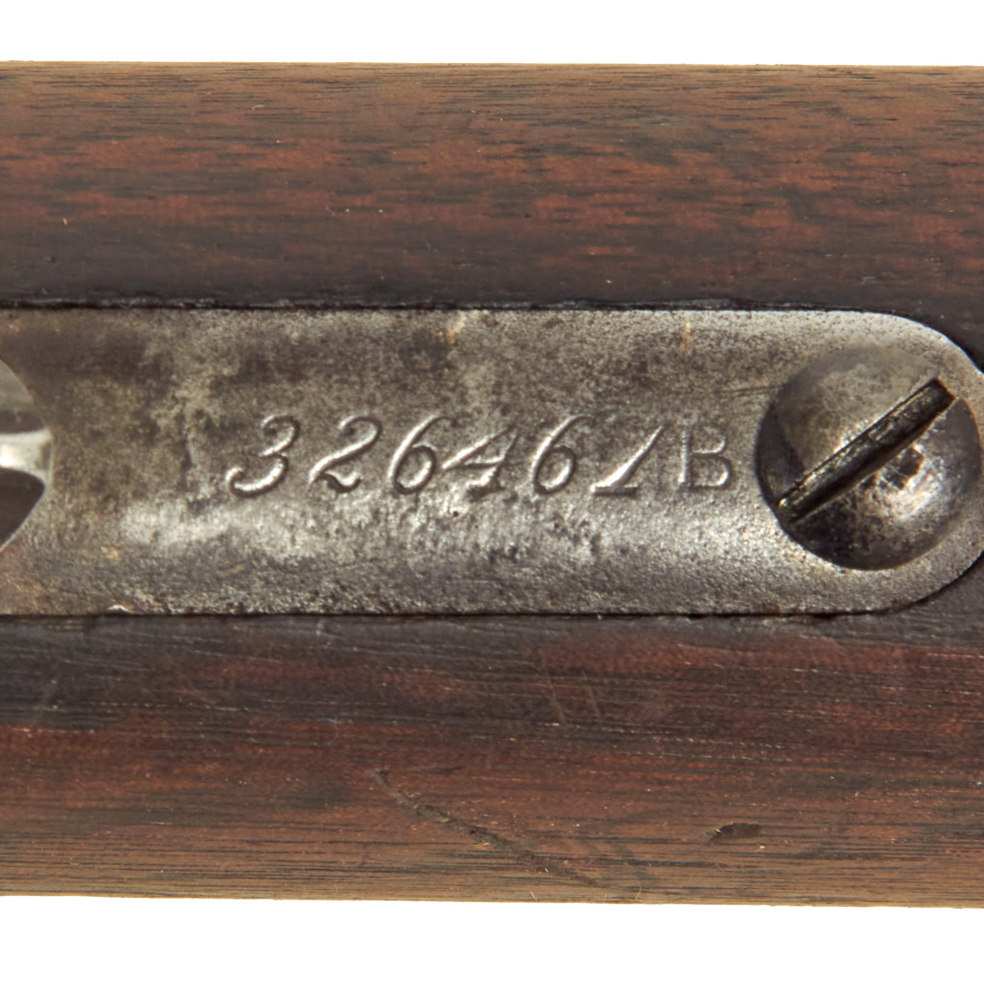 Condition of the rifle is very good, with the metalwork showing a lot of the original blued finish in areas. These are mostly on the upper side of the rifle, while the bottom of the magazine tube, barrel, and grip area show some wear and patination. There is also some scattered peppering on the receiver, barrel, and magazine tube. The wood stocks are in very good condition, showing the lovely red brown color of aged oiled walnut. The stocks show light wear consistent with use, but no major damage, cracking, or chunks missing. Really some nice wood on this example. The butt stock has the correct crescent butt plate, which has a working storage compartment (empty).