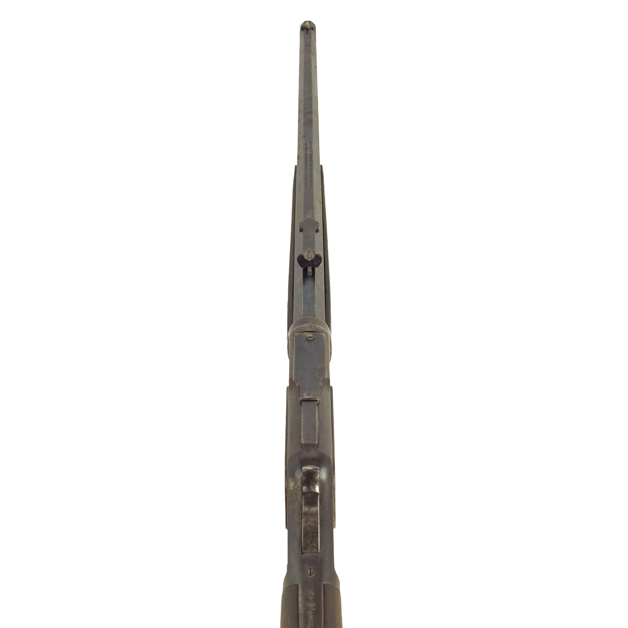 This lever action repeater has a crisp tight action in fully functional condition with an original dust cover. The rifle cycles well and dry fires, with good mechanical operation that sticks just a bit. The bore is in good condition, showing clear lands and grooves, but also wear and past oxidation and fouling that has been removed. We would rate it about a 6-7 out of 10.