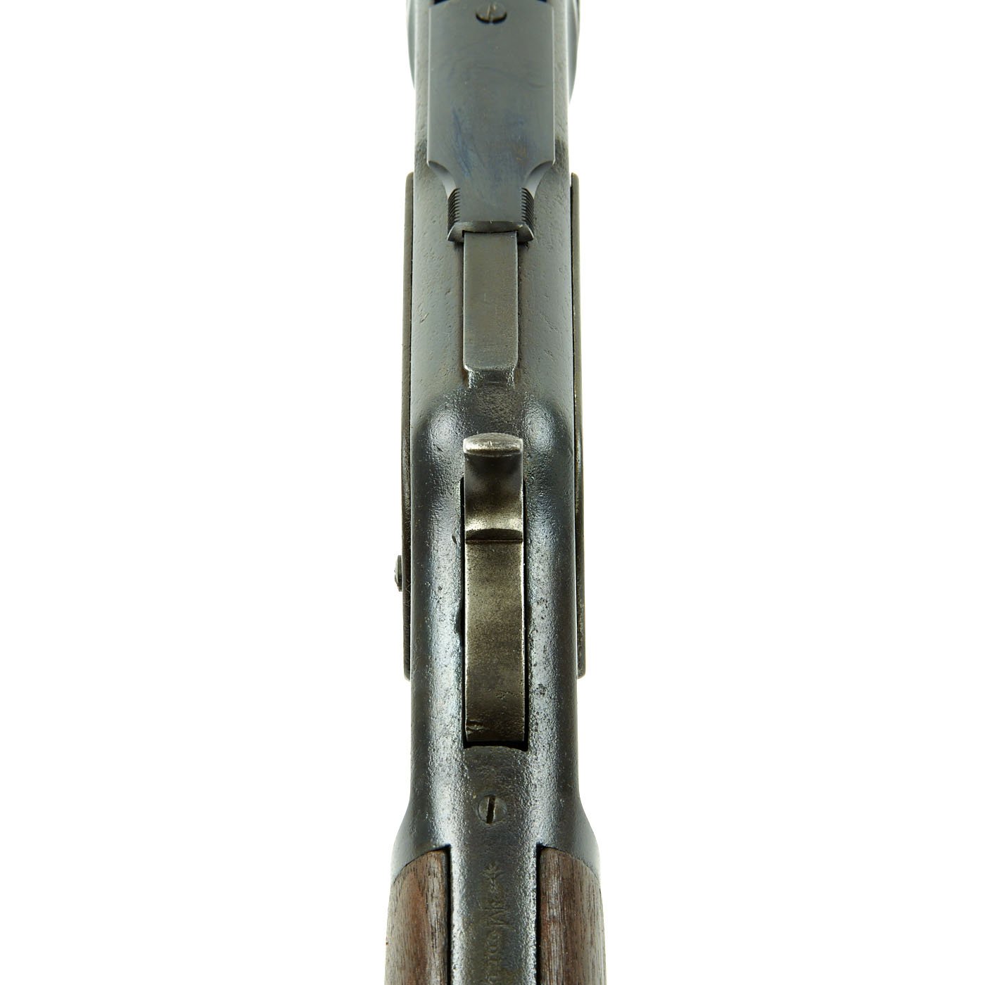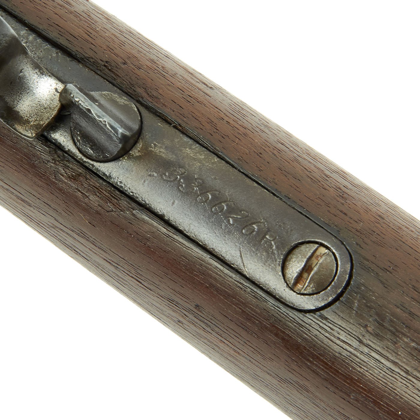 The barrel and action have a nice gray patina, with some signs of past pitting. Features a crescent butt plate, complete with a working storage compartment. The rifle is in overall very nice condition. Very crisp tight action in fully functional condition with the original dust cover. The bore is quite nice, with clear lands and grooves and a partly bright finish. There is some wear and areas of oxidation, however it still probably rates a 6-7 out of 10.