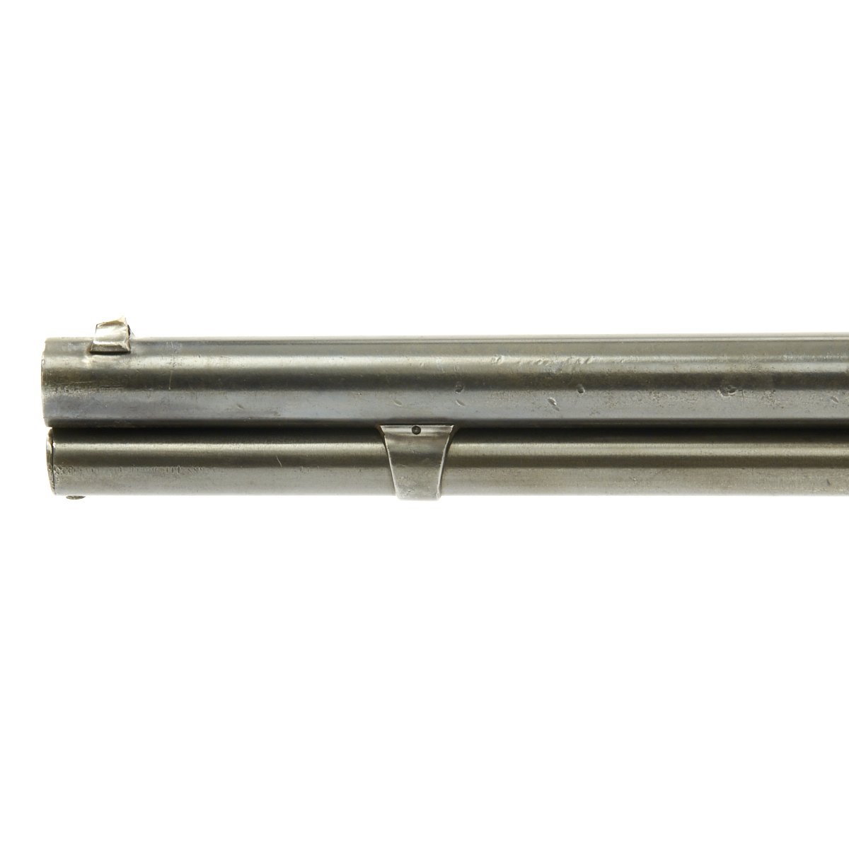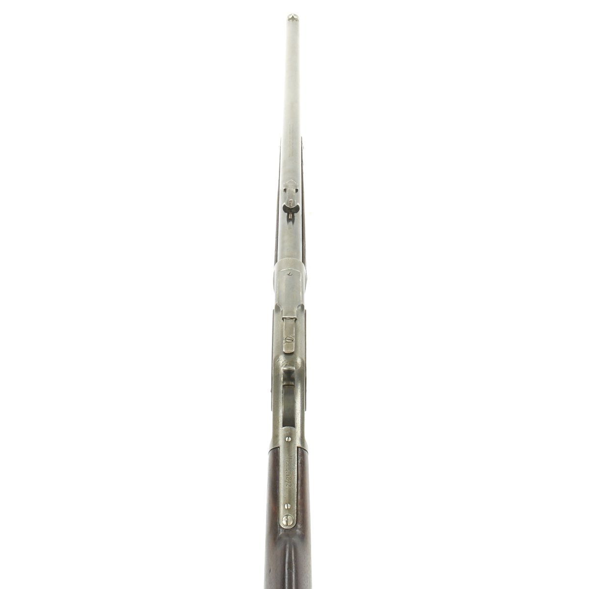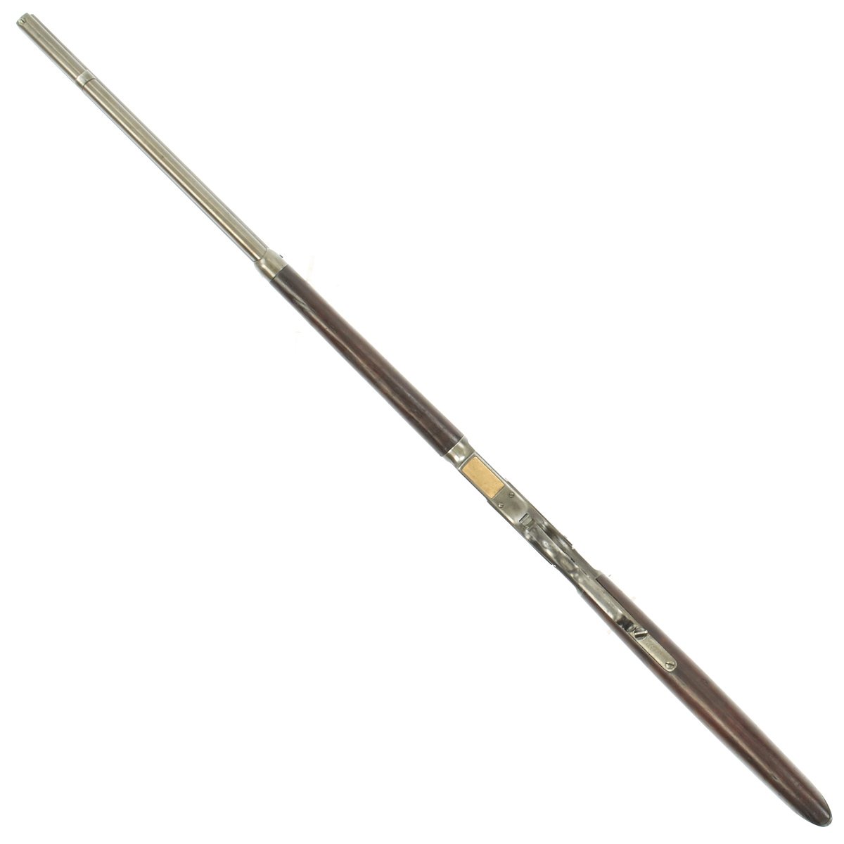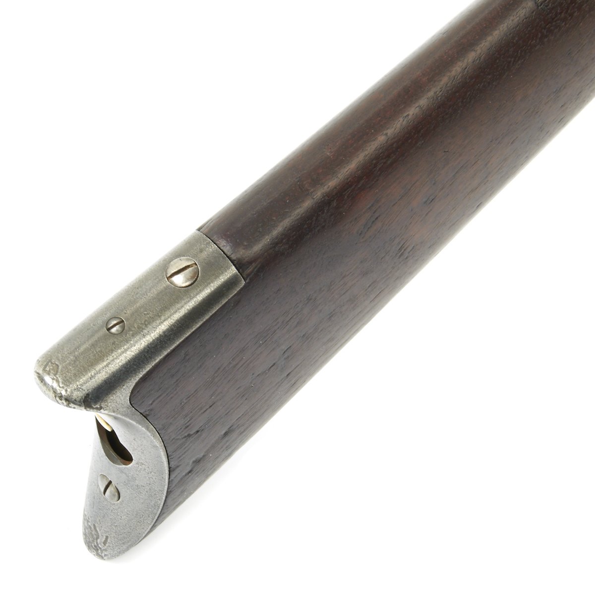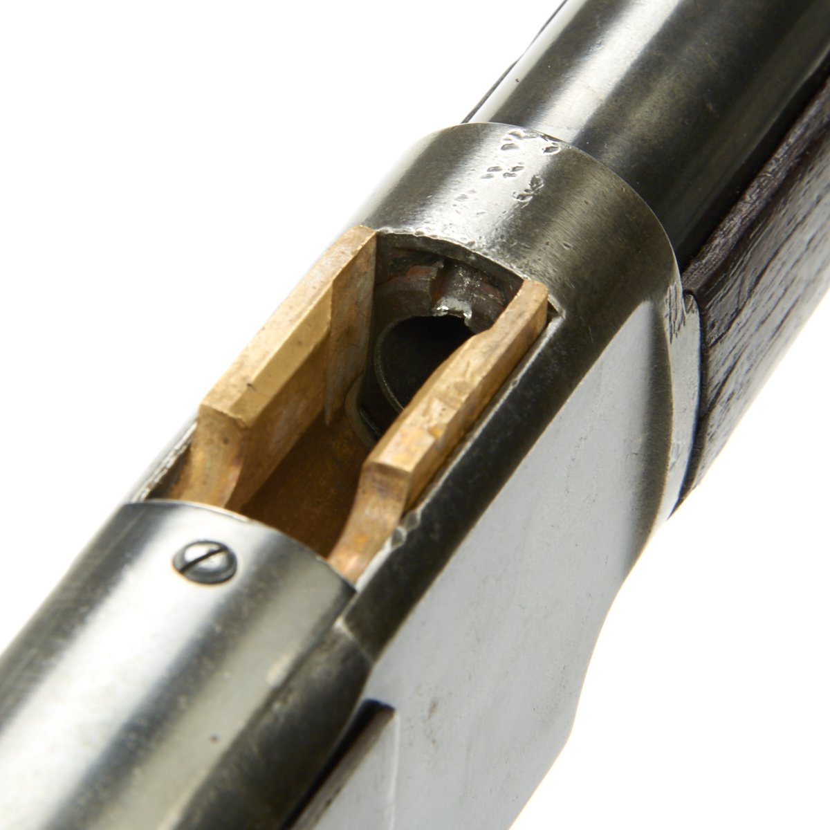 The barrel and action have a nice grayish faded blue patina, with little sign of past pitting. Features a crescent butt plate with working storage compartment. The rifle is in overall very nice condition. Very crisp tight action in fully functional condition with the original dust cover. Bore has clear lands and grooves, with a partly bright finish, showing wear and oxidation.