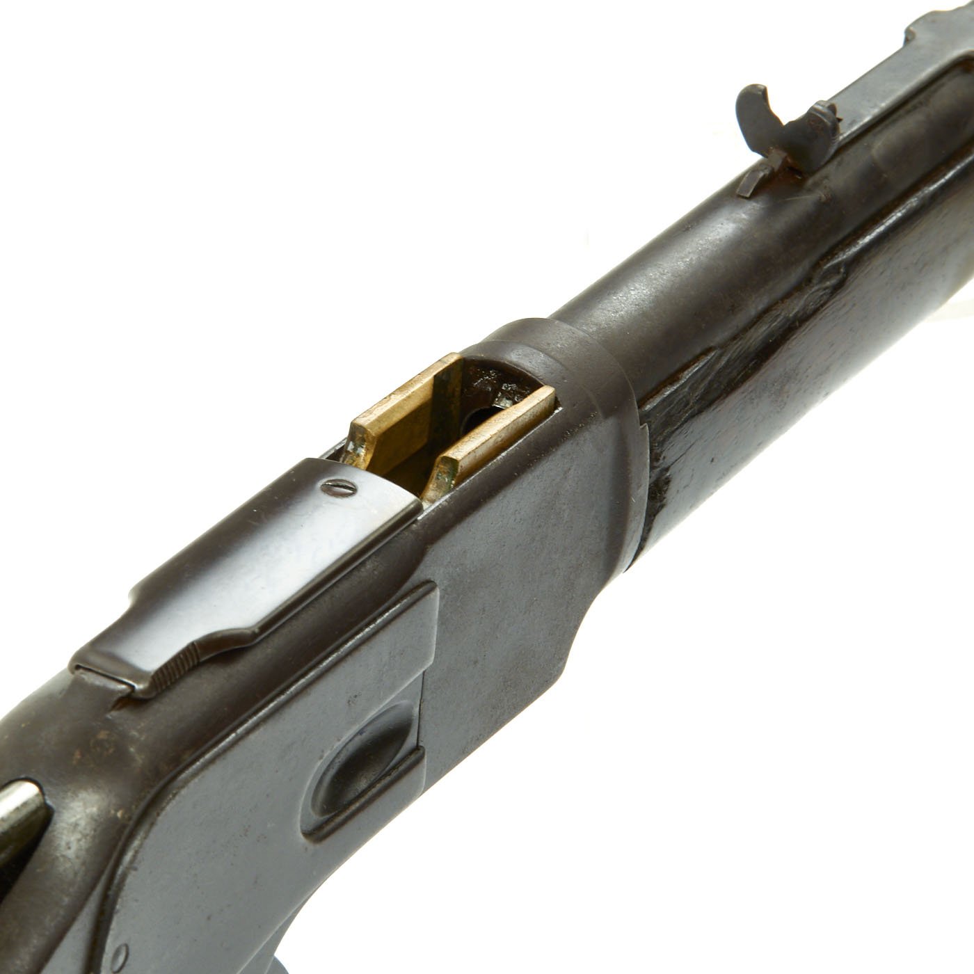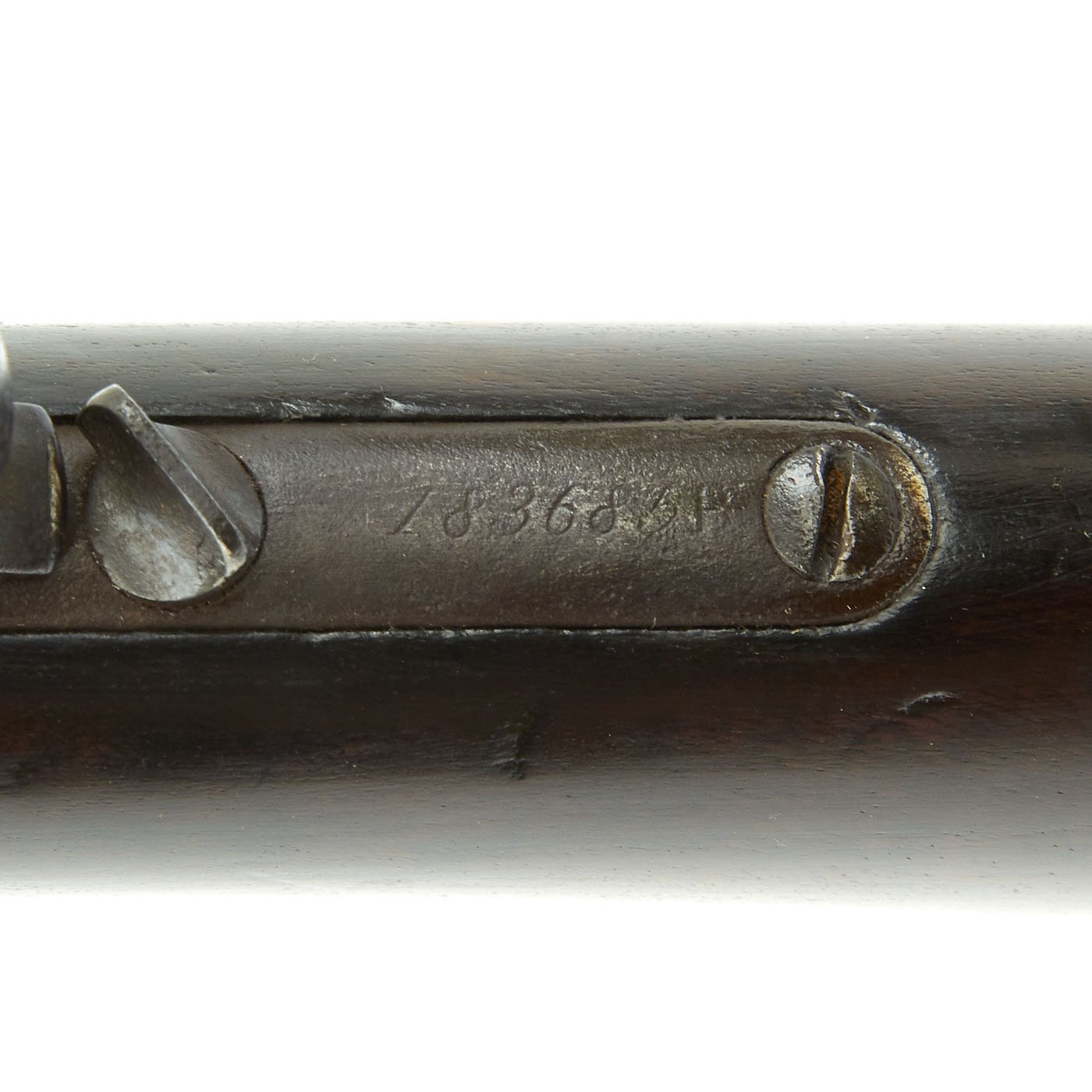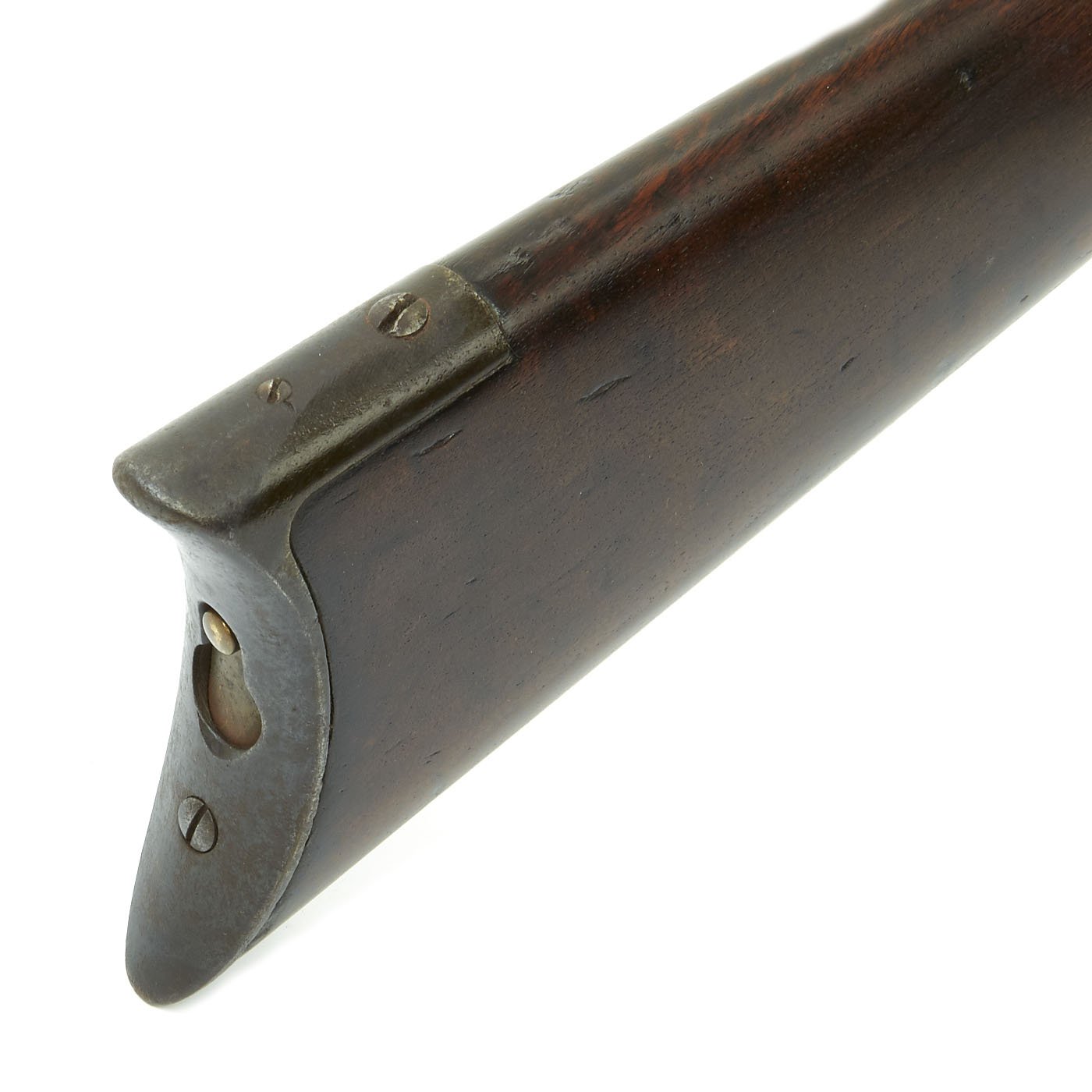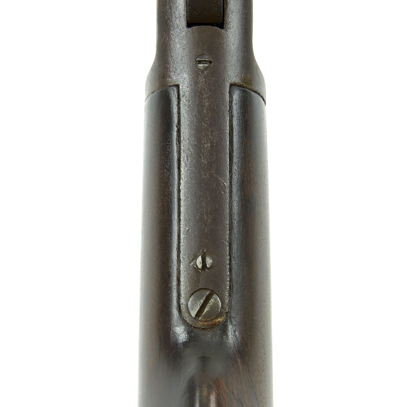 Stocks are in good condition, but do show typical wear, with the expected dings and issues from long service. There is a repaired crack on the underside of the fore stock, and it has been sanded down a bit in that area, probably to remove finger wear. The butt stock is in great shape.