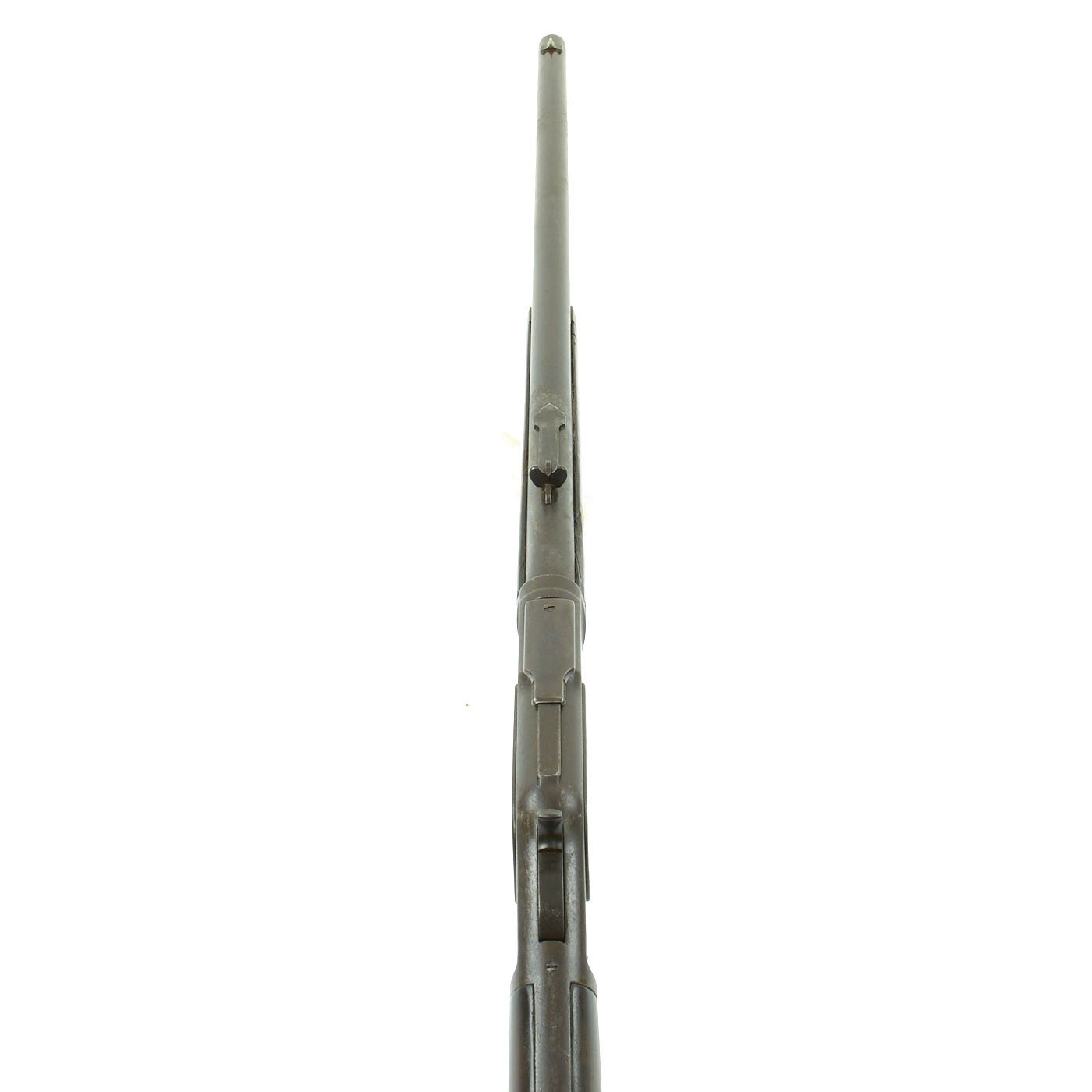 The barrel and action have a nice gray patina, with some signs of past pitting. Features a crescent butt plate, complete with a working storage compartment. The rifle is in overall very nice condition. Very crisp tight action in fully functional condition with the original dust cover. The bore is quite nice, with clear lands and grooves and a bright finish. There is some wear and a bit of oxidation in the grooves, but it probably rates an 8 out of 10.