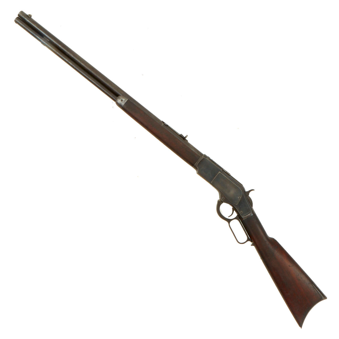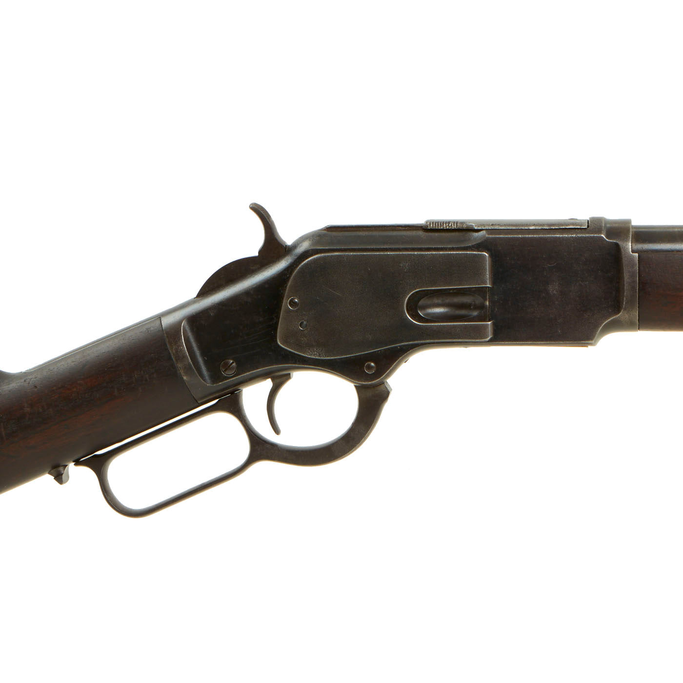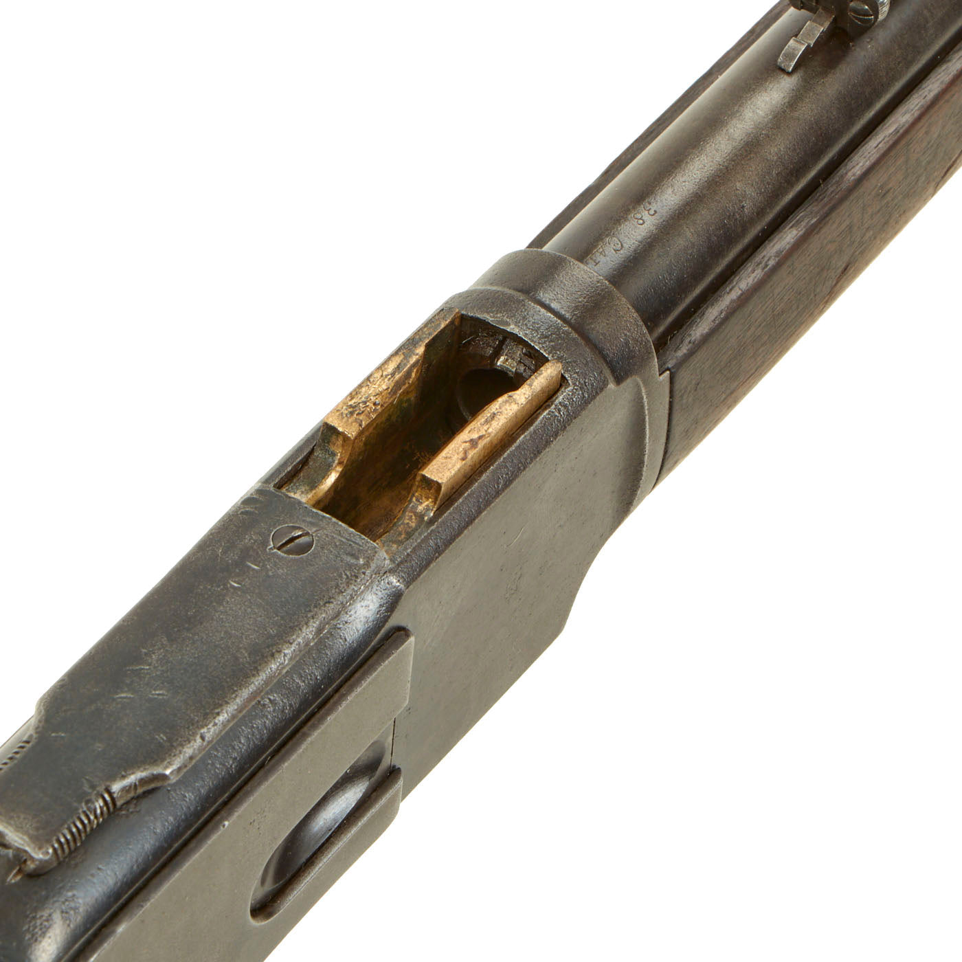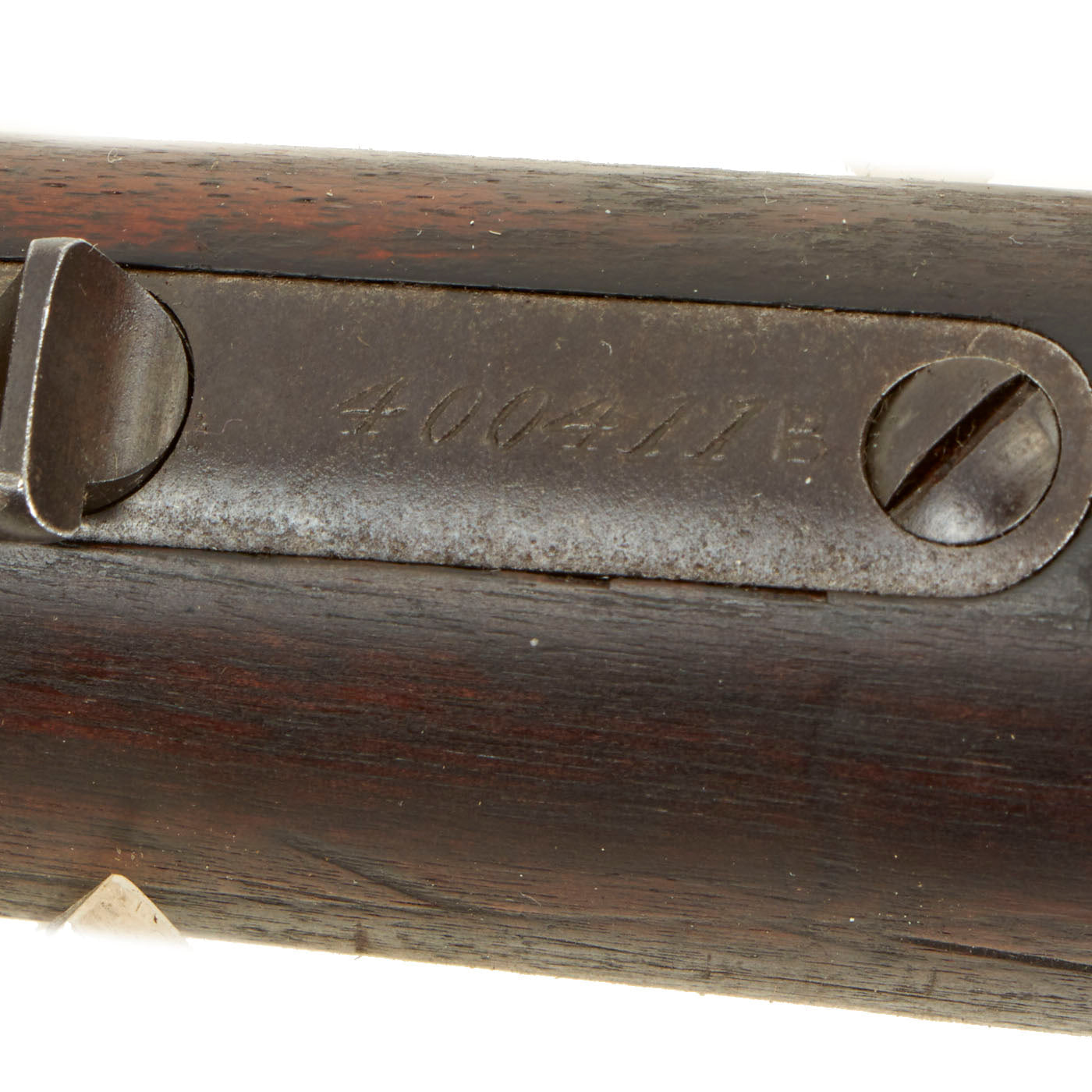 Original Item: Only One Available. "The Gun that Won the West!" This wonderful "frontier worn" rifle is in .38-40 caliber, correctly marked with .38 CAL. over the chamber and on the bottom of the brass carrier block. It features a standard 24" round barrel and full-length magazine tube. As with all examples, it is marked MODEL. 1873. on the upper receiver tang. Features the classic front sight and iconic "buckhorn" rear adjustable sight. The serial number is 400411B denoting the year of manufacture as 1891. The engraving on the top of the barrel present and fully legible: