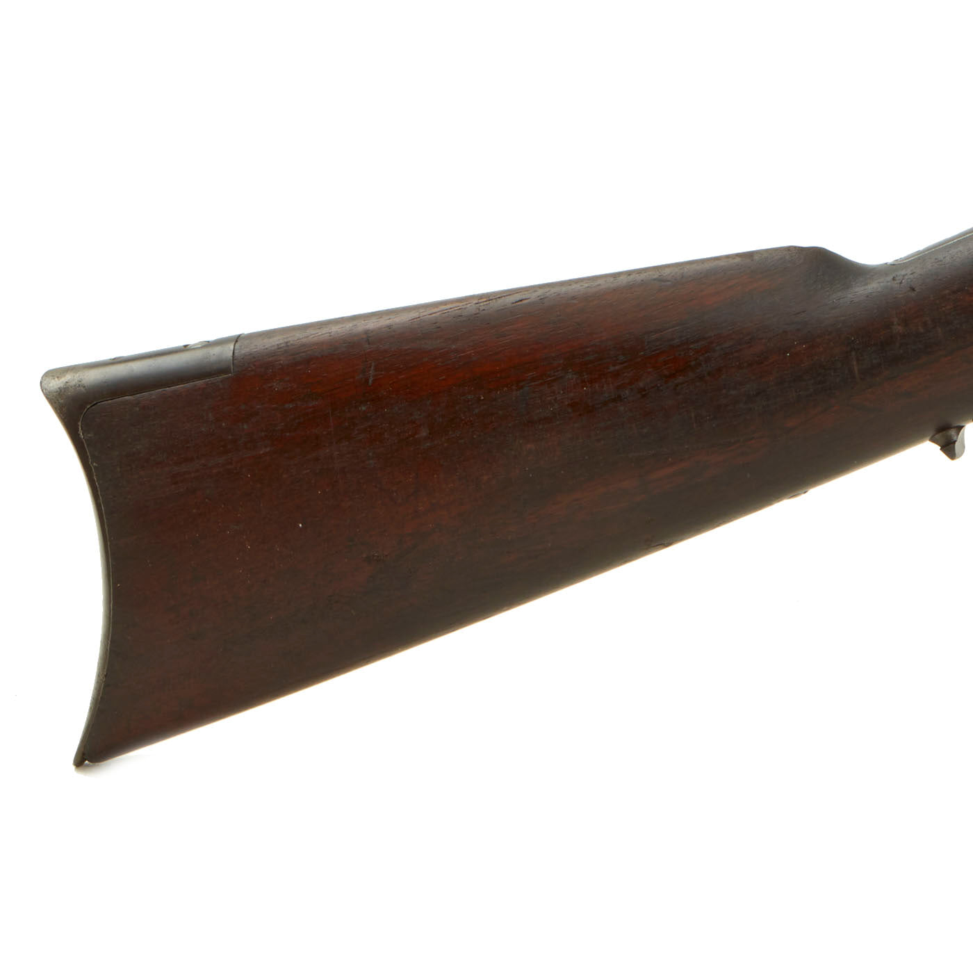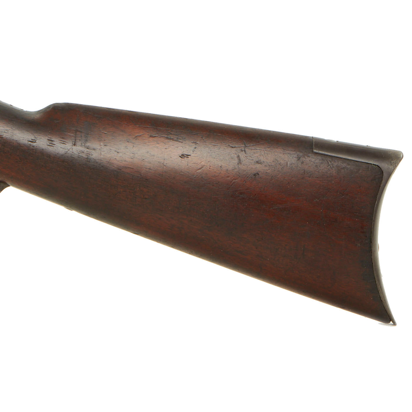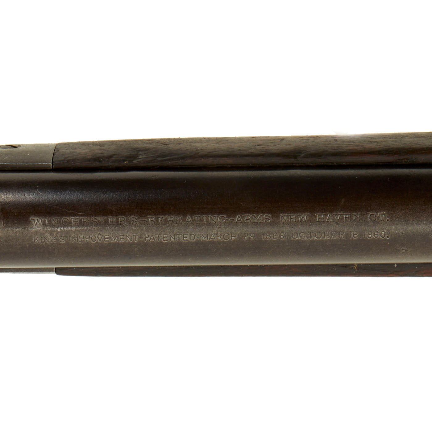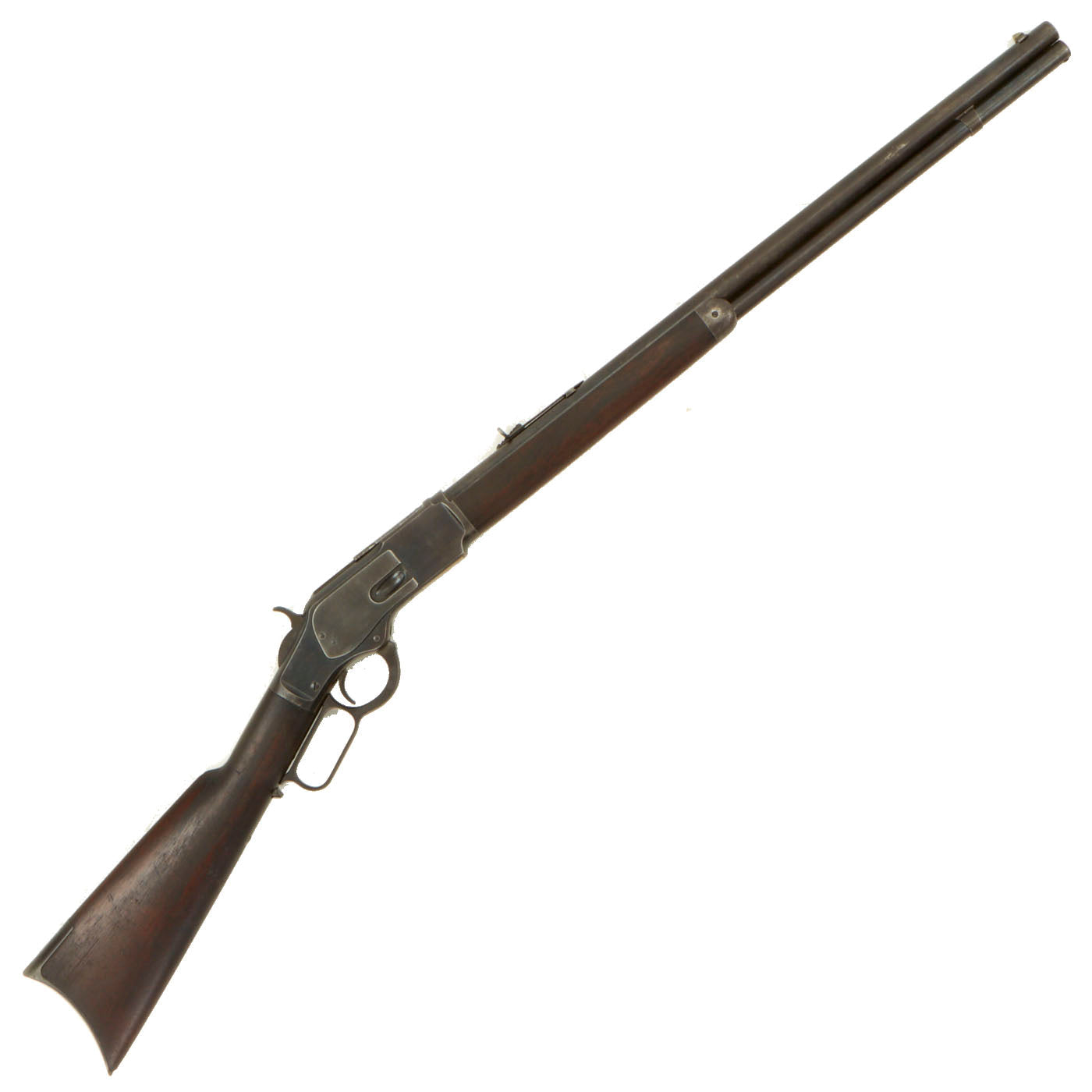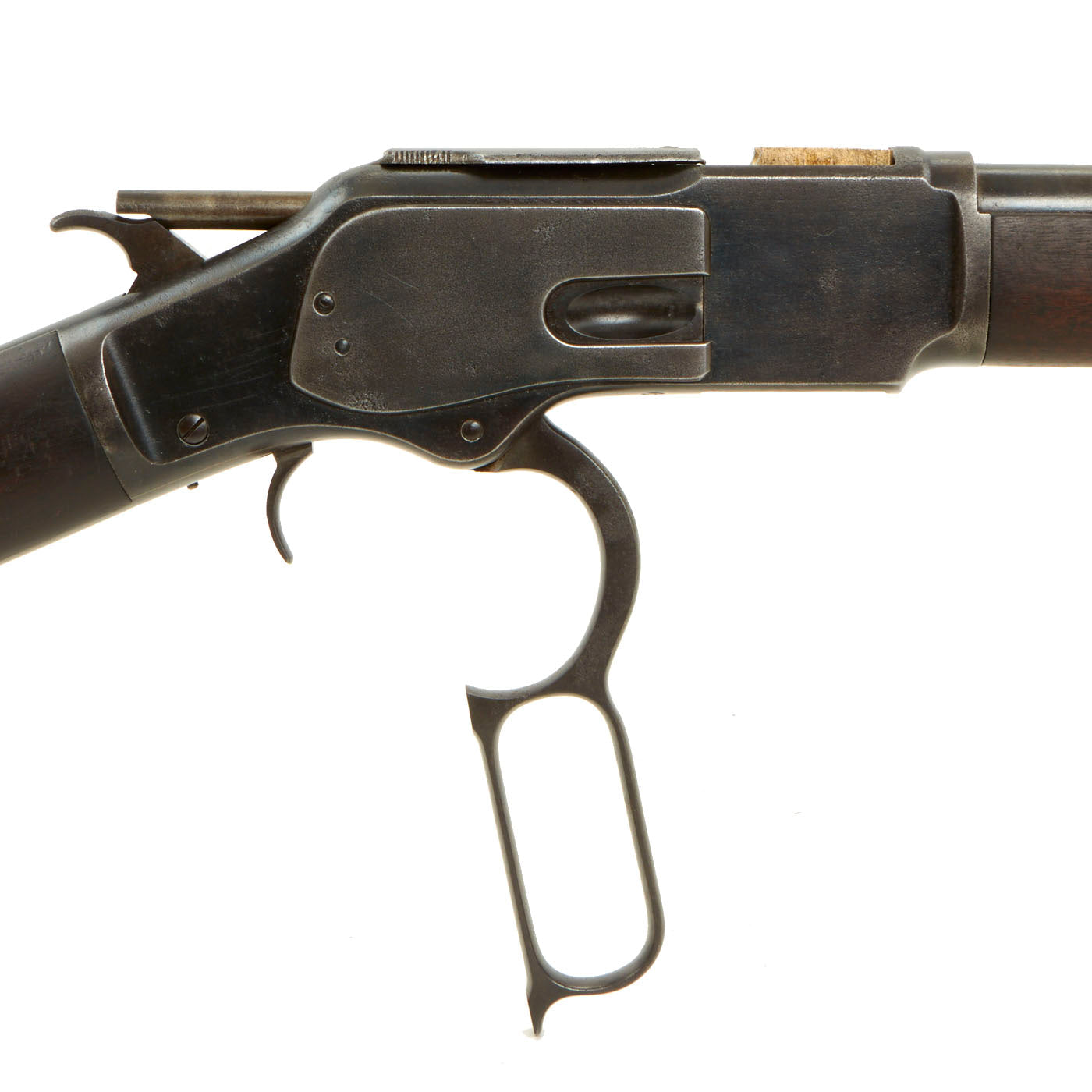Original Item: Only One Available. "The Gun that Won the West!" This wonderful "frontier worn" rifle is in .38-40 caliber, correctly marked with .38 CAL. over the chamber and on the bottom of the brass carrier block. It features a standard 24" round barrel and full-length magazine tube. As with all examples, it is marked MODEL. 1873. on the upper receiver tang. Features the classic front sight and iconic "buckhorn" rear adjustable sight. The serial number is 400411B denoting the year of manufacture as 1891. The engraving on the top of the barrel present and fully legible:
