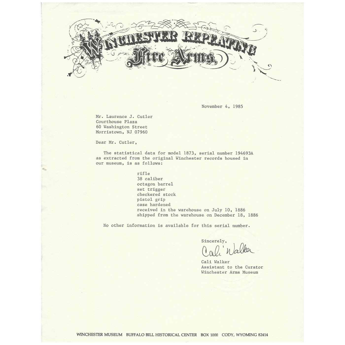 This item comes with a Winchester Factory Letter dated November 4, 1985, confirming its age and origin. The letter states is in .38-40 caliber (.38 WCF) with a classic 24 inch octagonal barrel. However, as specified, it has a factory "Set Trigger", which allows the trigger pull to be adjusted to suit the owner. But that's just the start, as it also has the very rare options "Checkered Stock", as well as "Pistol Grip", which means that this rifle is equipped with factory highly figured checkered stocks, and that the rear stock and lower receiver are in a "pistol grip" formation. The stocks on this rifle are simply amazing, and the checkering would aid in gripping the rifle, as would the pistol grip, ensuring a very steady aim. When combined with the set trigger, this was definitely intended for sport shooting.