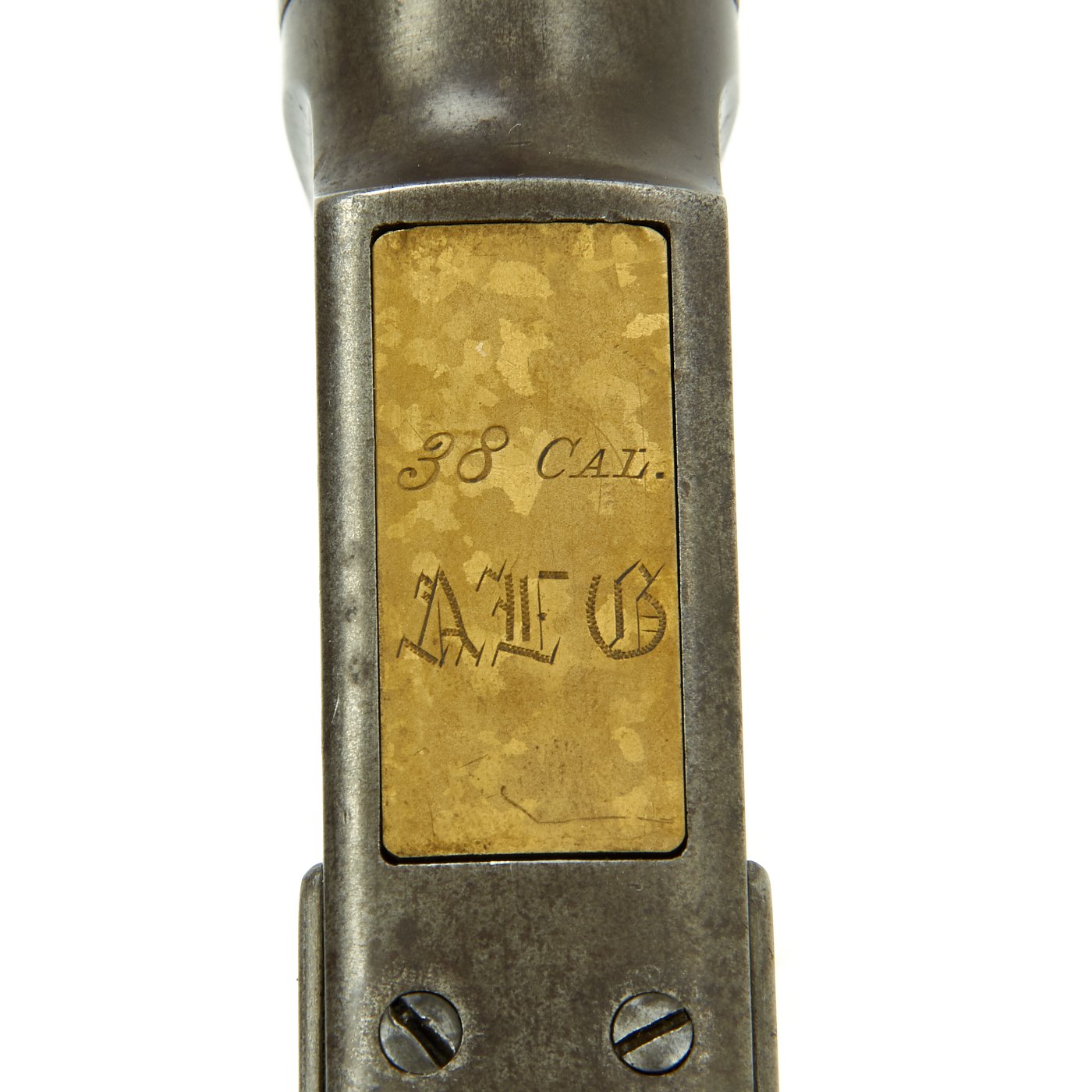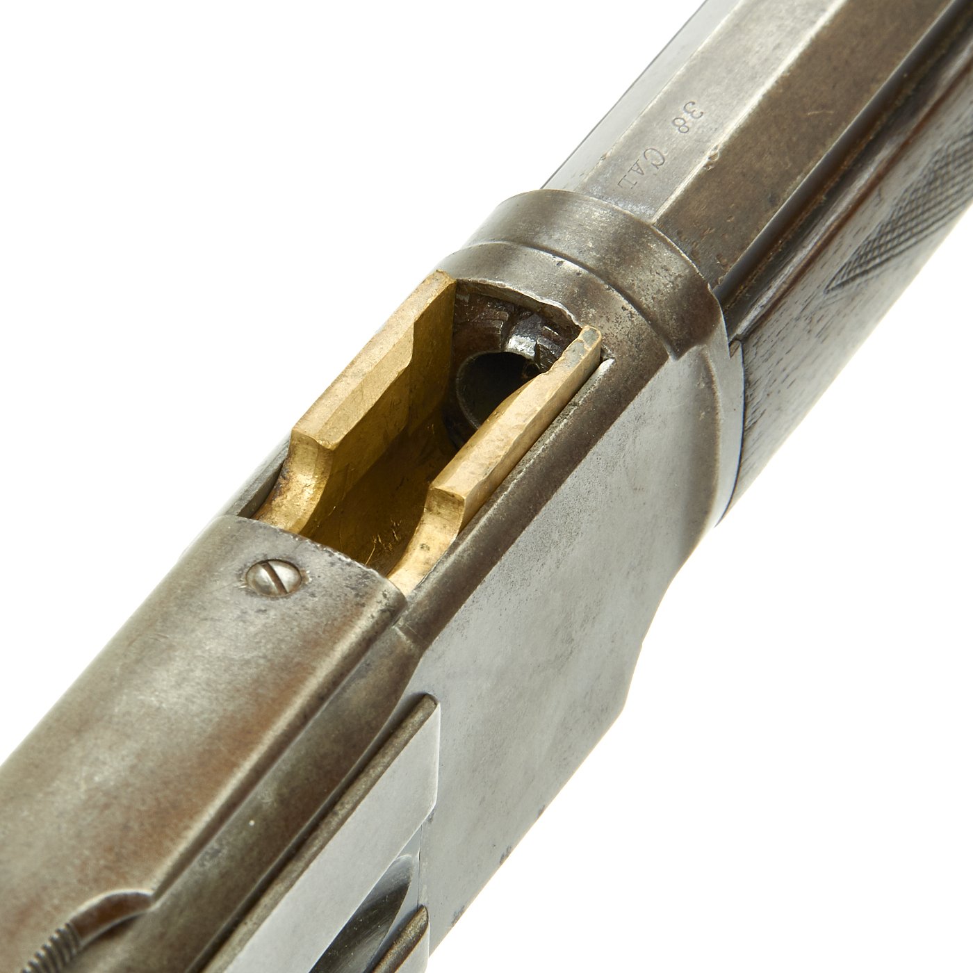 It is also marked .38 CAL over the barrel chamber, indicating the .38-40 caliber. This marking often wears off, as does the 38 CAL. marking on the bottom of the brass feed block, which is still visible. It has also been personalized with the initials A E G in Black Letter type face.