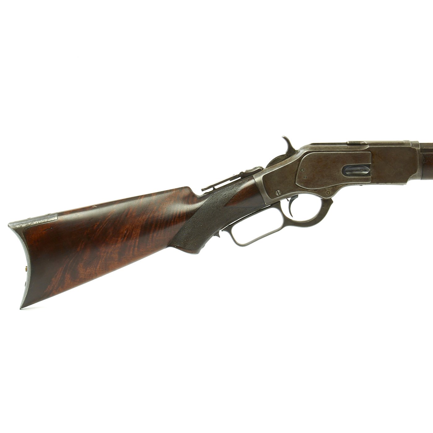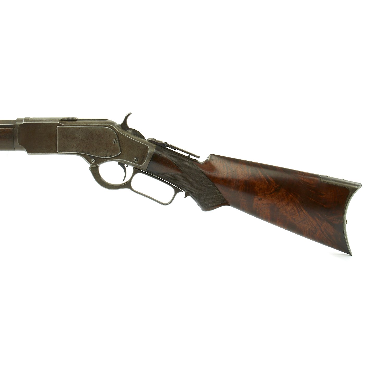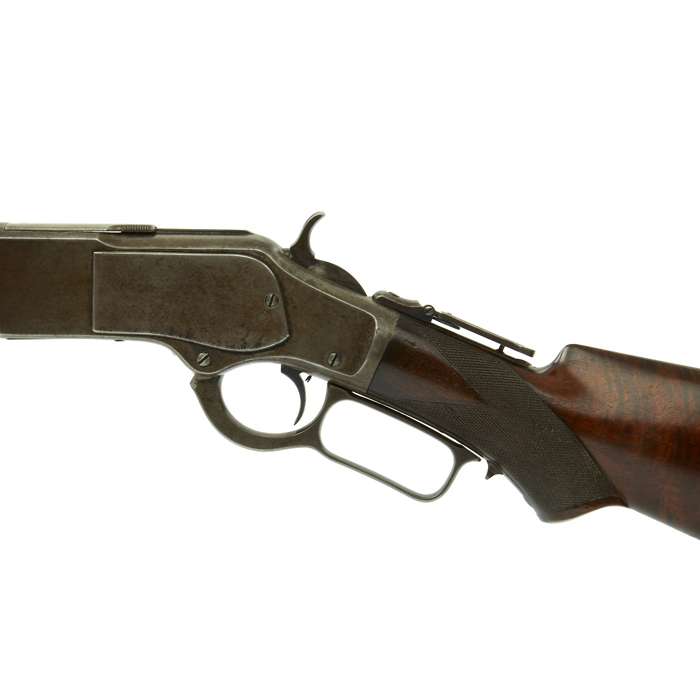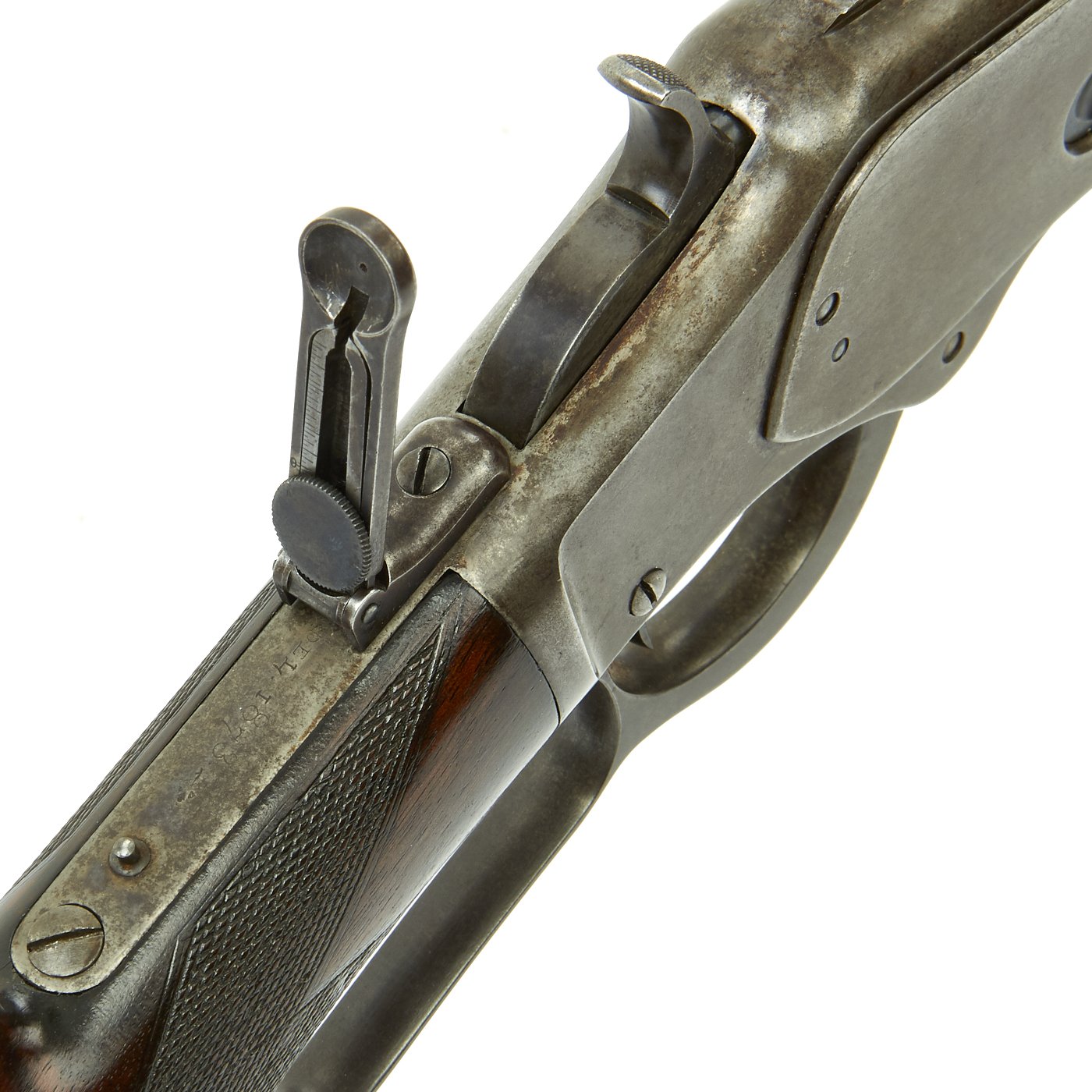The barrel is fitted with the iconic Winchester "Buckhorn" rear sight, with a standard blade front sight. This rifle is also equipped with a tang-mounted adjustable "peep" sight, which is marked PAT. JUNE 1881. There is no mention of a peep sight in the factory records, so it was most likely fitted by the retailer.