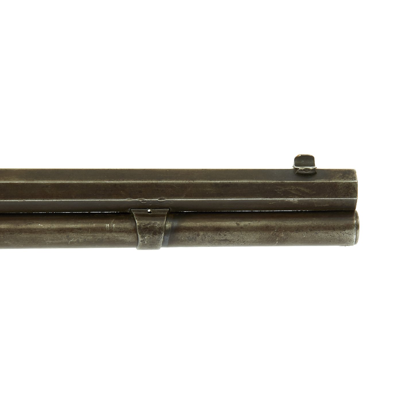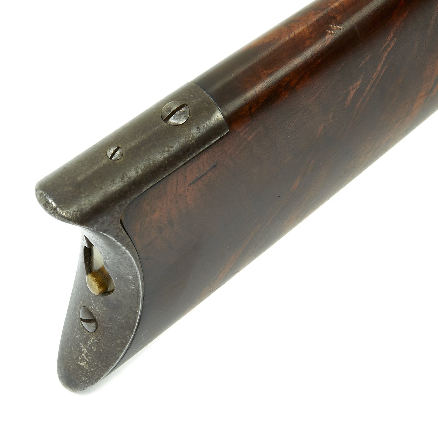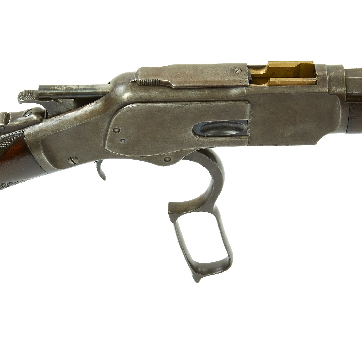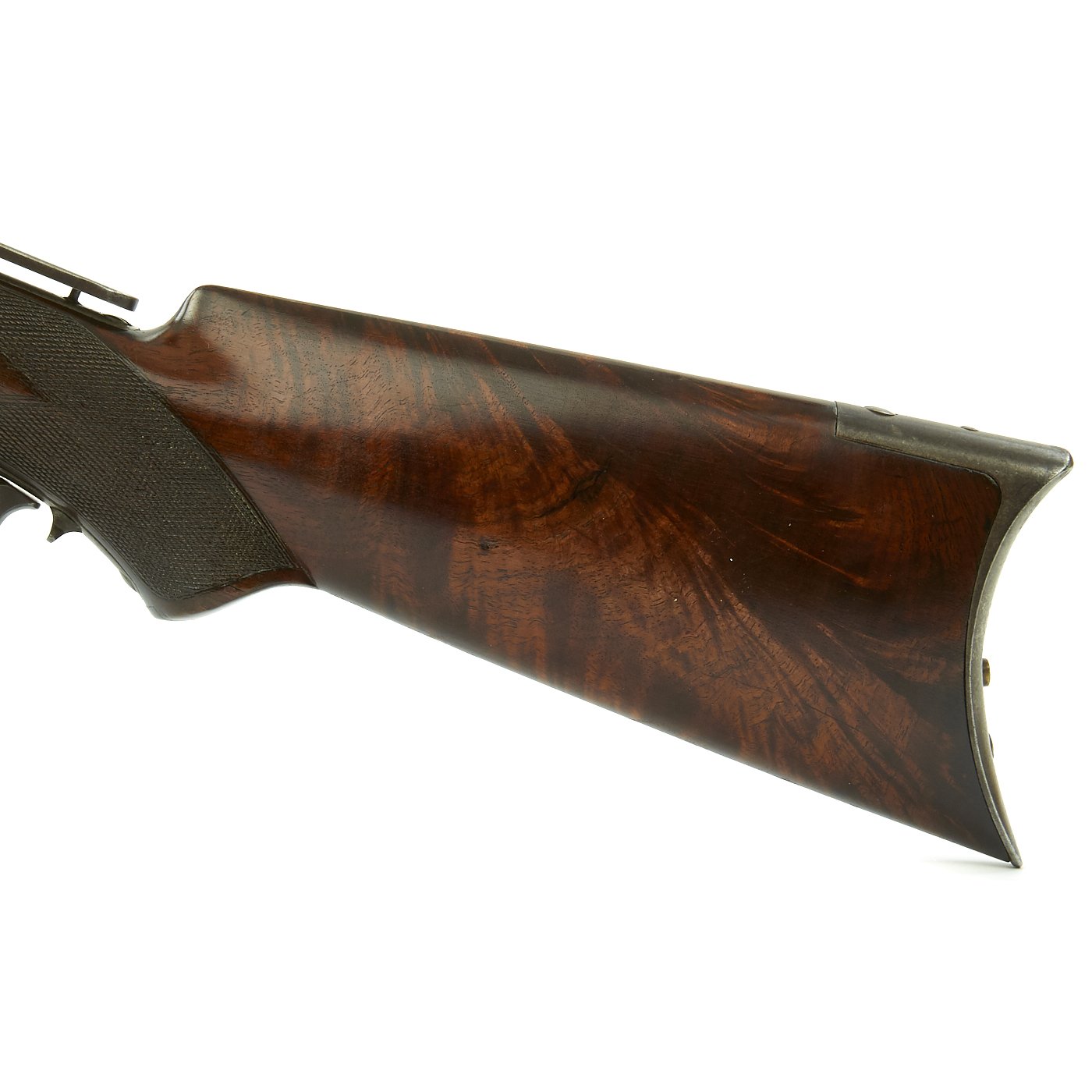 The barrel is fitted with the iconic Winchester "Buckhorn" rear sight, with a standard blade front sight. This rifle is also equipped with a tang-mounted adjustable "peep" sight, which is marked PAT. JUNE 1881. There is no mention of a peep sight in the factory records, so it was most likely fitted by the retailer.