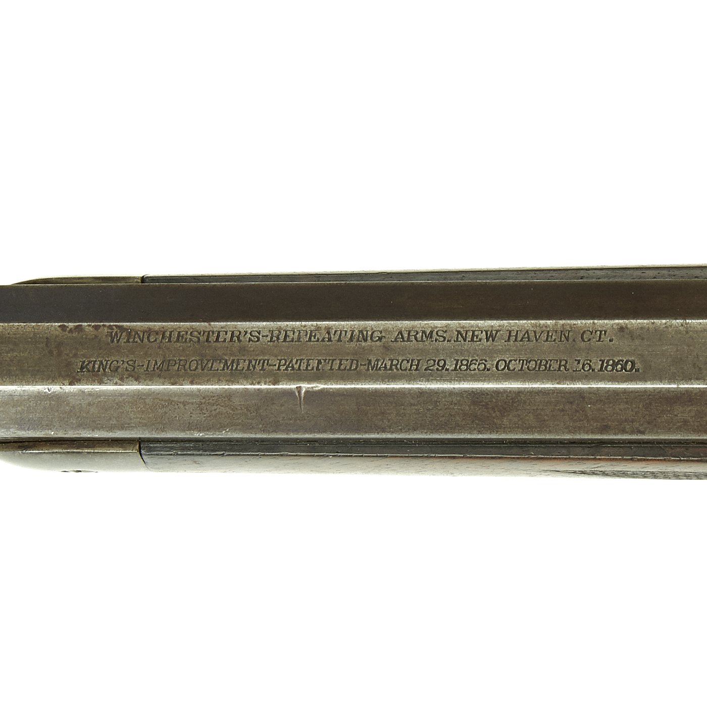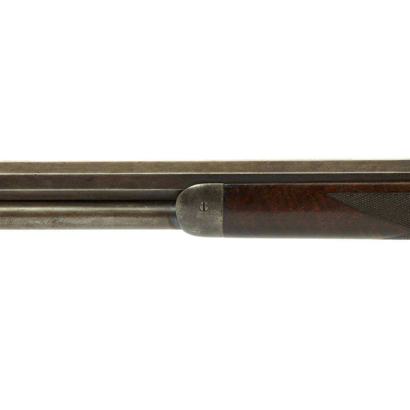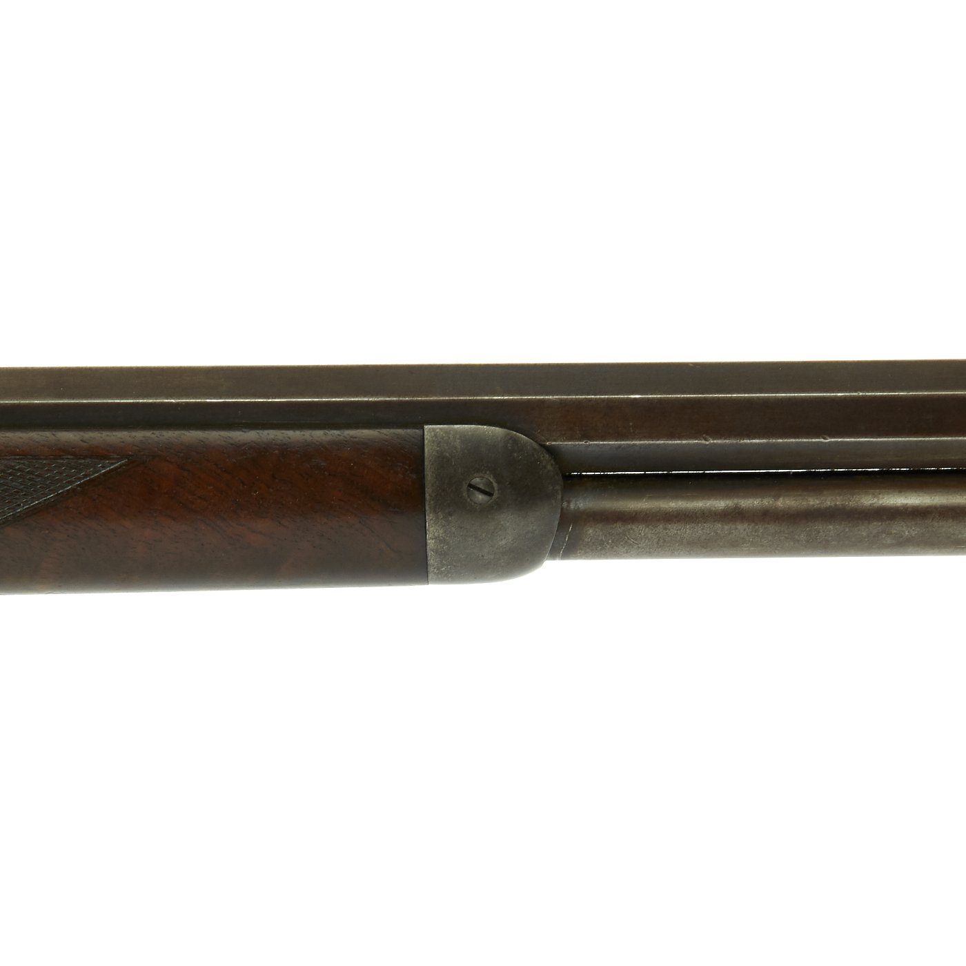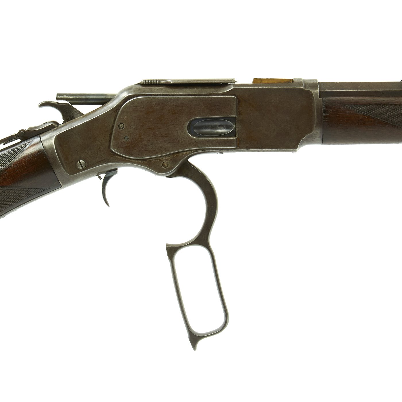 The barrel is fitted with the iconic Winchester "Buckhorn" rear sight, with a standard blade front sight. This rifle is also equipped with a tang-mounted adjustable "peep" sight, which is marked PAT. JUNE 1881. There is no mention of a peep sight in the factory records, so it was most likely fitted by the retailer.