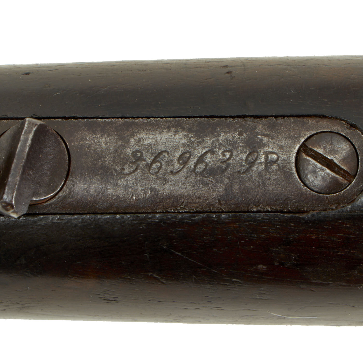 However, they were still produced, complete with the sling swivels required on a military rifle. It also was designed to mount a bayonet, and we actually received one with this example! We have not had one of these bayonets before, and we suspect that they are rarer than the rifle! It also features a standard "ladder" rear sight, with a barleycorn front sight, much different from the standard sights on most 1873s. The serial number is 369639B denoting the year of manufacture as 1891. The engraving on top of the barrel is mostly clear: