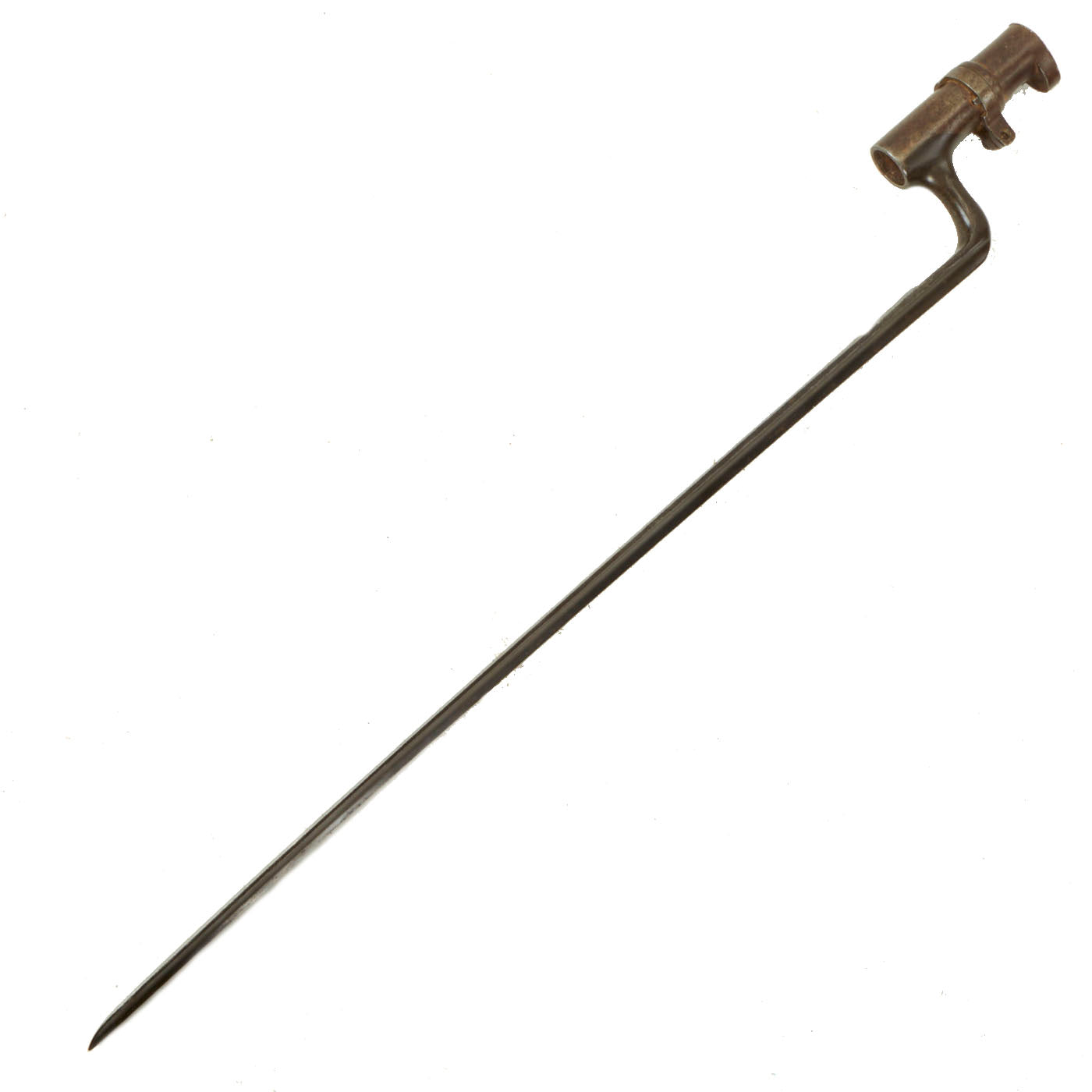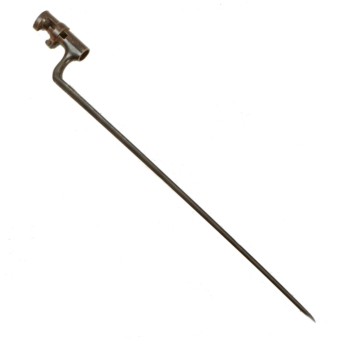 The included bayonet is in very good condition, with much of the original bluing still present on the blade, and no major rust issues. The socket has a worn gray patina, showing some wear from service, but no major damage. It fits well on the barrel, and locks into place correctly.