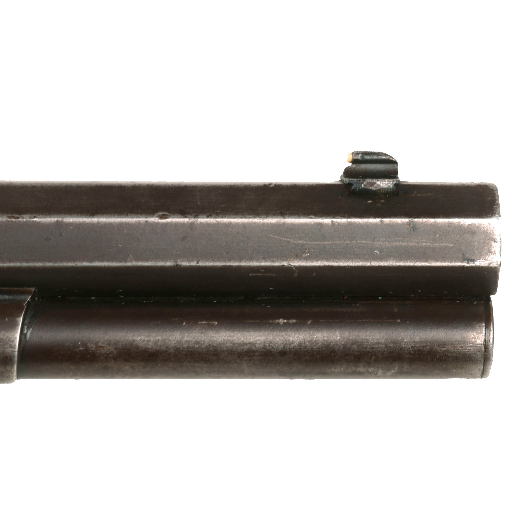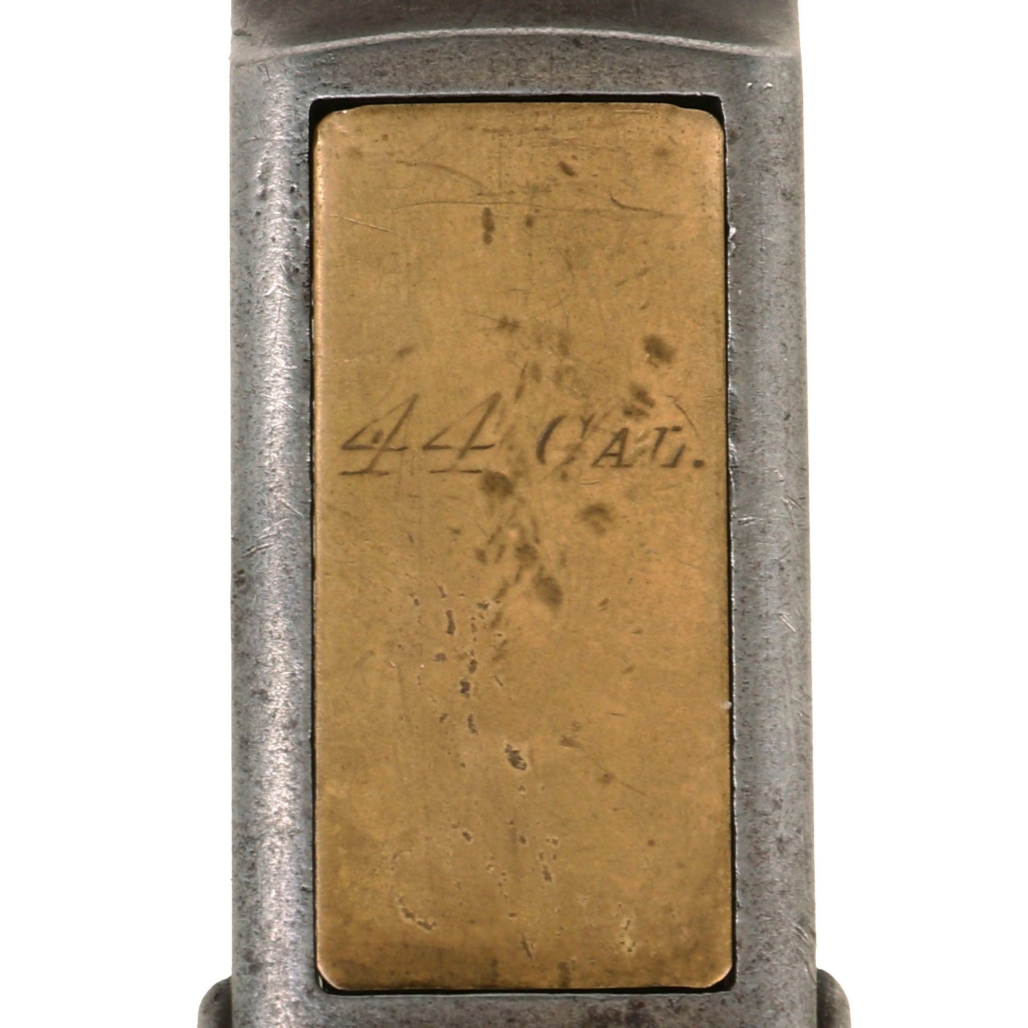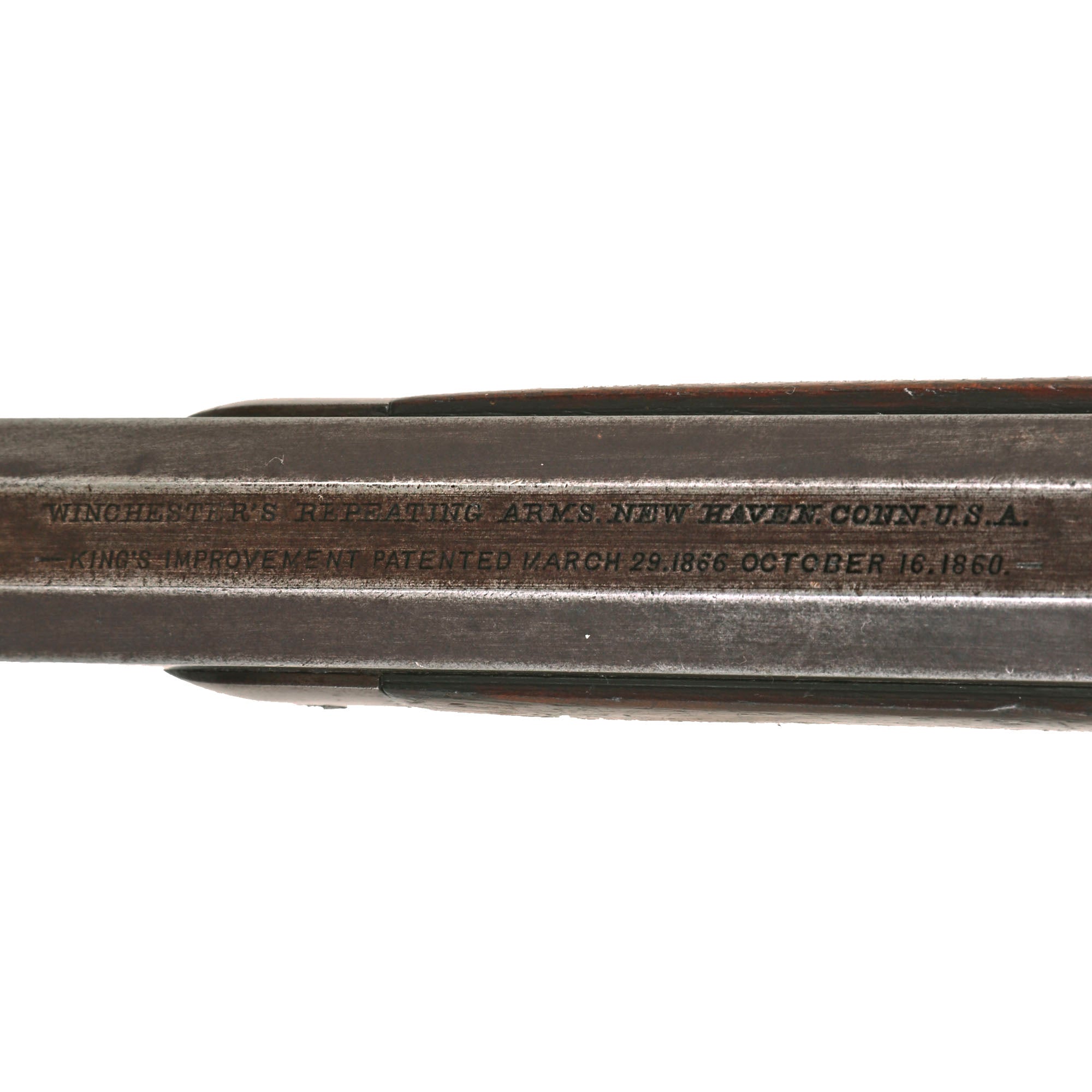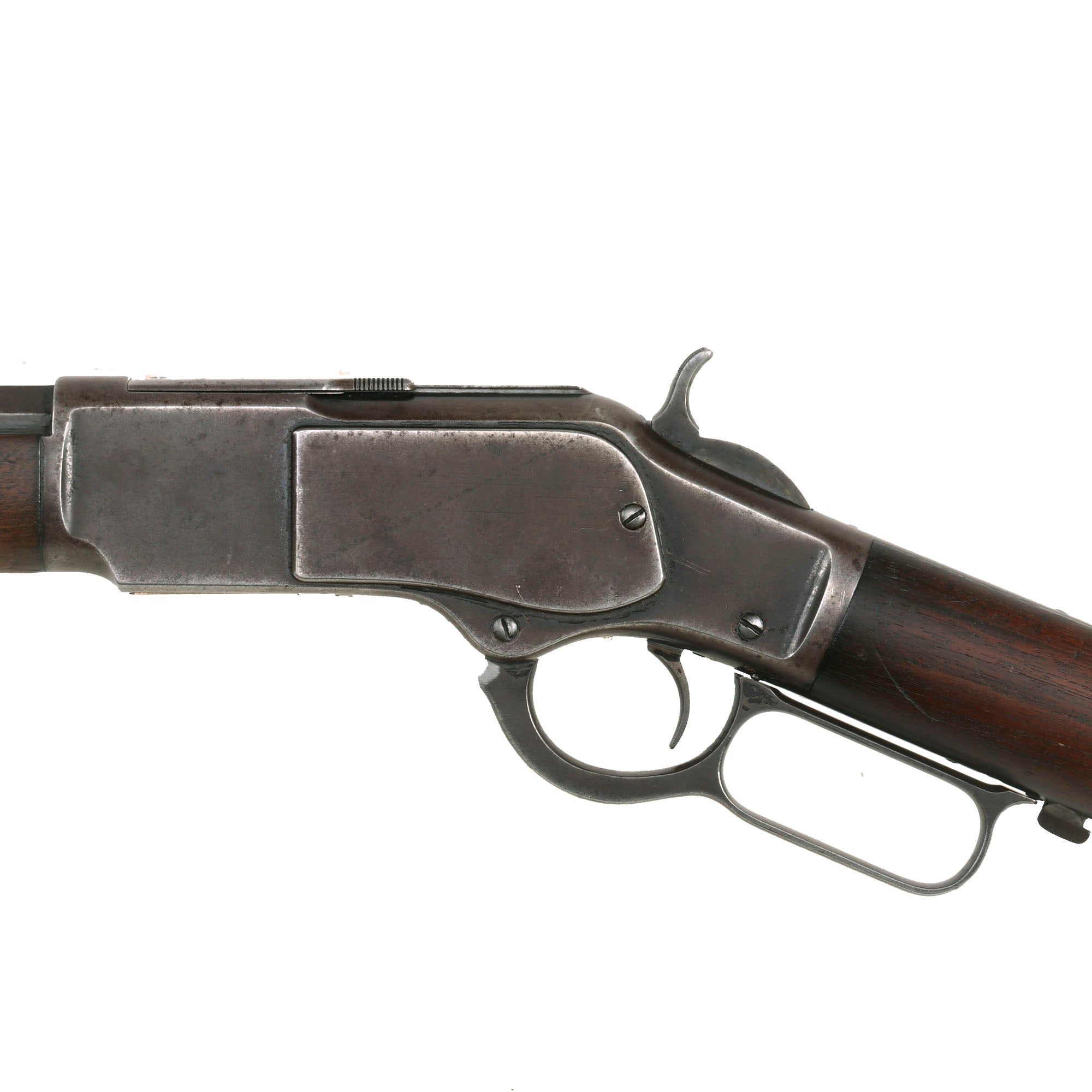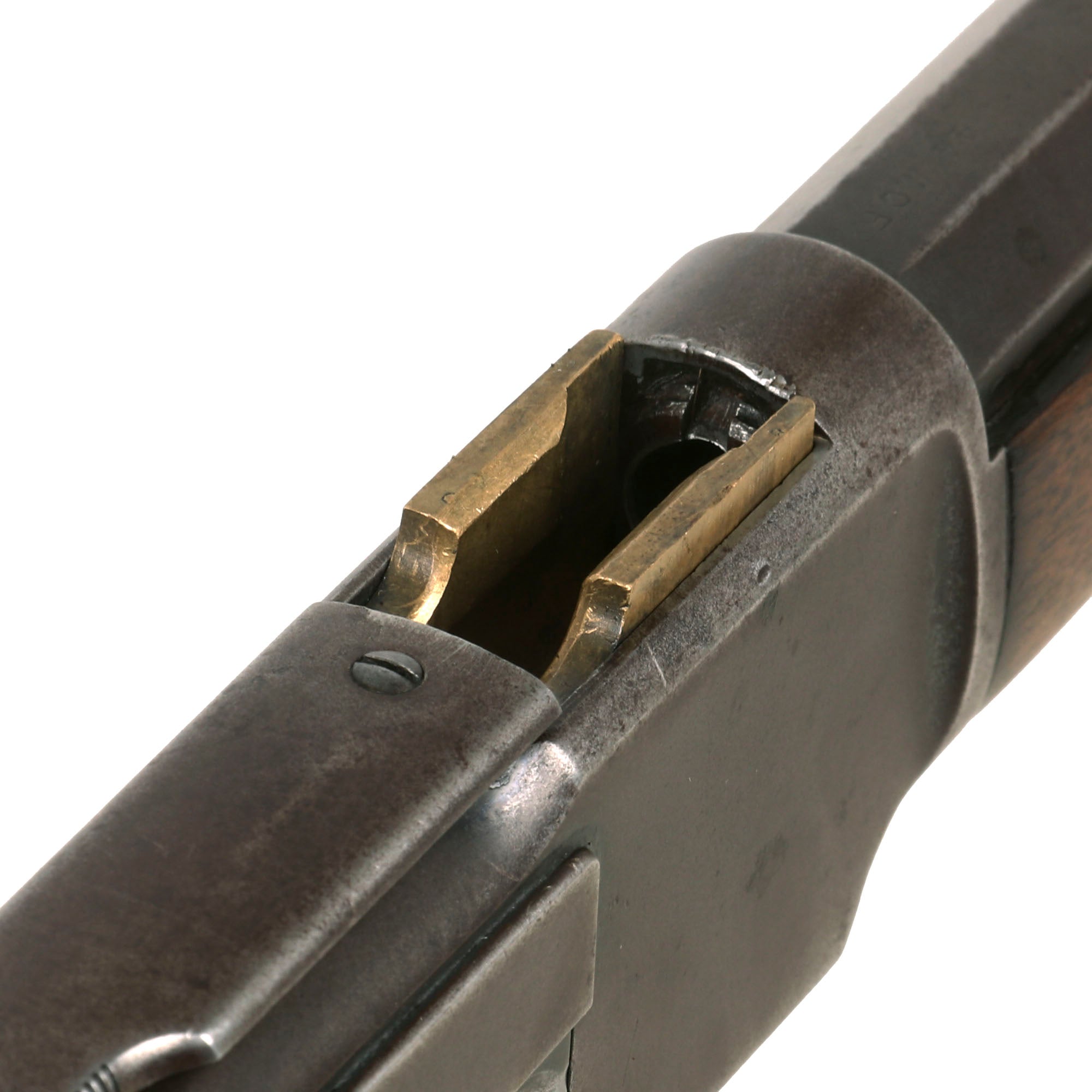 This lever action repeater is offered with a crisp tight action in fully functional condition, with a working original dust cover. It cycles well, without any slop or sticking that we noticed. The metal work is good, with the original blue faded to a worn oxidized patina due to decades of cleaning, with areas of light peppering and oxidation. There do not appear to be any major rust areas, and overall it has a great "frontier worn" look. The bore is in very good condition, showing a parttly bright finish and strong lands and grooves. There is definitely some wear and past oxidation, but no major pitting or similar issues. Overall we would rate this an 8 out of 10.