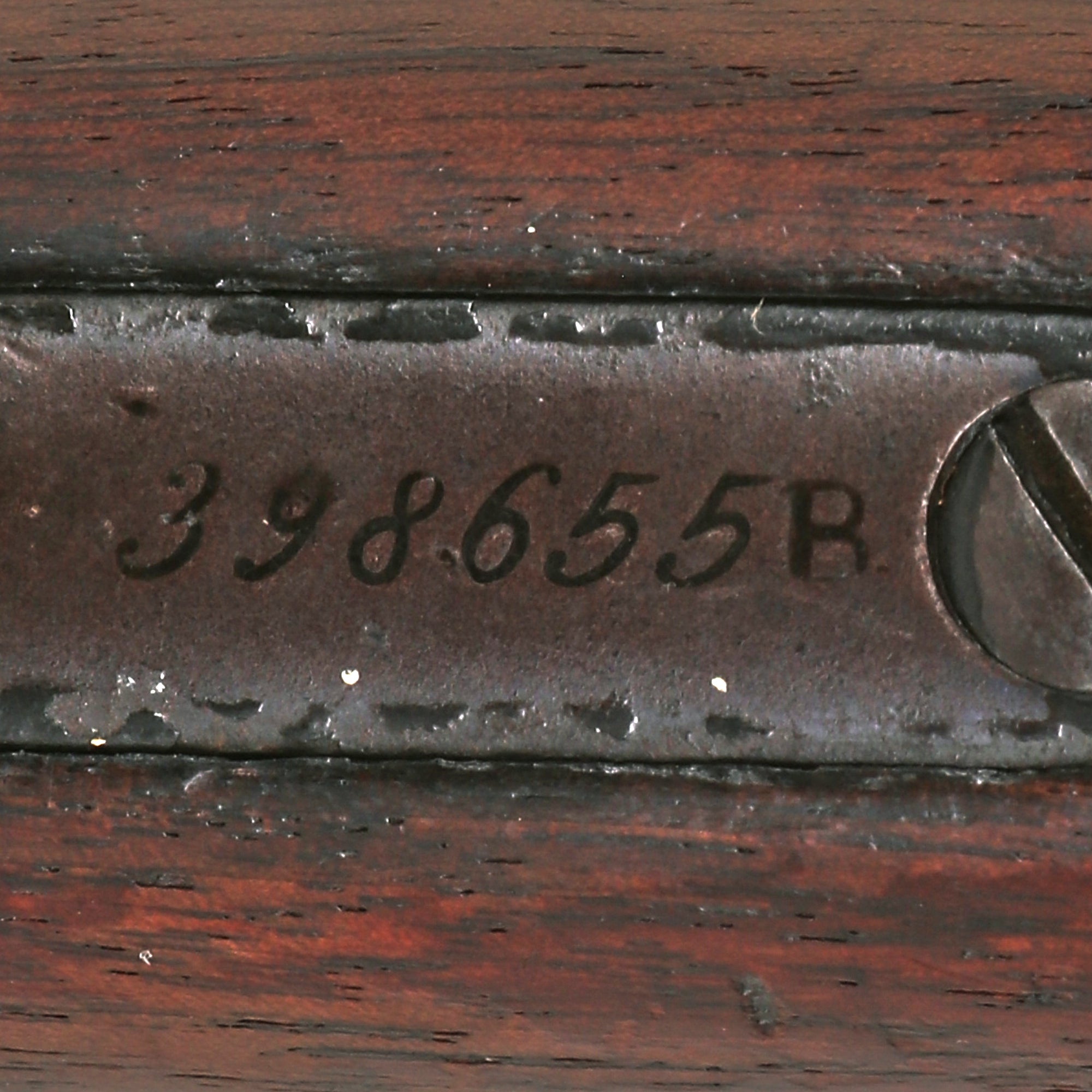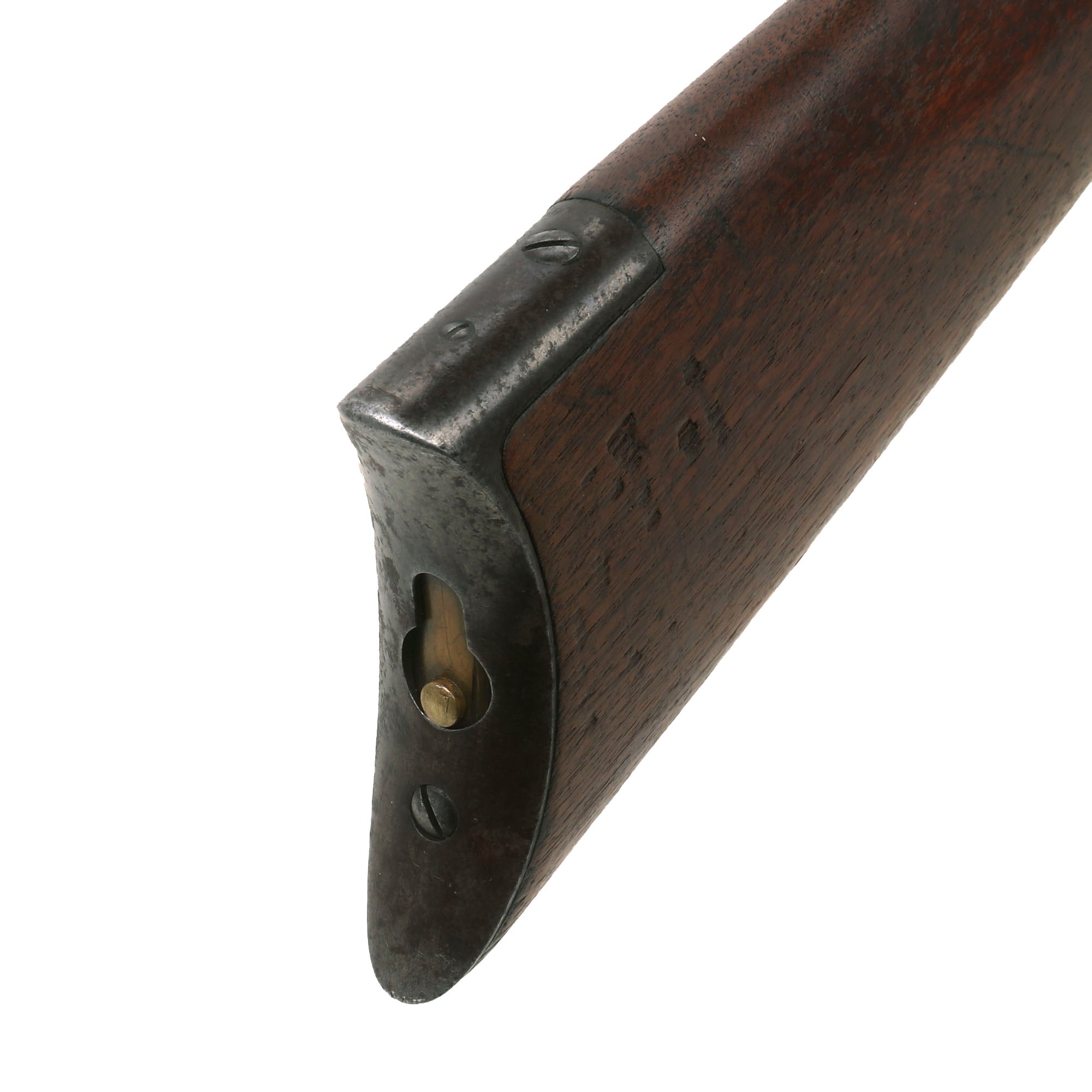 The stocks are in very good used condition, with a great color and patina. They look to have been finished at some point, which is now completely worn off the fore stock, while the rear stock still retains some. There are no major cracks or repairs that we can see, just the usual small dents and scratches from service. The butt stock has a lovely crescent butt plate, which has a working storage compartment (empty).