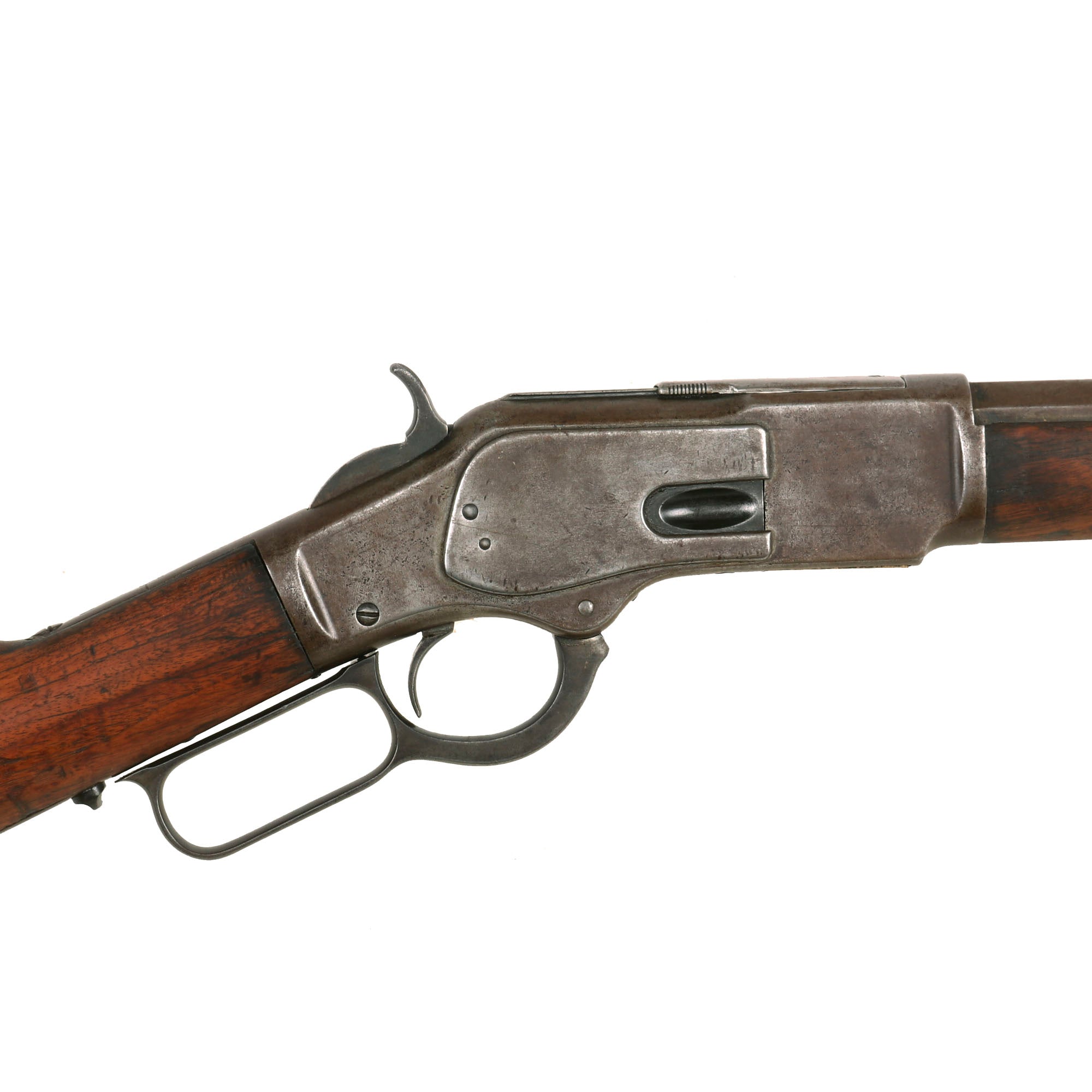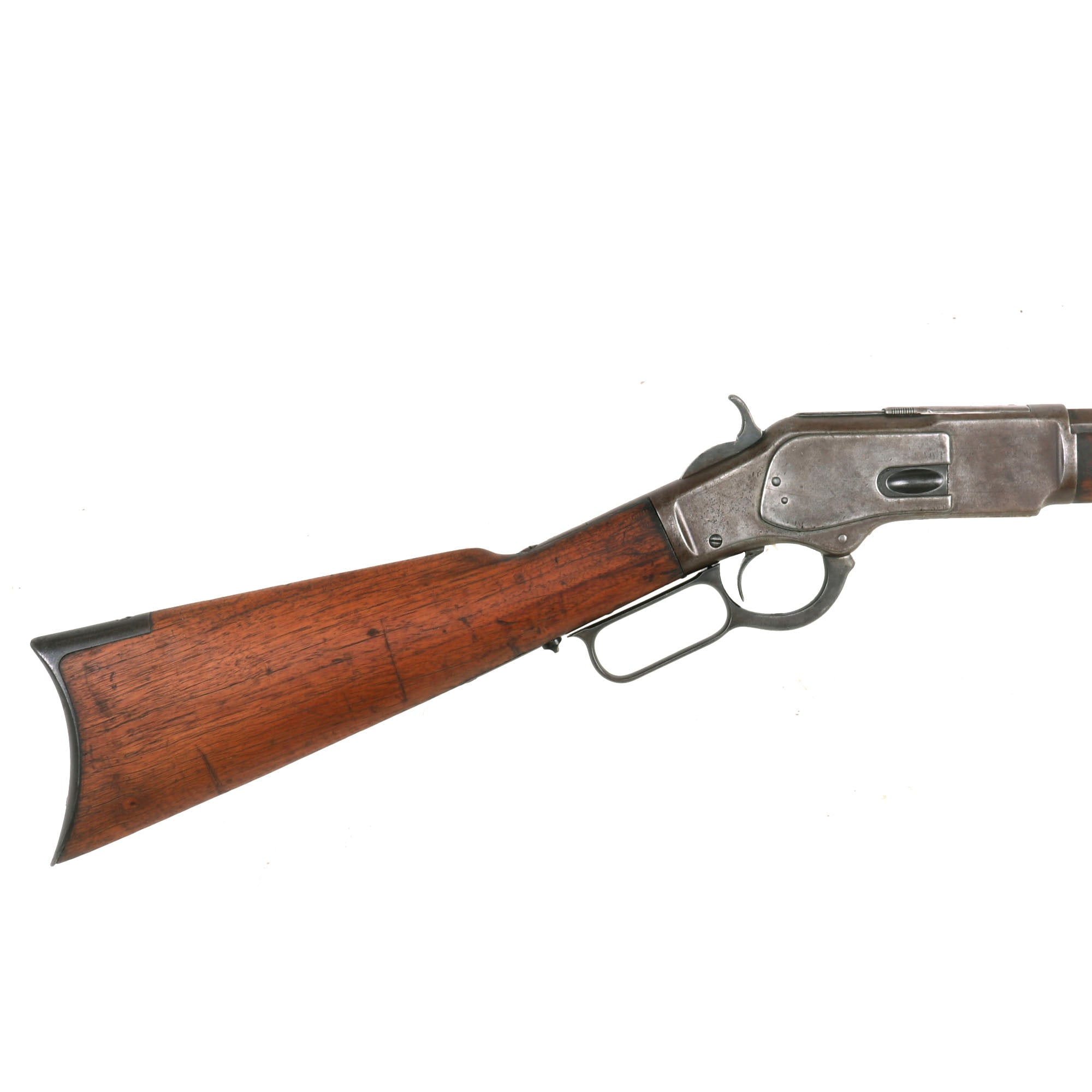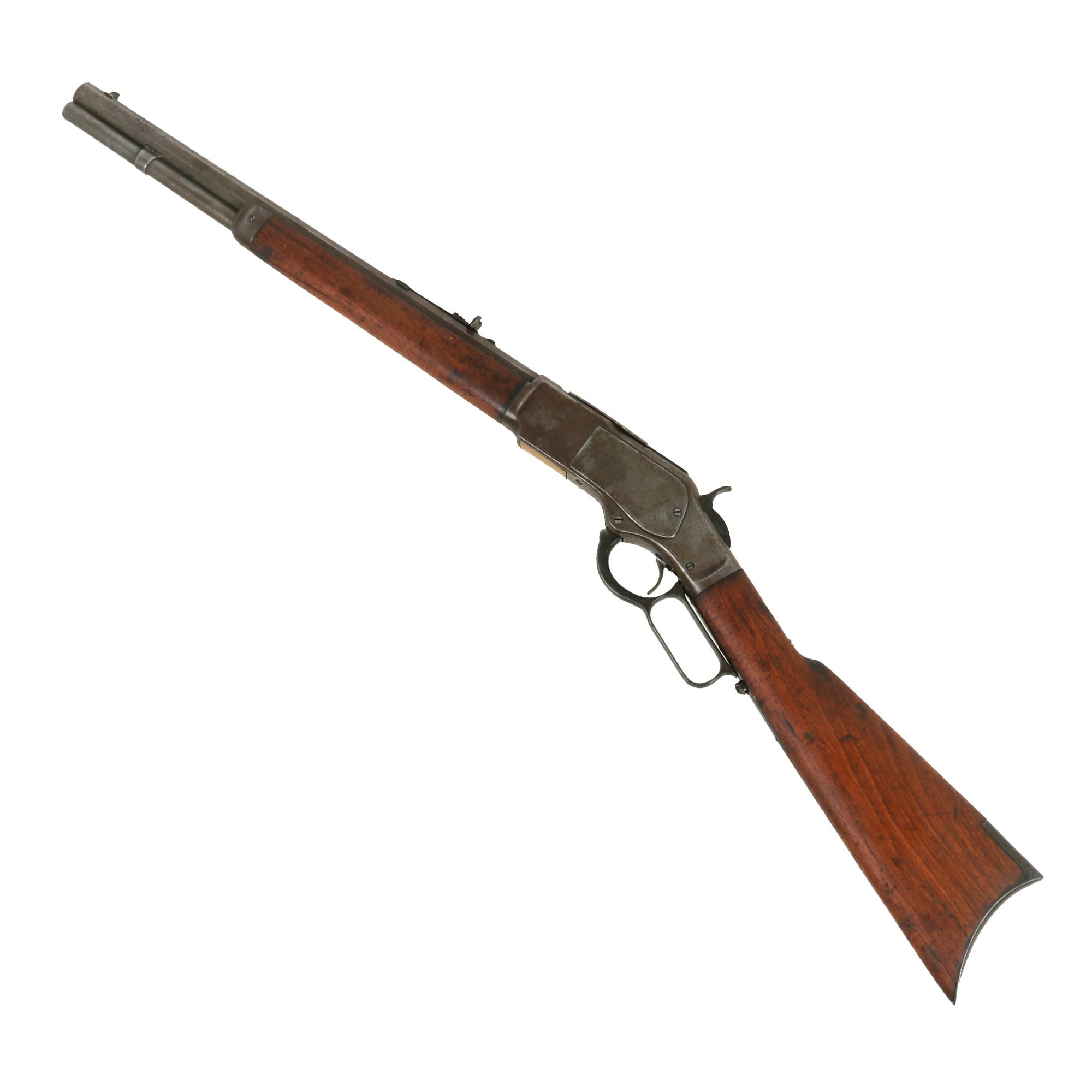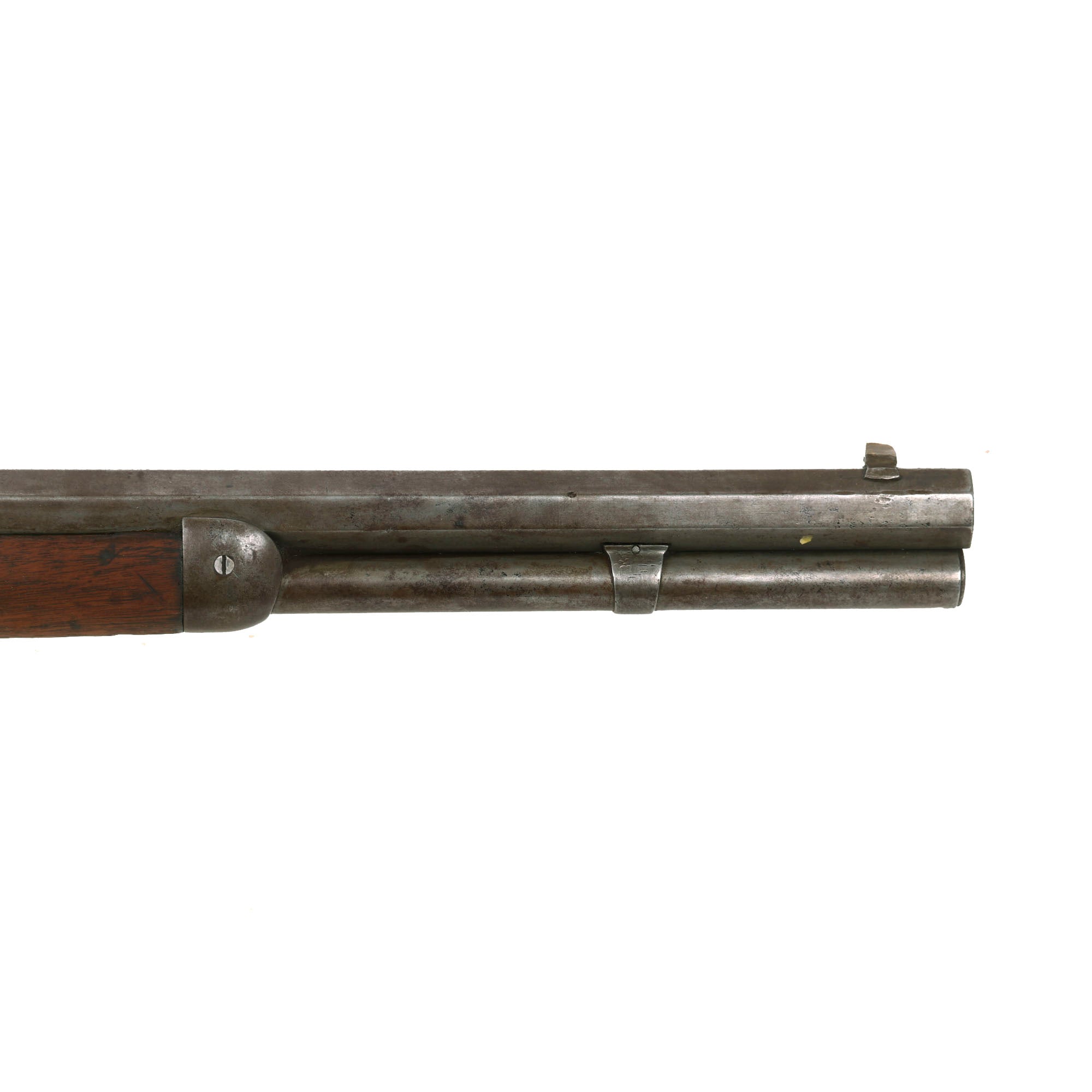 Original Item: Only One Available. "The Gun that Won the West!" This wonderful honest used Winchester repeating rifle is in .44-40 caliber, correctly marked with 44 W.C.F. over the chamber, while the brass carrier block marking is worn away. It features a short 18" octagonal barrel and full-length magazine tube, which we assume was shortened from the original 24". It is however always possible that it was a special order, as the butt stock also does not have any storage compartment. Definitely some great research potential!
