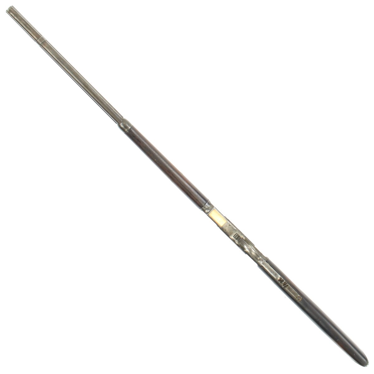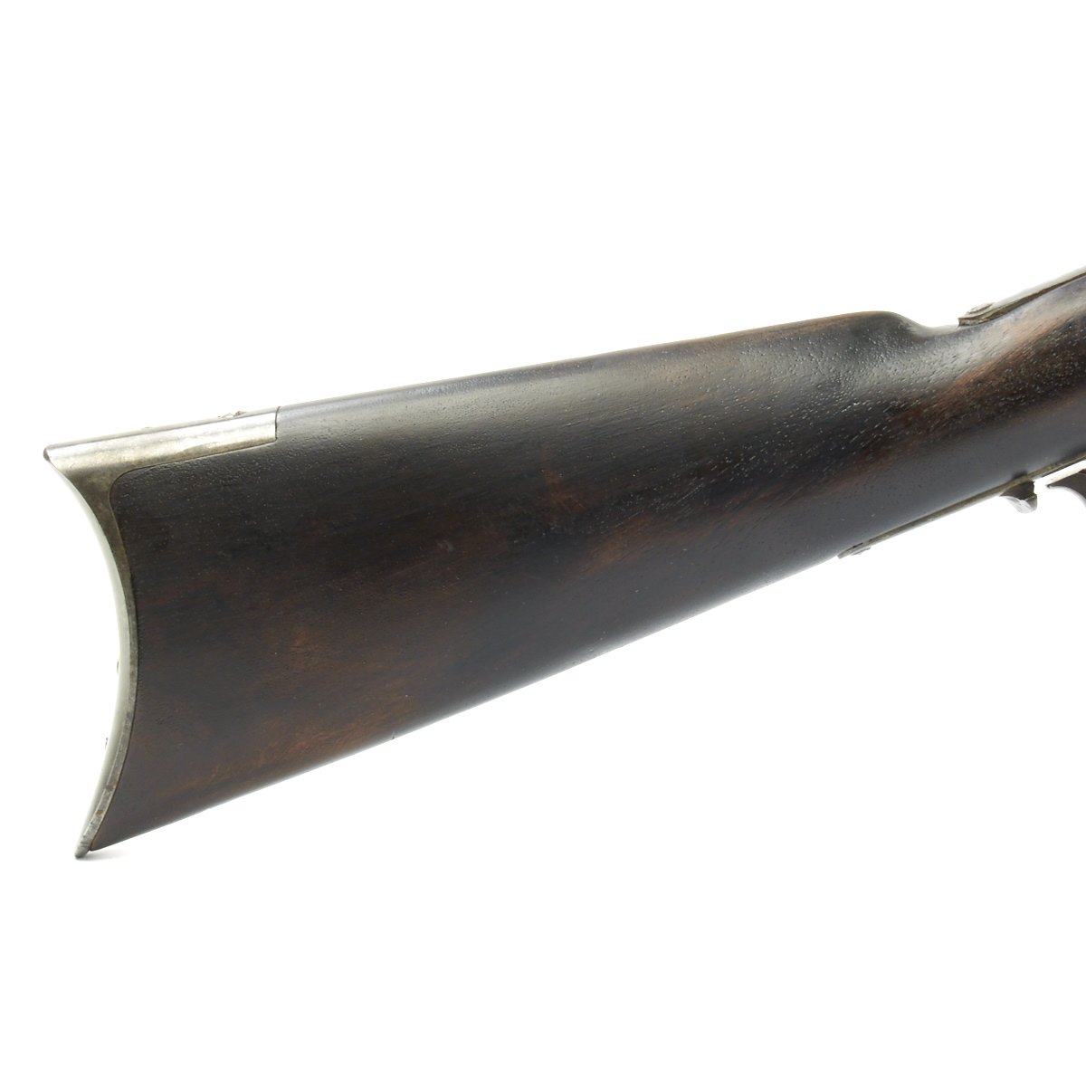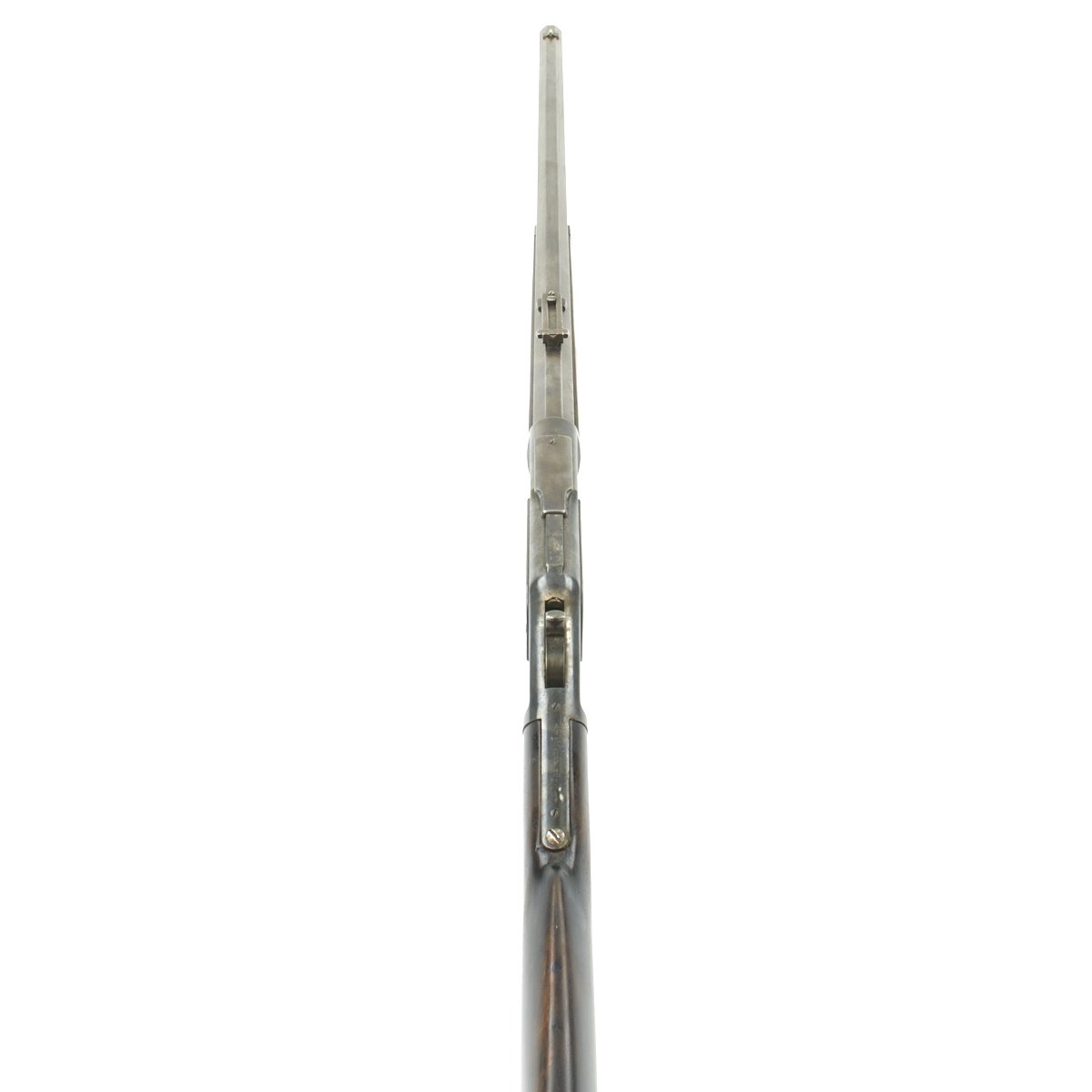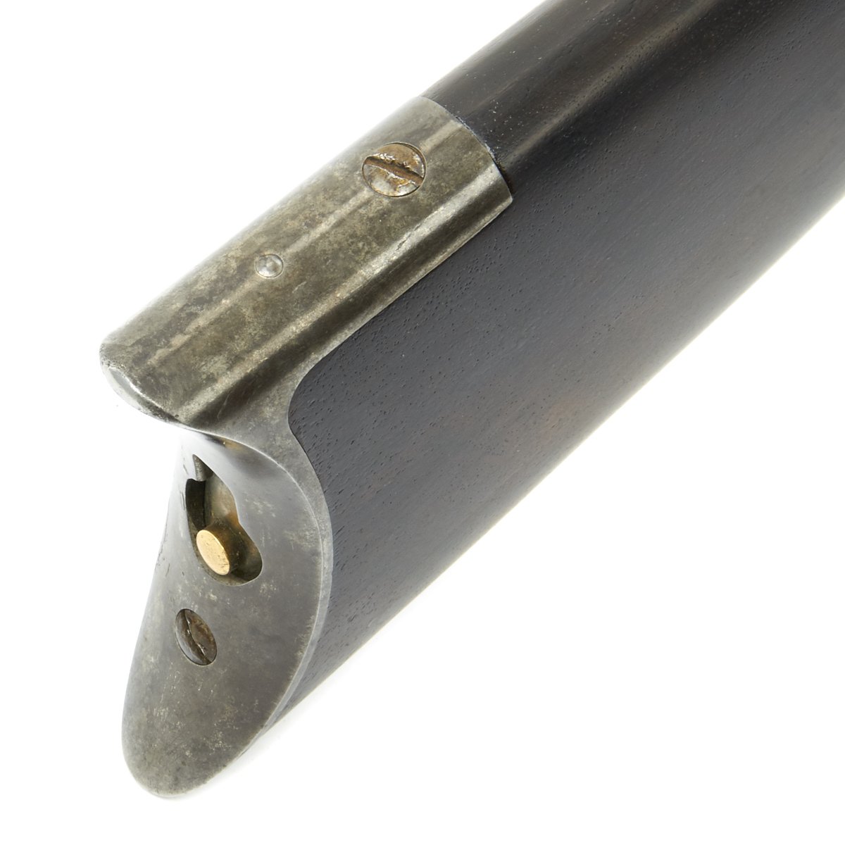 Stocks are in very good condition, with a great patina and the dark brown color of aged oiled walnut. There are few dents and scratches on the stocks, so this rifle was definitely well cared for. Offered with a crisp tight action in fully functional condition with the original tight fitting dust cover. Metal work is good, with a lot of the finish intact, and just a bit of peppering. Bore is a bit worn, but still has clear lands and grooves, with a mostly bright finish.