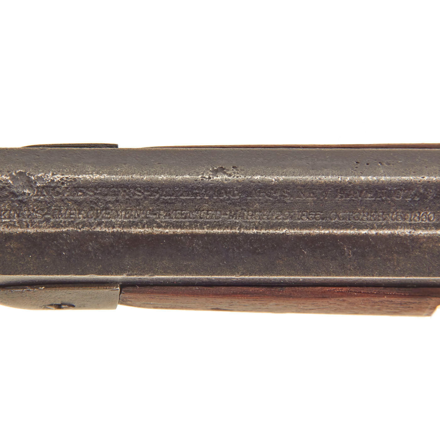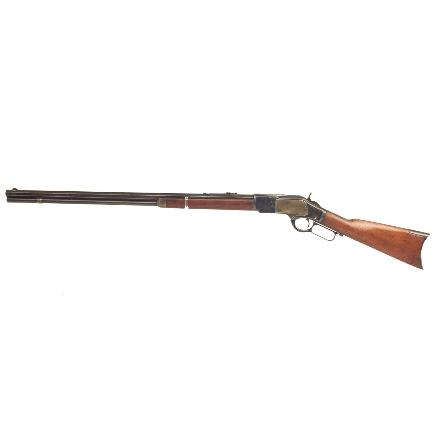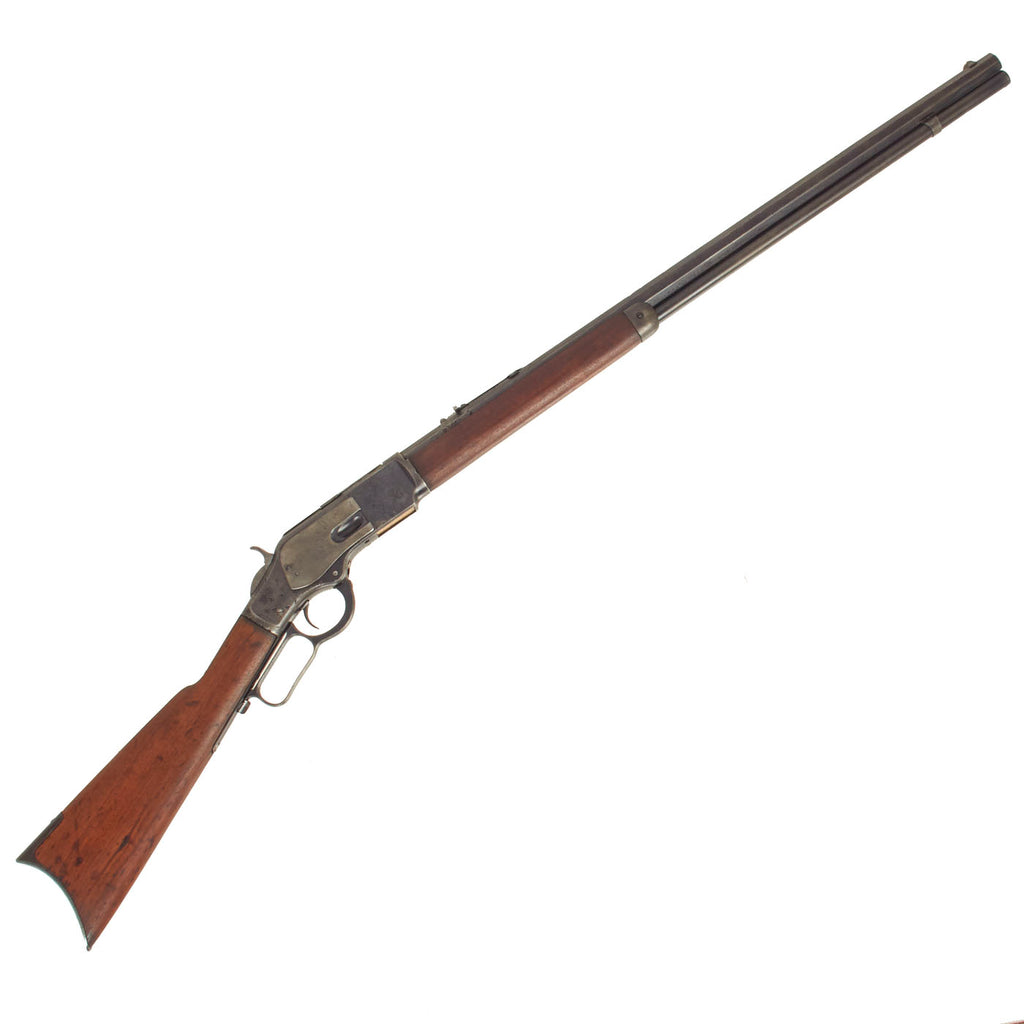 Original Item: Only One Available. "The Gun that Won the West!" This very fine "frontier used" rifle is in .44-40 caliber with a desirable special order 28" octagonal barrel, about the third most popular length after 24" and 26". It is correctly marked with MODEL. 1873. on the receiver tang. The caliber markings have worn off, but we have confirmed with measurements that it is in .44-40 Winchester Center Fire. Features the classic blade front sight and modified "flat-top" rear adjustable sight, with a full length magazine tube. The serial number is 384940B denotes the year of manufacture as 1891. The engraving on top of the barrel is still mostly clear: