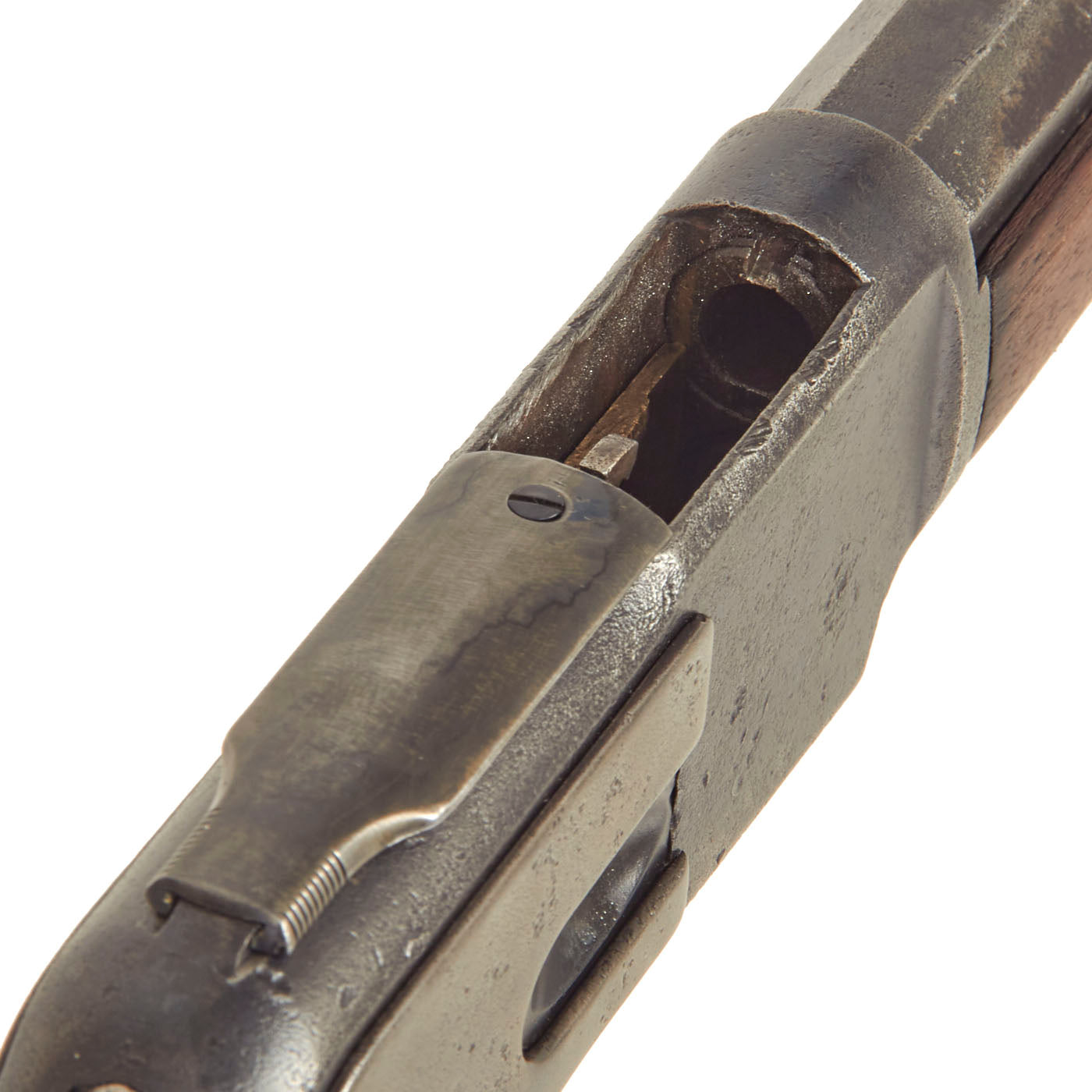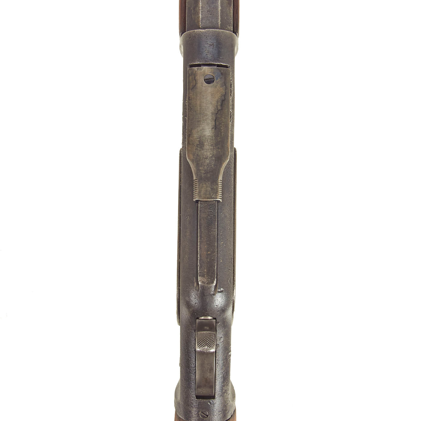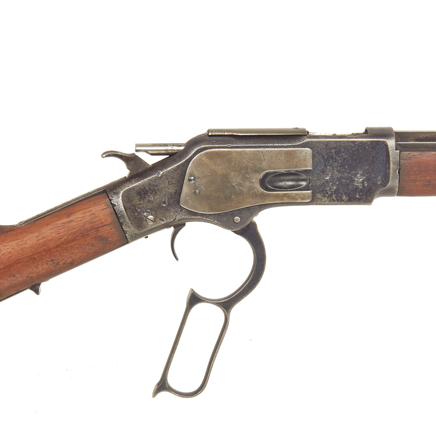 This lever action repeater is offered with a crisp tight action in fully functional condition, with a working original dust cover. There is a bit of stiffness during cocking due to internal wear. Metal work is good, with the original blue faded to a worn plum patina. There are some areas of past pitting corrosion from exposure to the elements, now ground out. The bore, as with all the metalwork, does show some advanced corrosion. There are areas where the rifling is clear, but also those where corrosion and fouling have made the bore dark, particularly towards the muzzle. This definitely is a gun that saw long service on the frontier without proper cleaning.