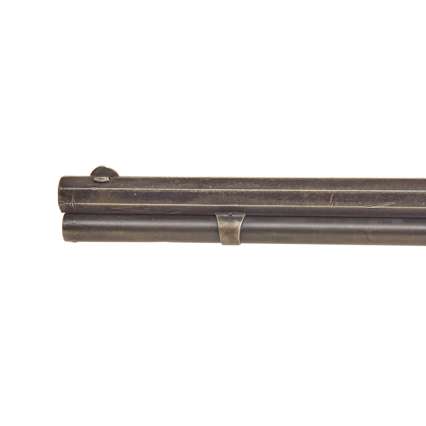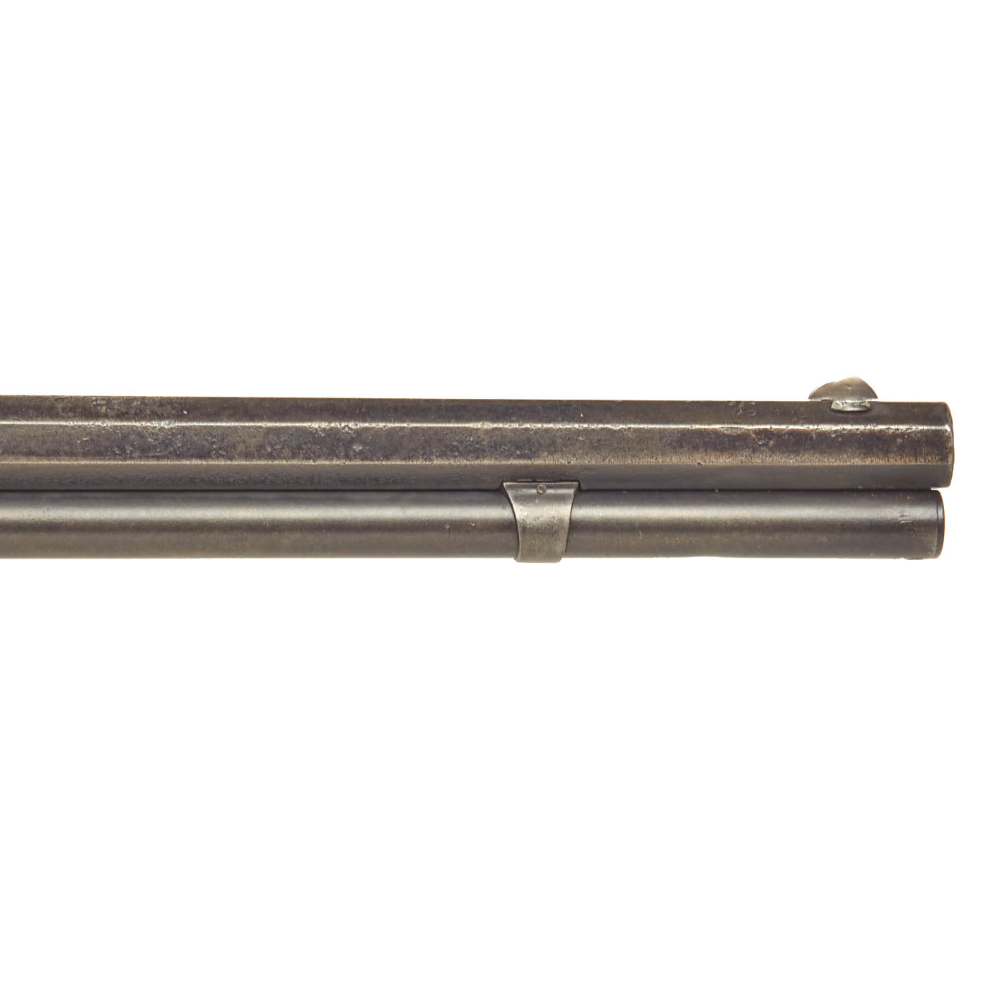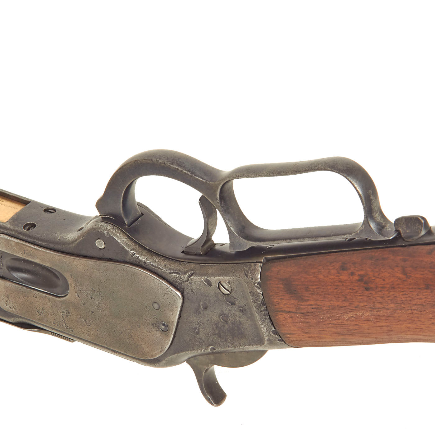This lever action repeater is offered with a crisp tight action in fully functional condition, with a working original dust cover. There is a bit of stiffness during cocking due to internal wear. Metal work is good, with the original blue faded to a worn plum patina. There are some areas of past pitting corrosion from exposure to the elements, now ground out. The bore, as with all the metalwork, does show some advanced corrosion. There are areas where the rifling is clear, but also those where corrosion and fouling have made the bore dark, particularly towards the muzzle. This definitely is a gun that saw long service on the frontier without proper cleaning.