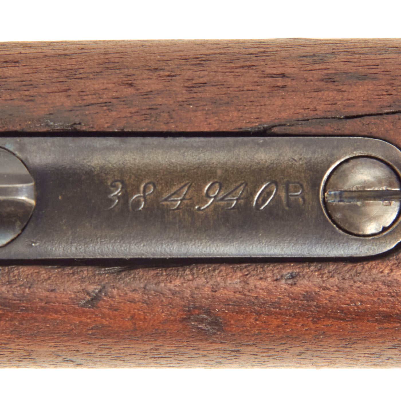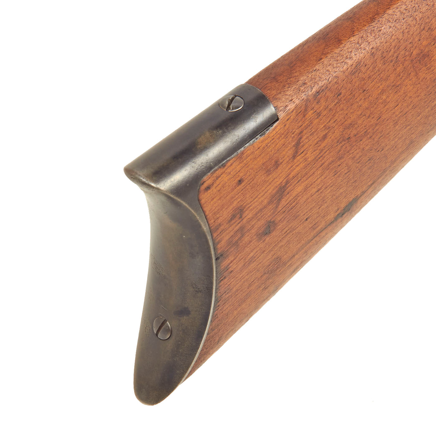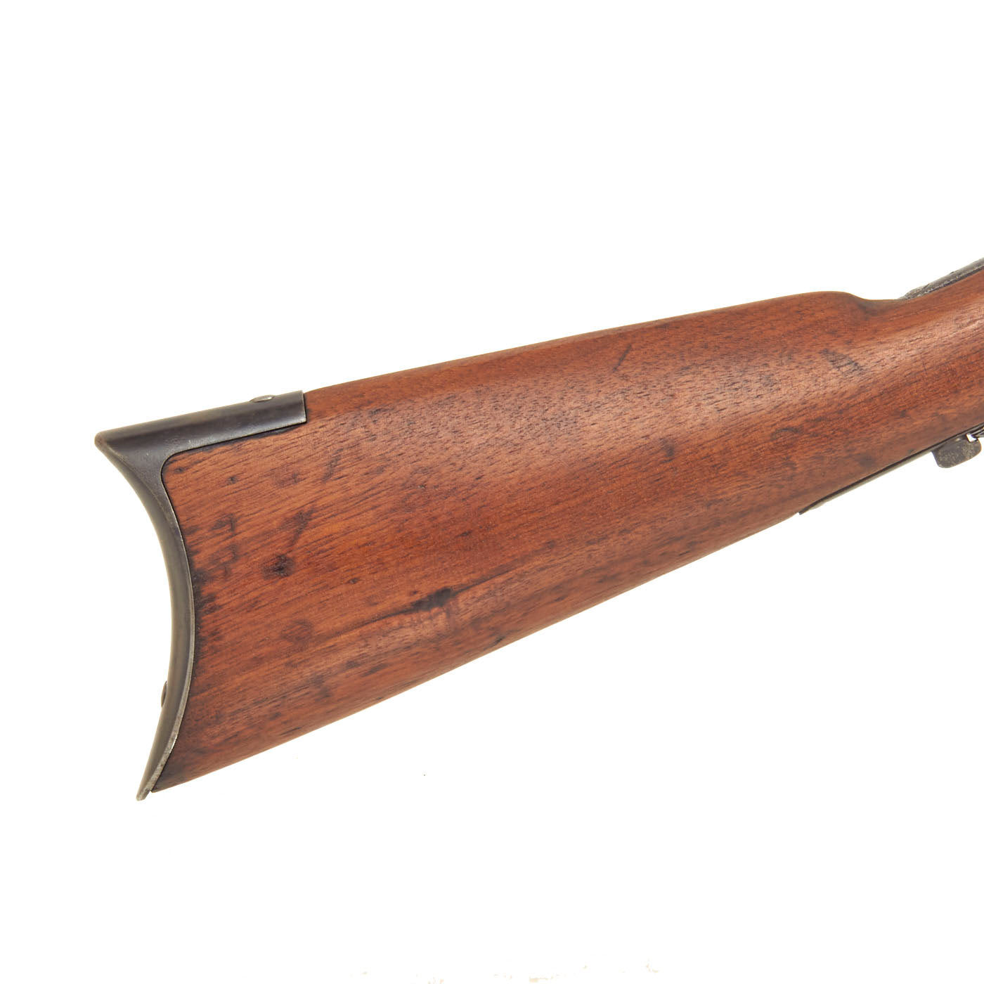 The stocks are in good condition, with a great color and patina, showing wear from use and later cleaning and refinishing. The fore stock is just grate, with no issues to speak of. The butt stock shows more wear, and the left side has had a large portion sanded down 1/4" or more. There are also repaired cracks running from the trigger guard and receiver tang, so this is definitely a butt stock that saw a lot of service. It meets well with the crescent butt plate, which is in good shape, and does not have a storage compartment. Due to wear the stock is now below the level of the butt plate.