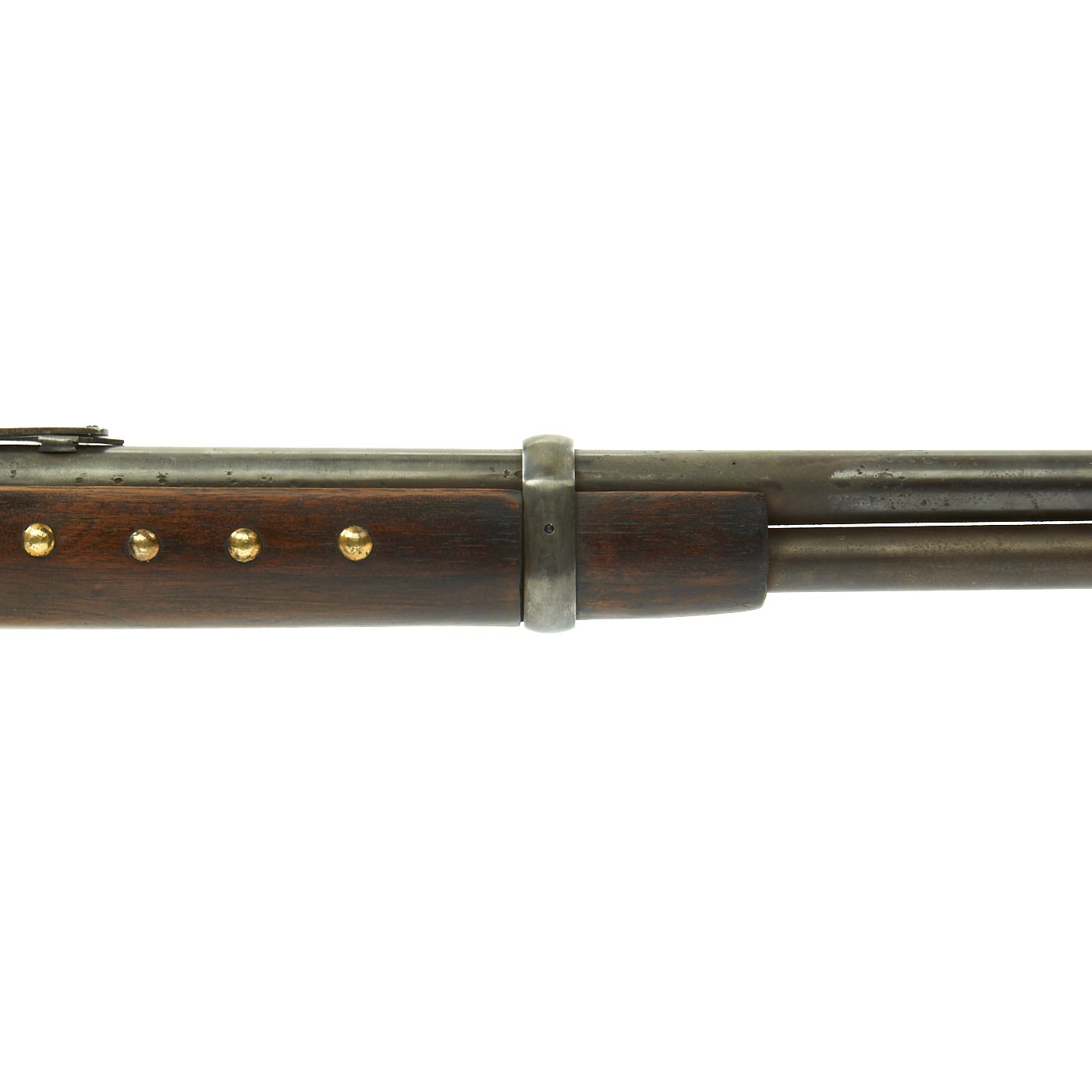 In nice matured condition showing use and really presents nicely. Interestingly the wood stocks both fore and aft have been decorated with brass dome headed tacks which may indicate it once belonged to an American Indian, or it could also have belonged to an over enthusiastic collector who watched too much TV.