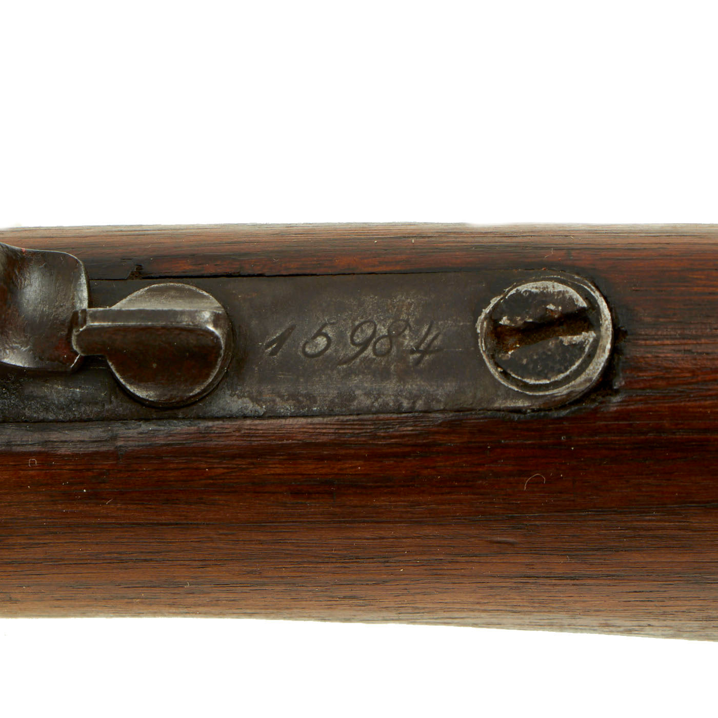 Stocks are in excellent condition, and are the lovely reddish-brown color of aged finished walnut, with a great grain. We do not see any sign that they were refurbished at any time. The crescent butt plate is in good shape with a working storage compartment door, however the butt stock itself was not drilled for it, so it opens to bare wood.