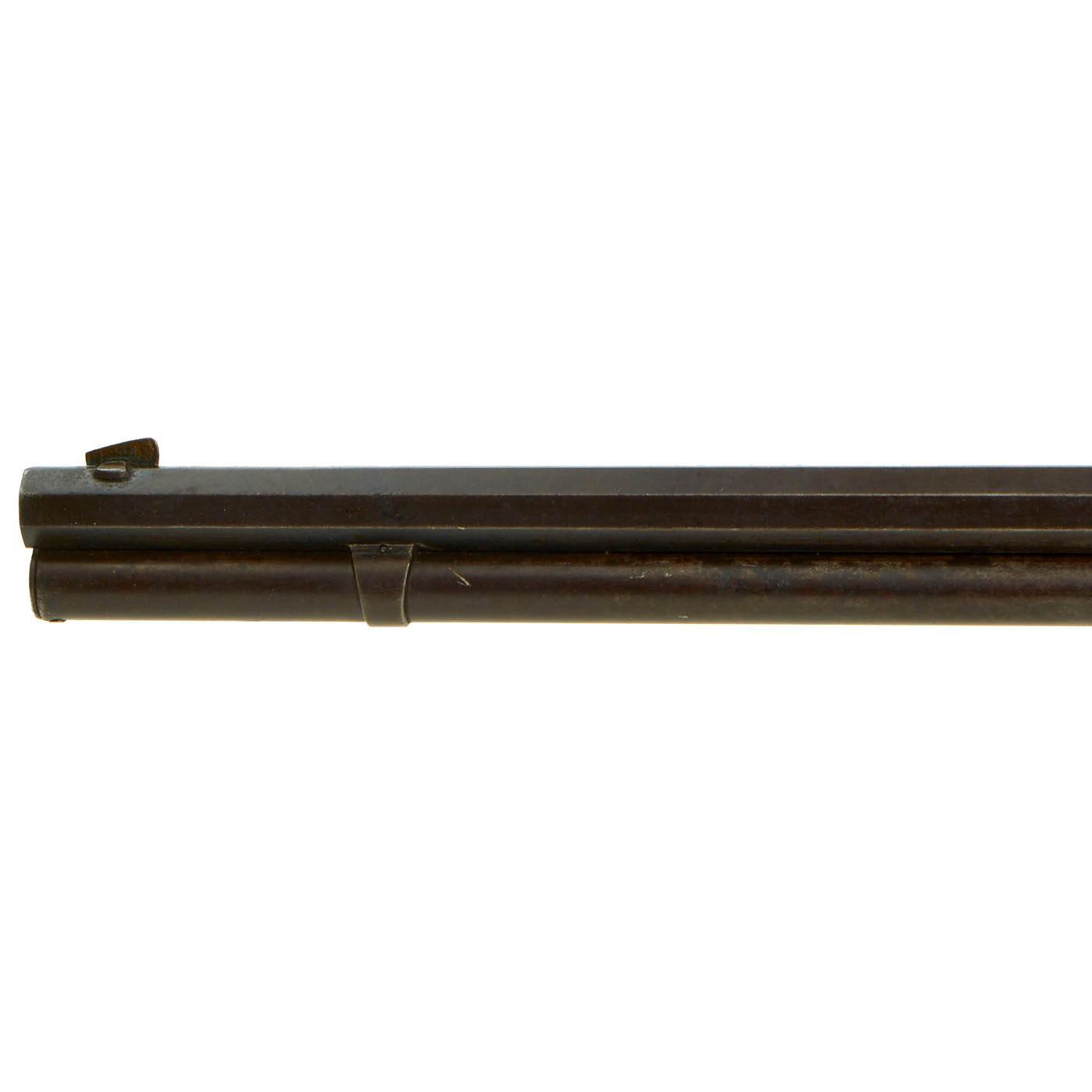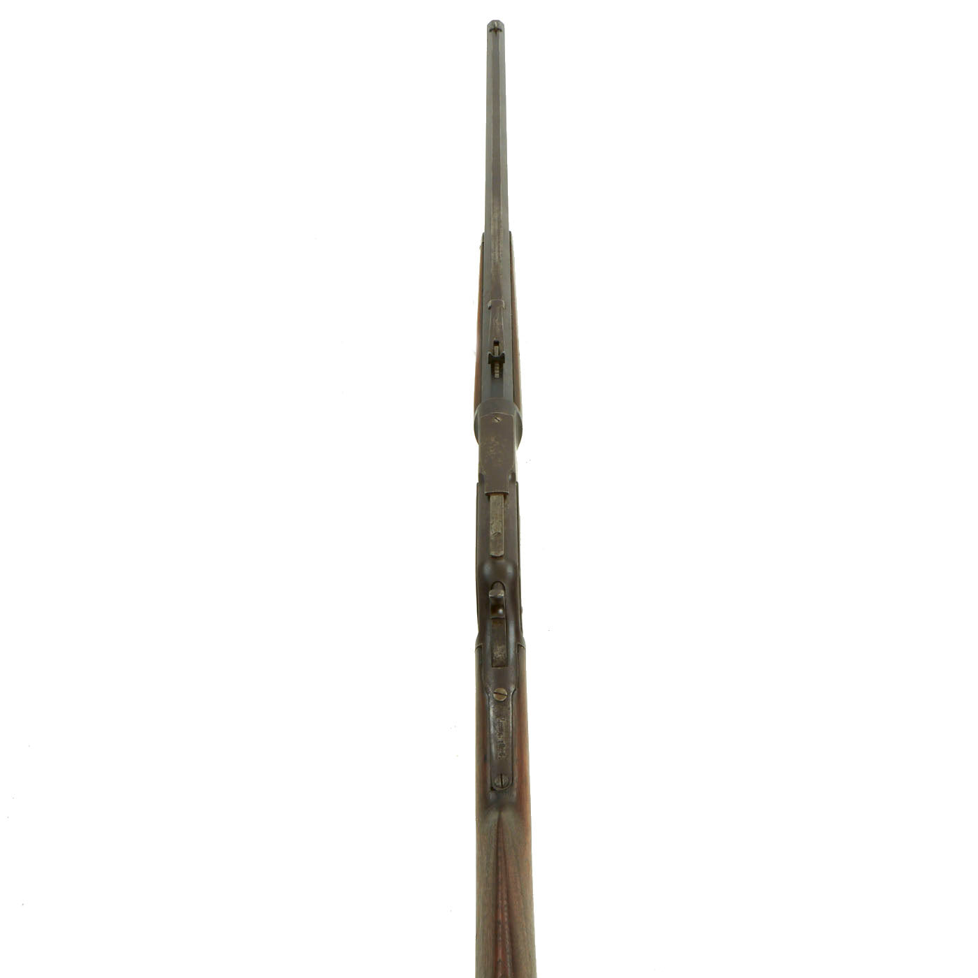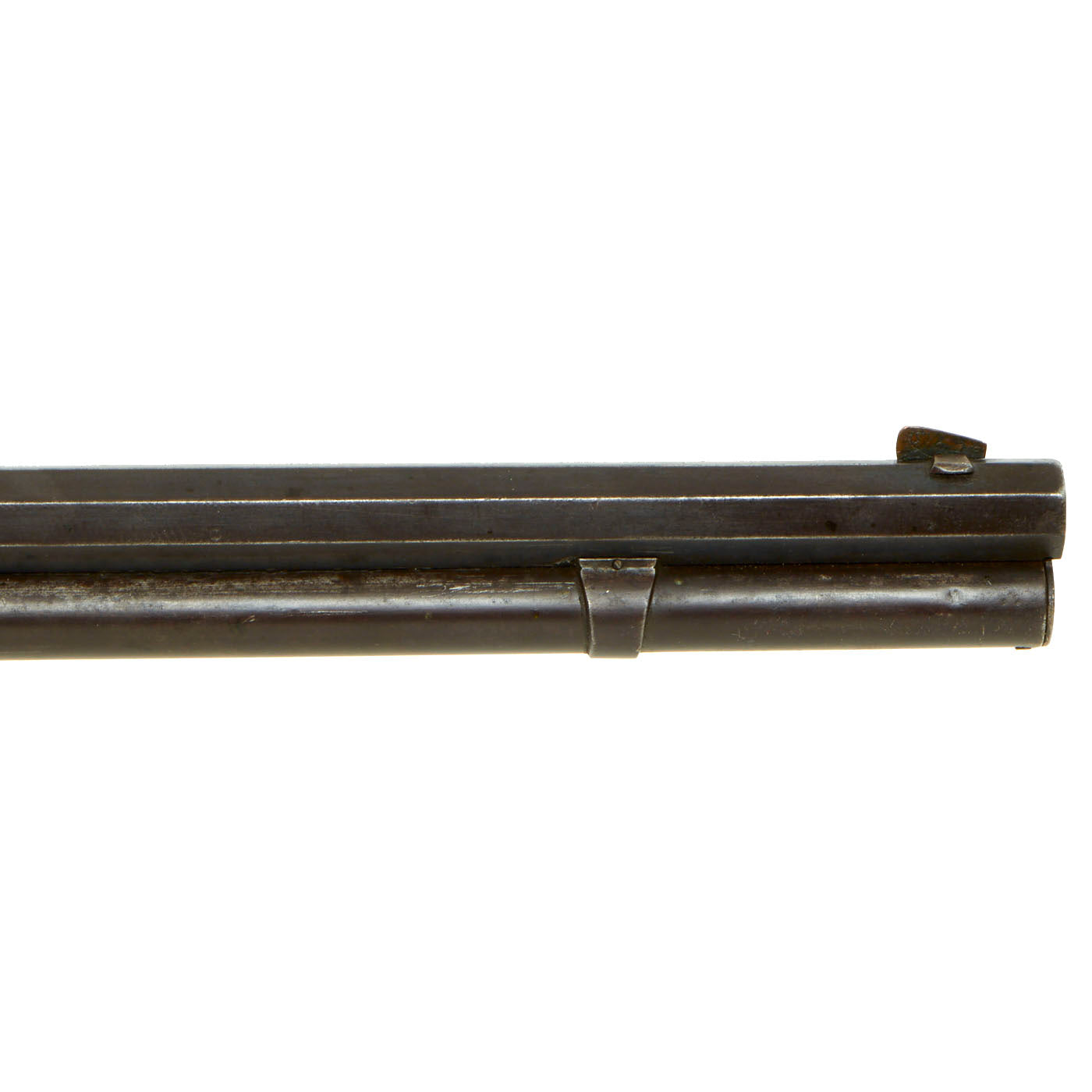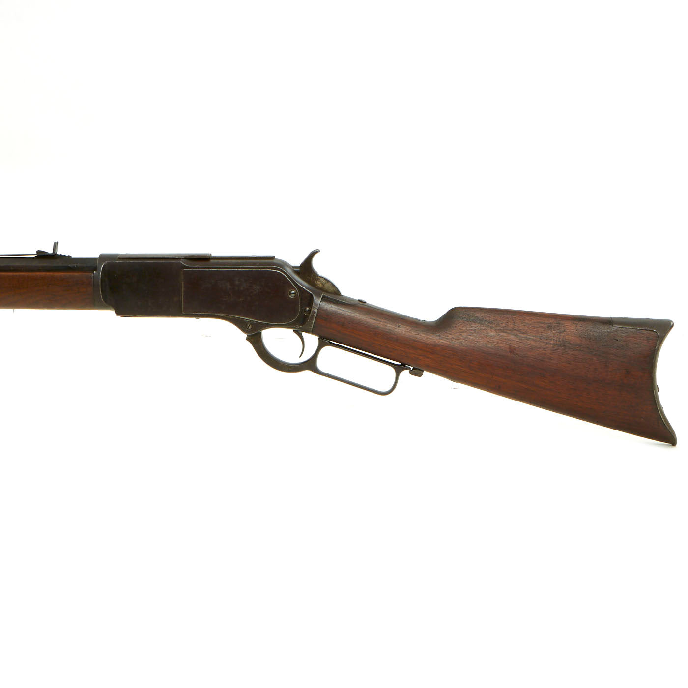 This lever action repeater is offered with a crisp tight action in fully functional condition, with a working original dust cover. Metal work is good, with much of the original finish present, and even some case hardening on some parts. There are a few areas of light peppering, but noting out of line with a rifle over 125 years in age. Bore is in good condition, showing clear lands and grooves with a partly bright finish. The lands are however worn, so this is definitely a rifle that saw quite a bit of use during its service life.