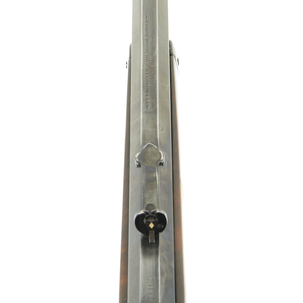 The top flat of the barrel has the early style Winchester barrel address which reads: