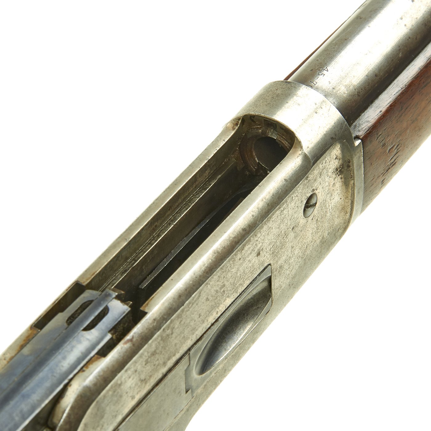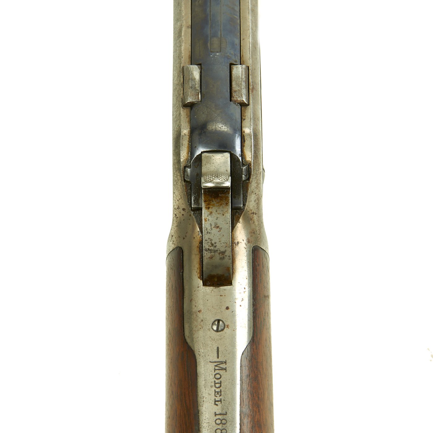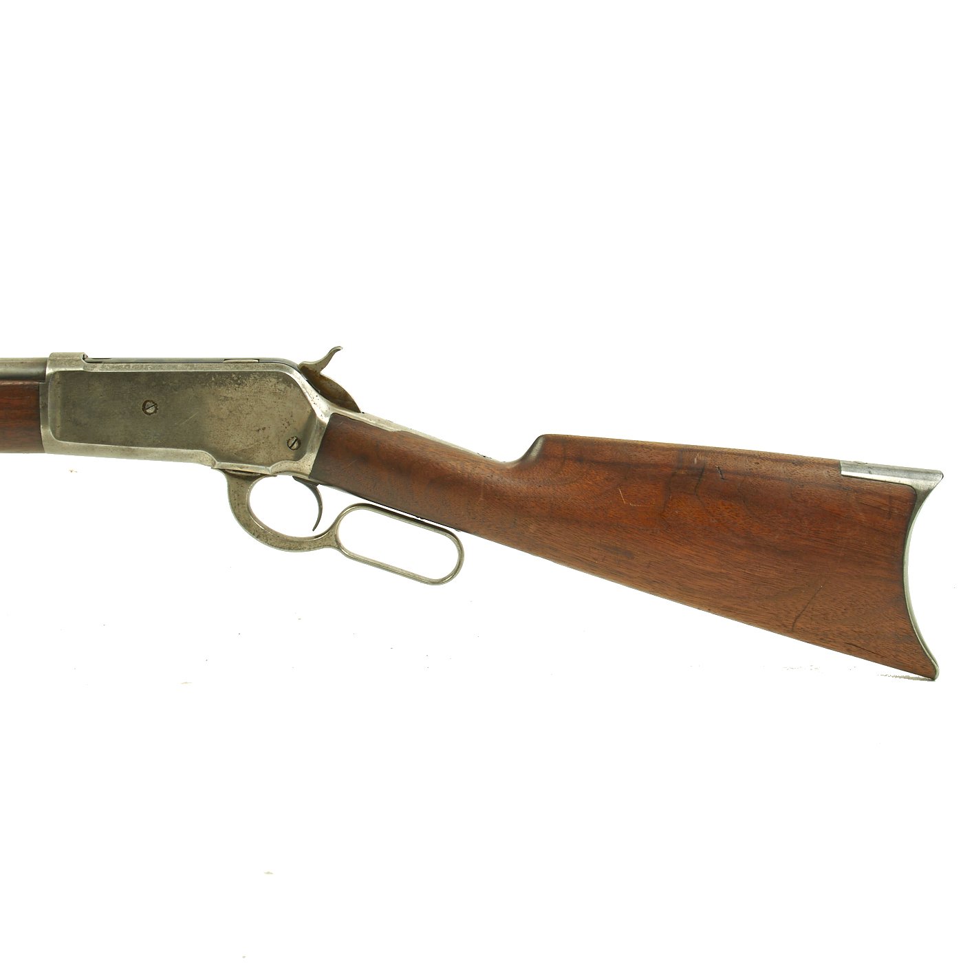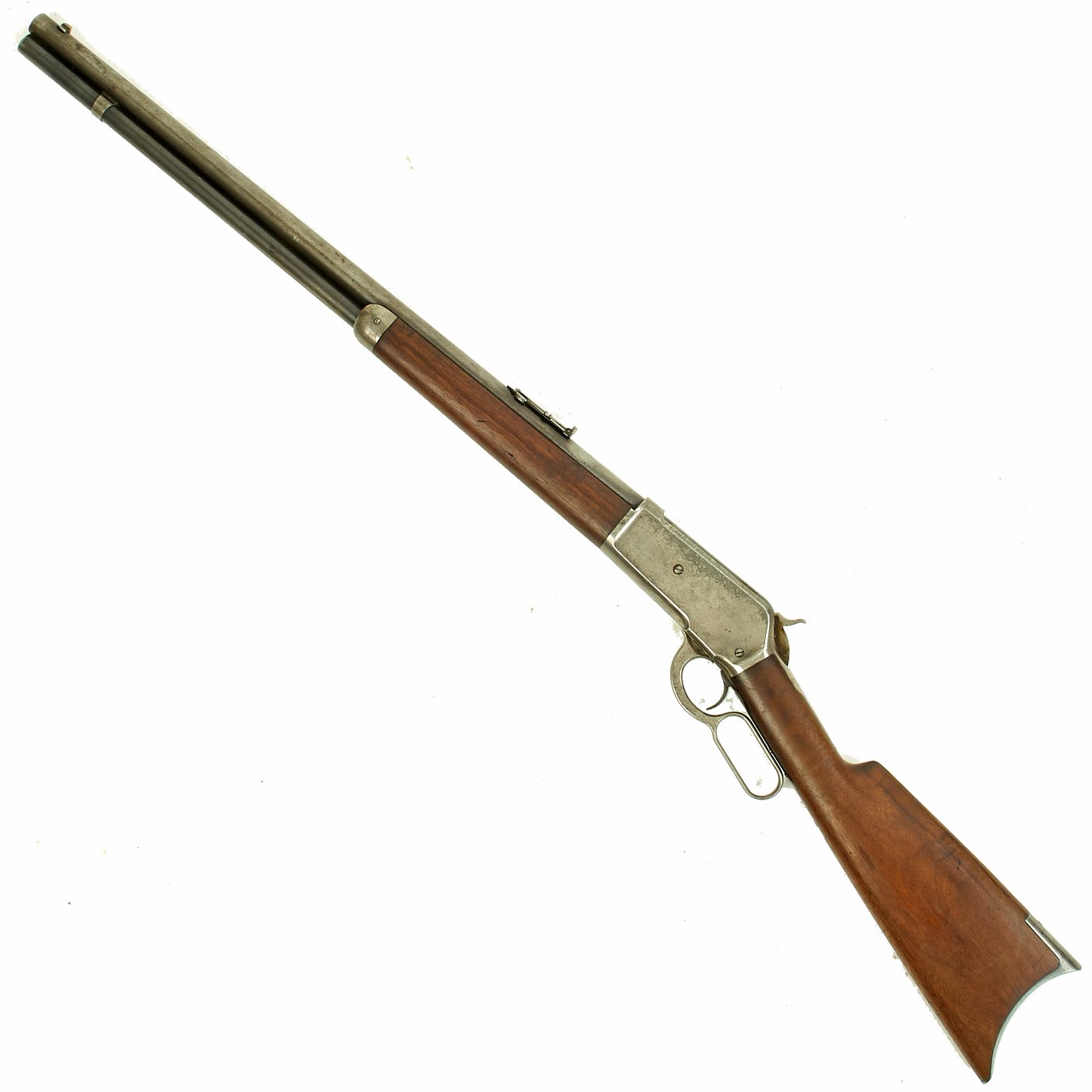 Original Item: Only One Available. This pretty much is the Cadillac of late 19th century big game hunting rifles! Many consider the Winchester 1886 to be the finest lever action repeating rifle ever made! This very fine example is in .45-70 Government caliber (marked 45 - 70 over the chamber) with a long 26" octagonal barrel, and full length magazine tube. It has the classic Winchester "blade" front sight, and the rear sight is a "flip up" adjustable ladder sight. The serial number on the lower receiver tang is 75015 denoting the year of manufacture as 1893.