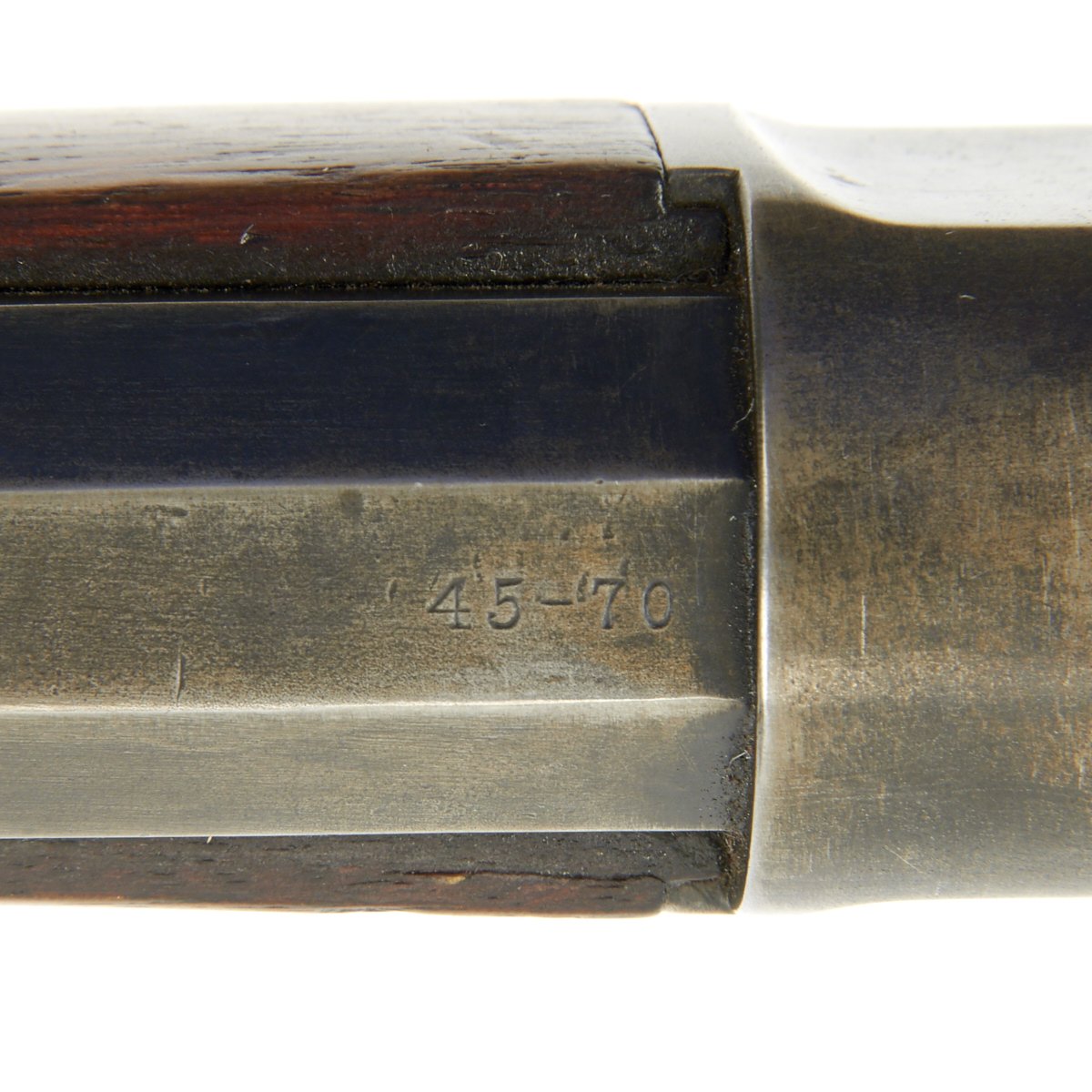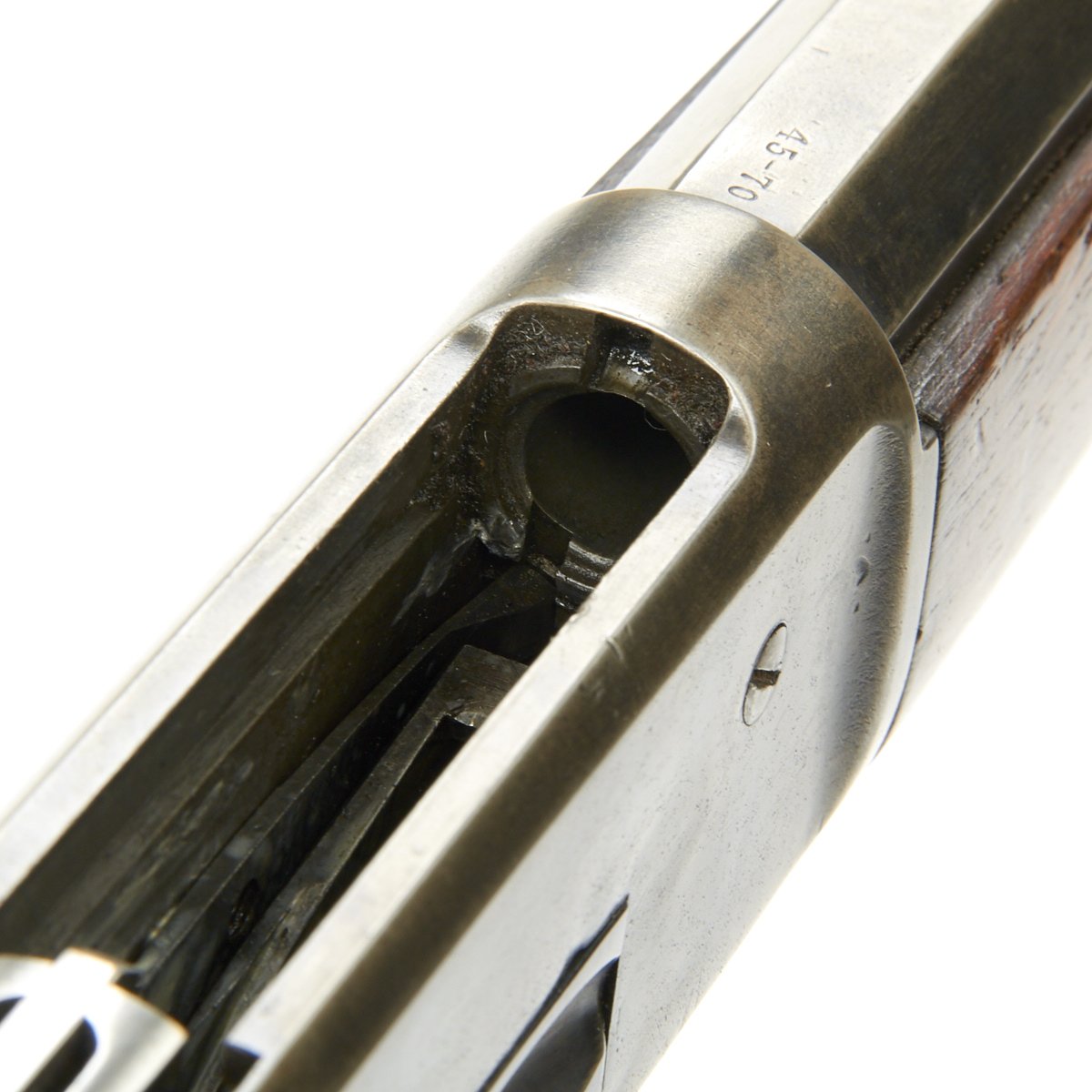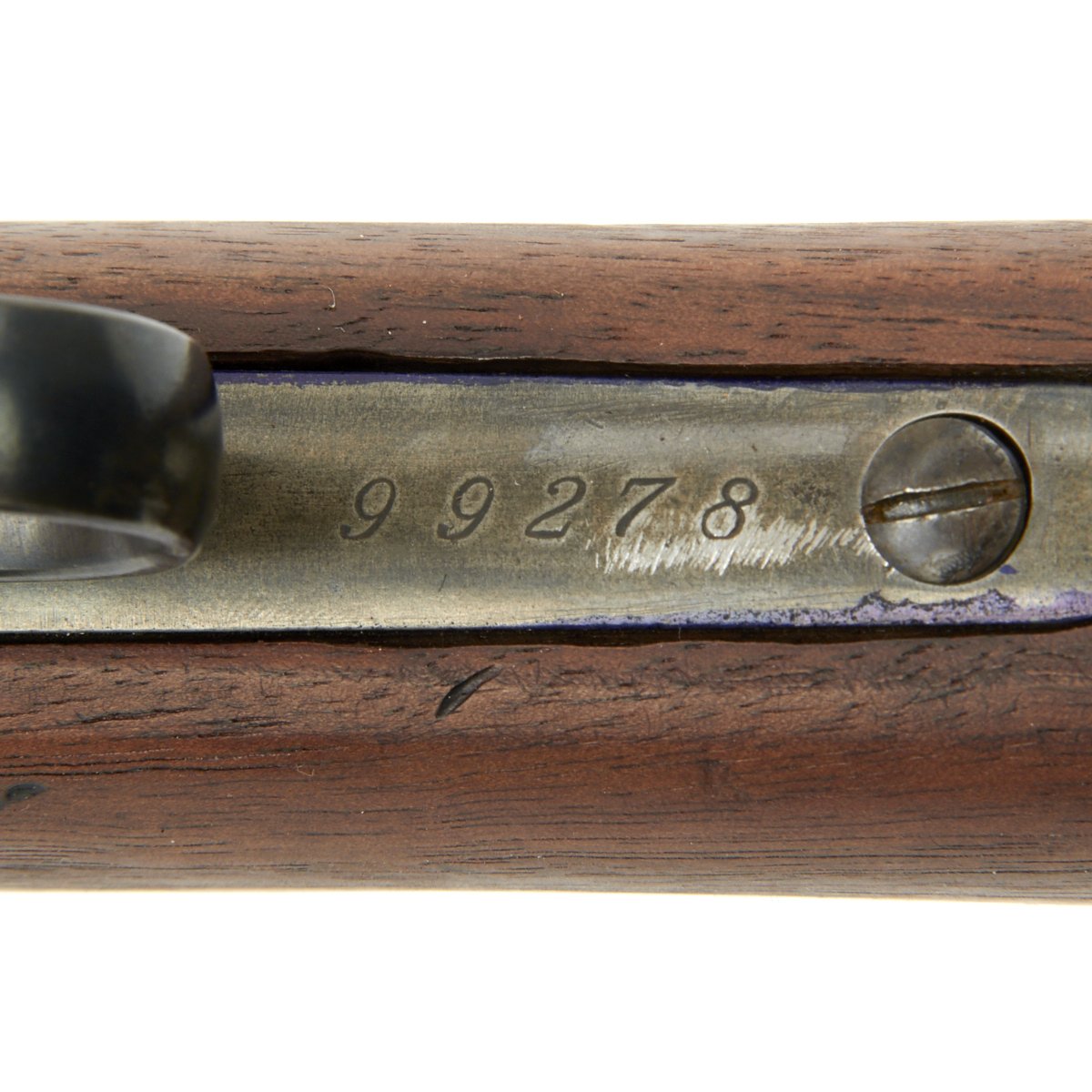 Original Item: Only One Available. This pretty much is the Cadillac of late 19th century big game hunting rifles! Many consider the Winchester 1886 to be the finest lever action repeating rifle ever made! This very fine examle is in .45-70 Government caliber (marked 45-70 over the chamber) with a long 28" barrel, the longest barrel that Winchester made on this model. It also has been fitted with front and rear precision "peep" sights, for a very accurate aim. The original rear sight bed is filled in with a dovetailed insert. The serial number is 99278 denoting the year of manufacture as 1895.