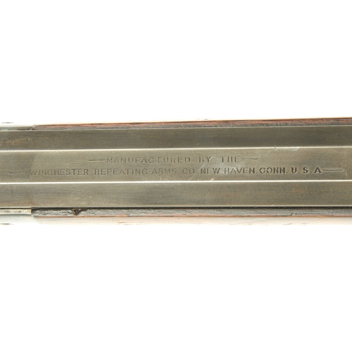 The top flat of the barrel has the early style Winchester barrel address which reads: