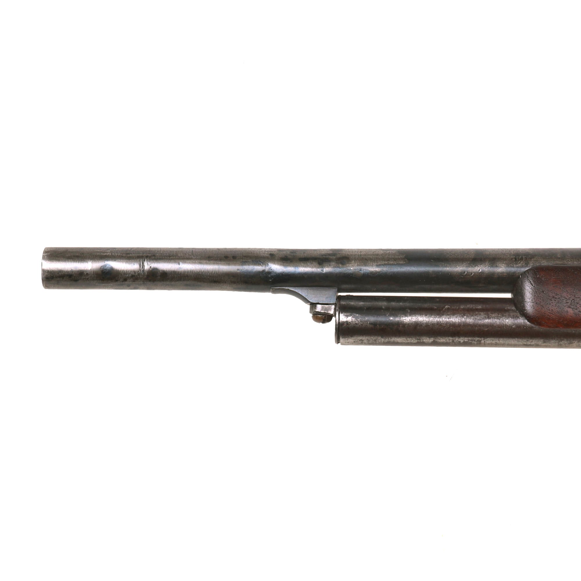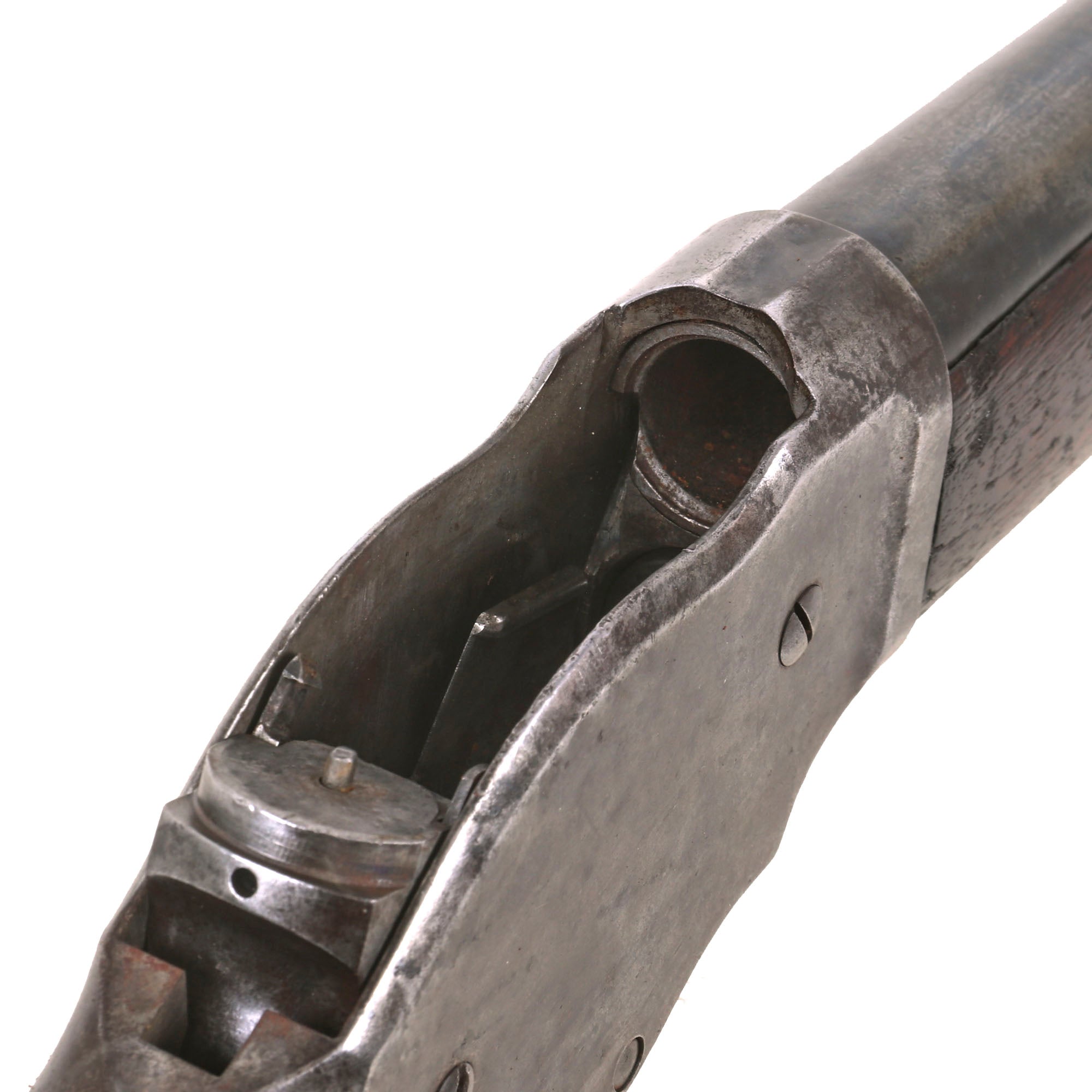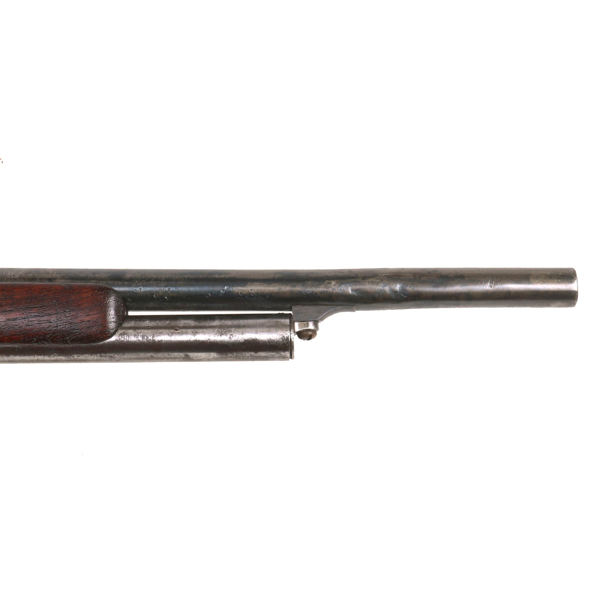 The metalwork overall is faded to mottled patina on the barrel, which was original fully blued, and the magazine tube has lost the original finish. There is still some of the original bluing on the magazine tube. The action was originally case hardened, and some of that finish is still visible on the inside of the action, however the outside now shows a lightly stained patina. The action is in fully functional condition and cycles well, with a crisp dry fire.