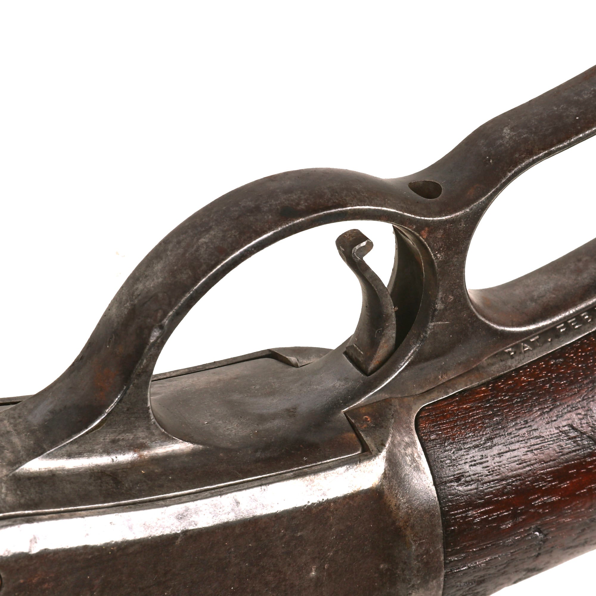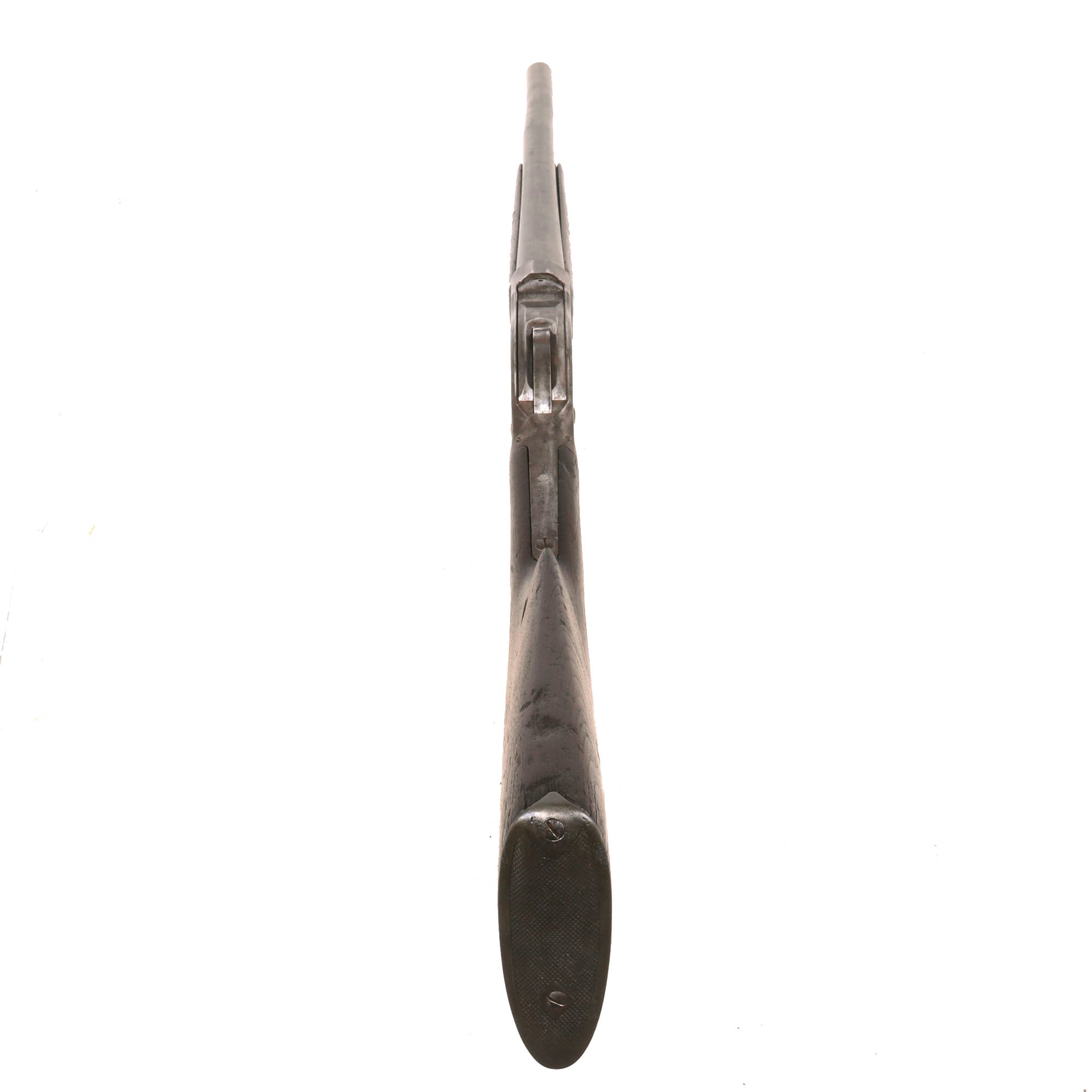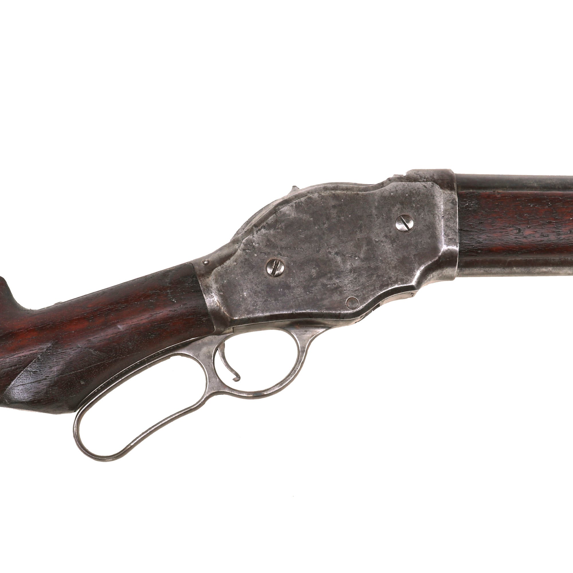 The metalwork overall is faded to mottled patina on the barrel, which was original fully blued, and the magazine tube has lost the original finish. There is still some of the original bluing on the magazine tube. The action was originally case hardened, and some of that finish is still visible on the inside of the action, however the outside now shows a lightly stained patina. The action is in fully functional condition and cycles well, with a crisp dry fire.