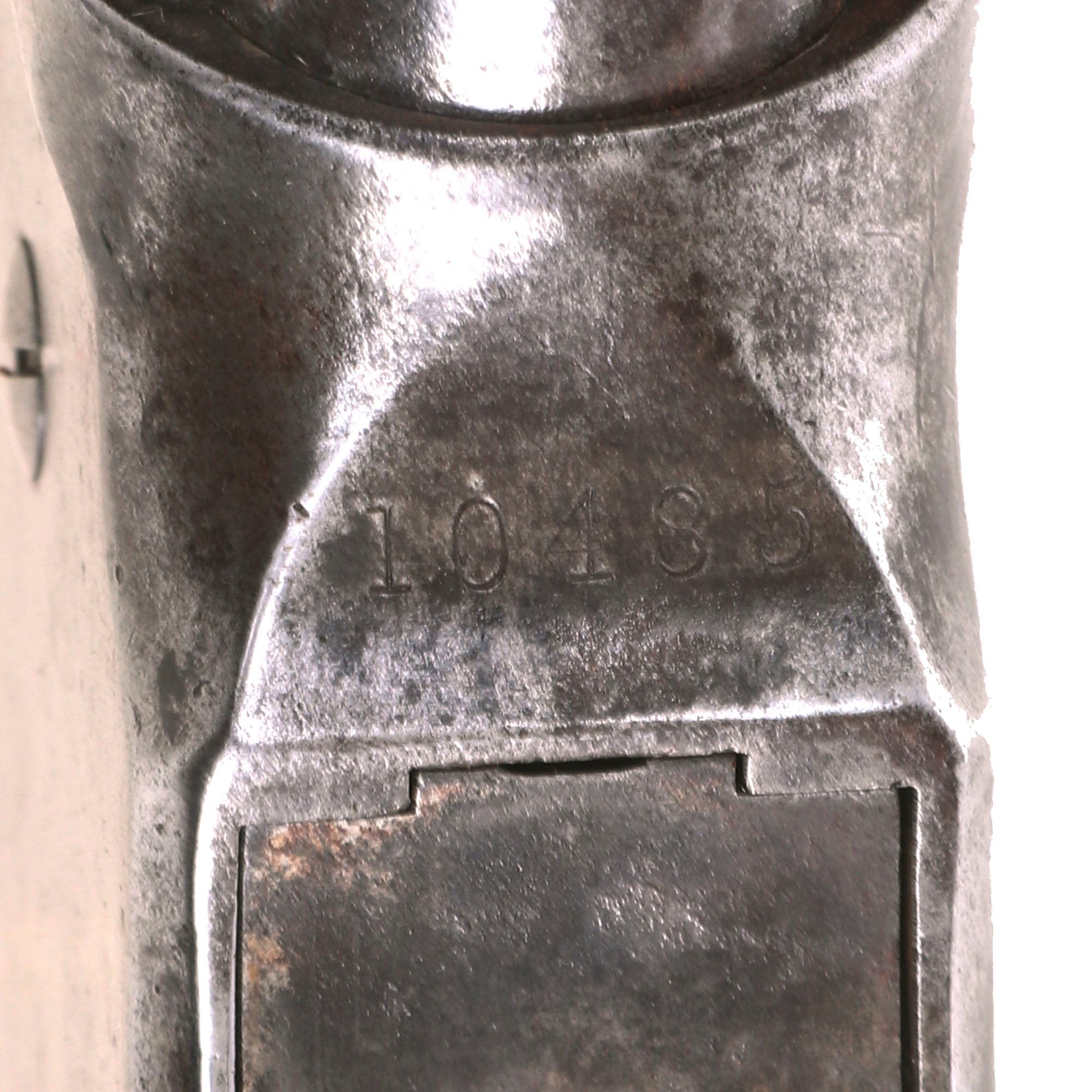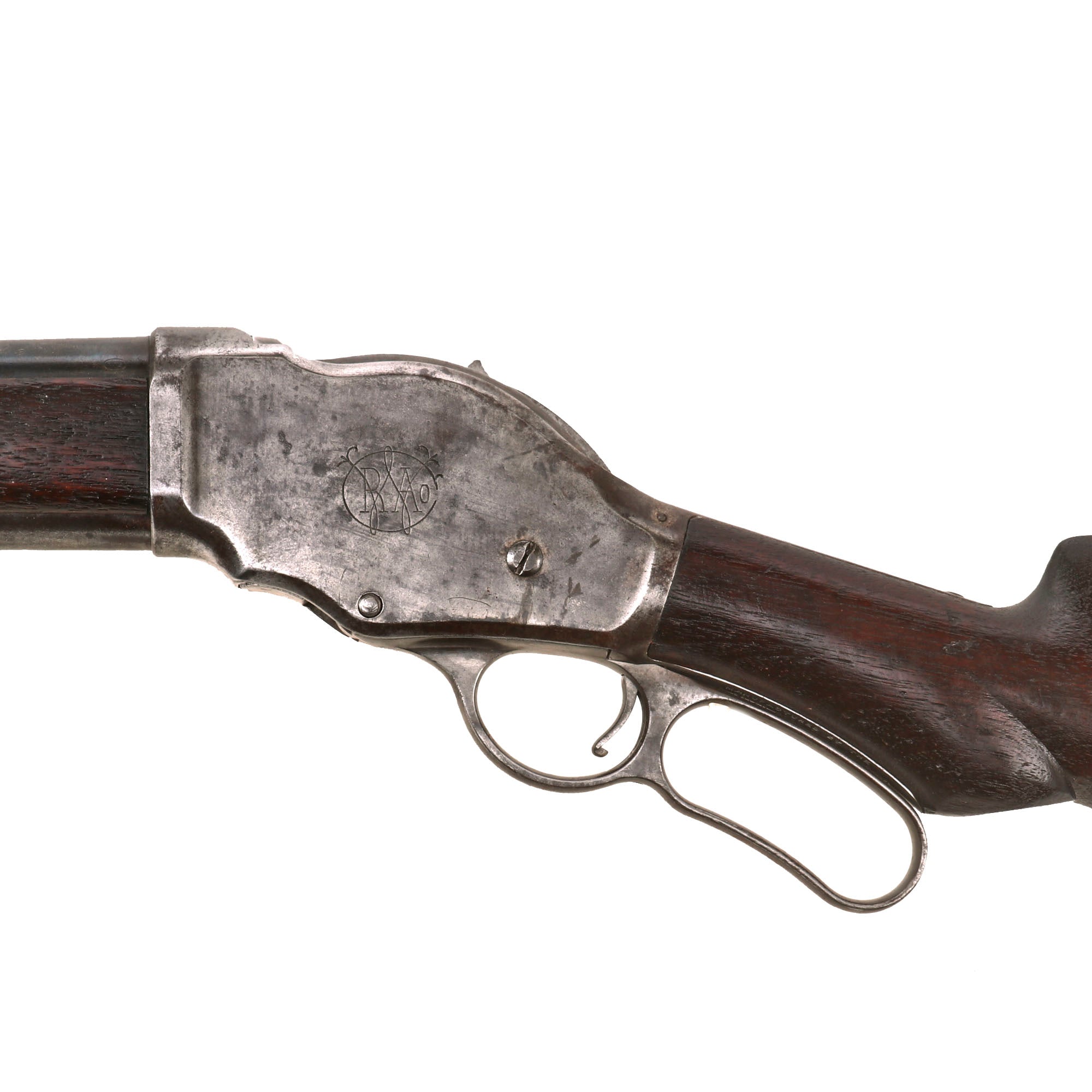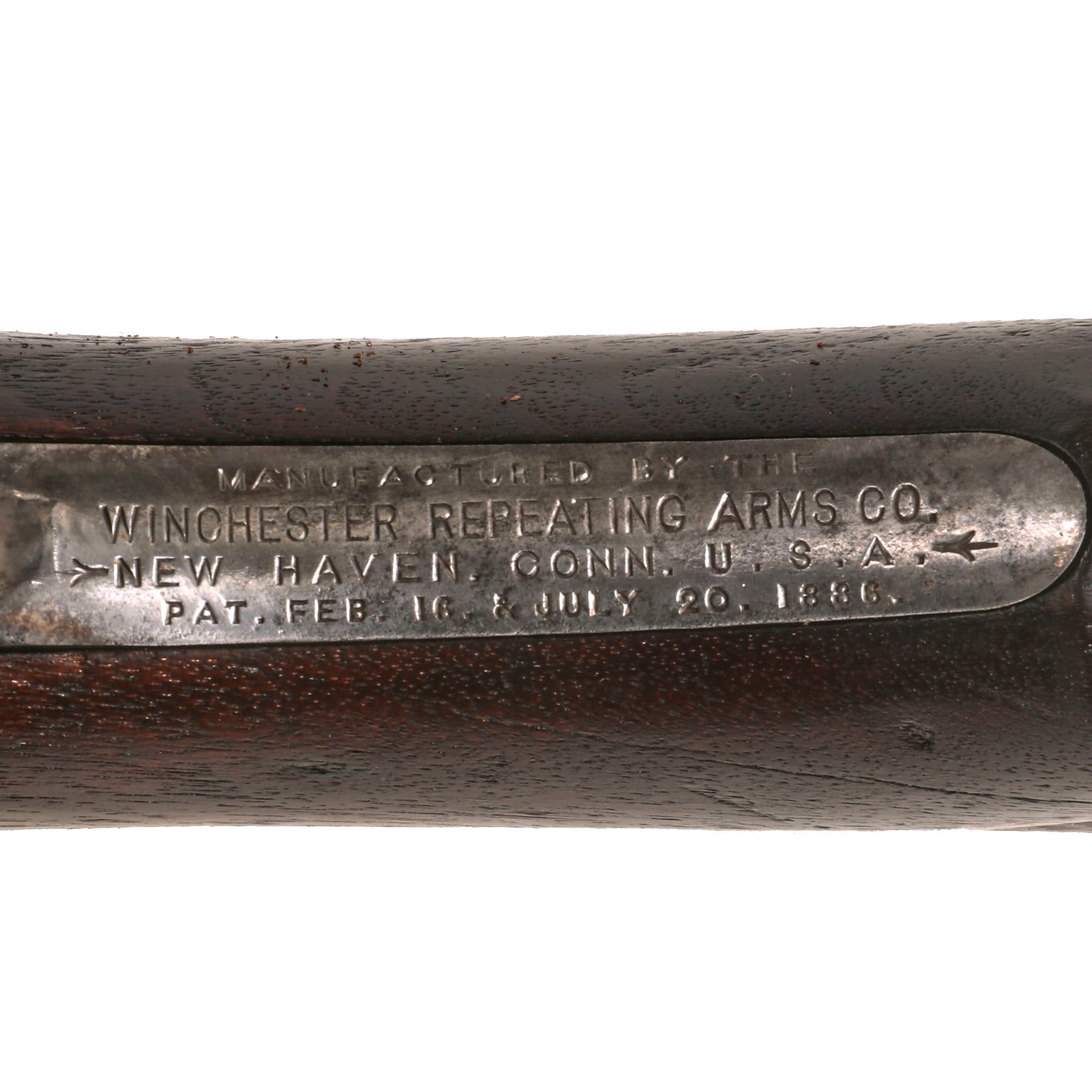 Serial number 10485 on the front underside of the receiver denotes year of manufacture as 1888, one of 13,422 made that year. The left side of the receiver is marked with the W R A Co overlapping monogram, and the left side of the barrel has the Oval WP proof mark, though the barrel gauge has worn away. The lower receiver tang still has the correct Winchester markings fully intact and easily legible: