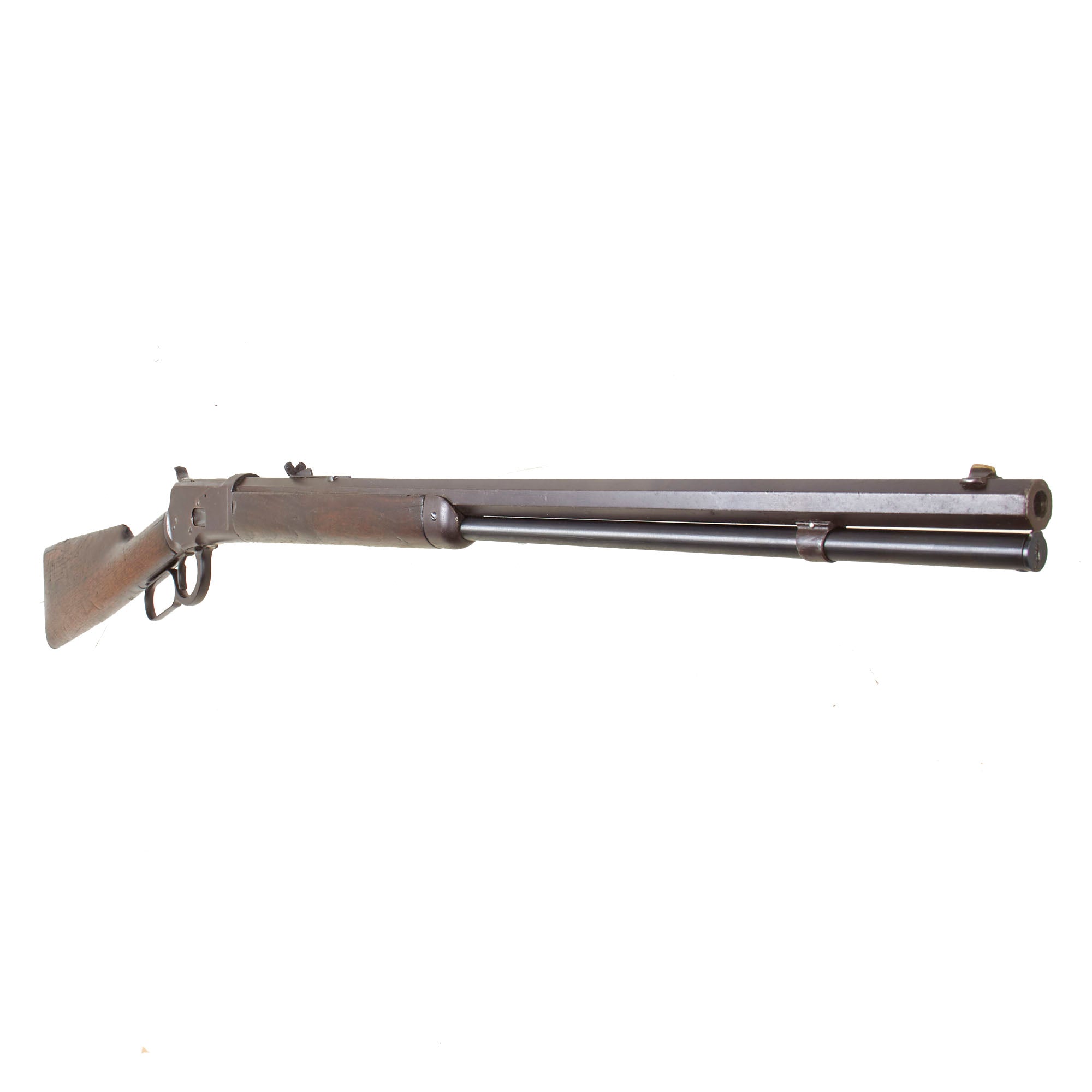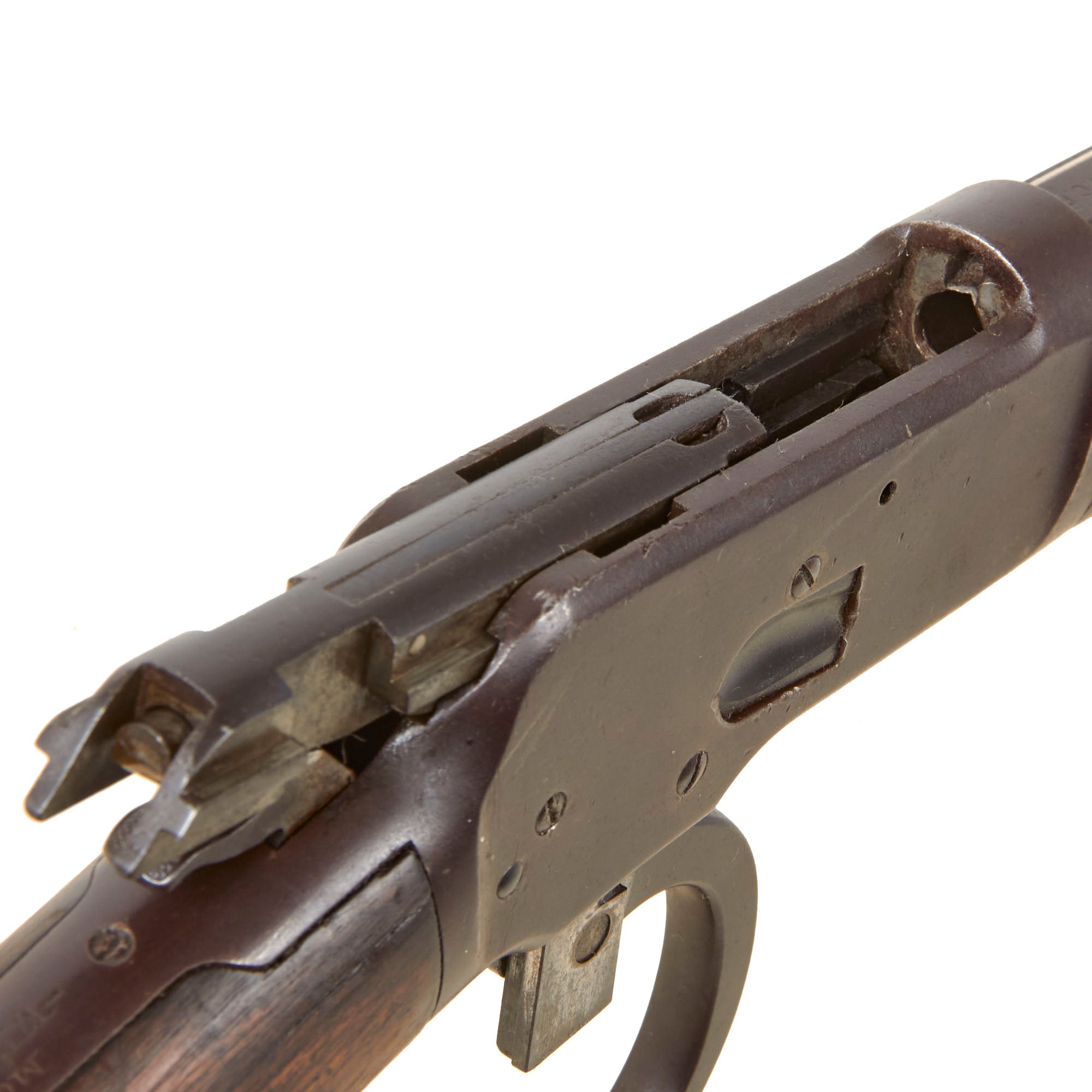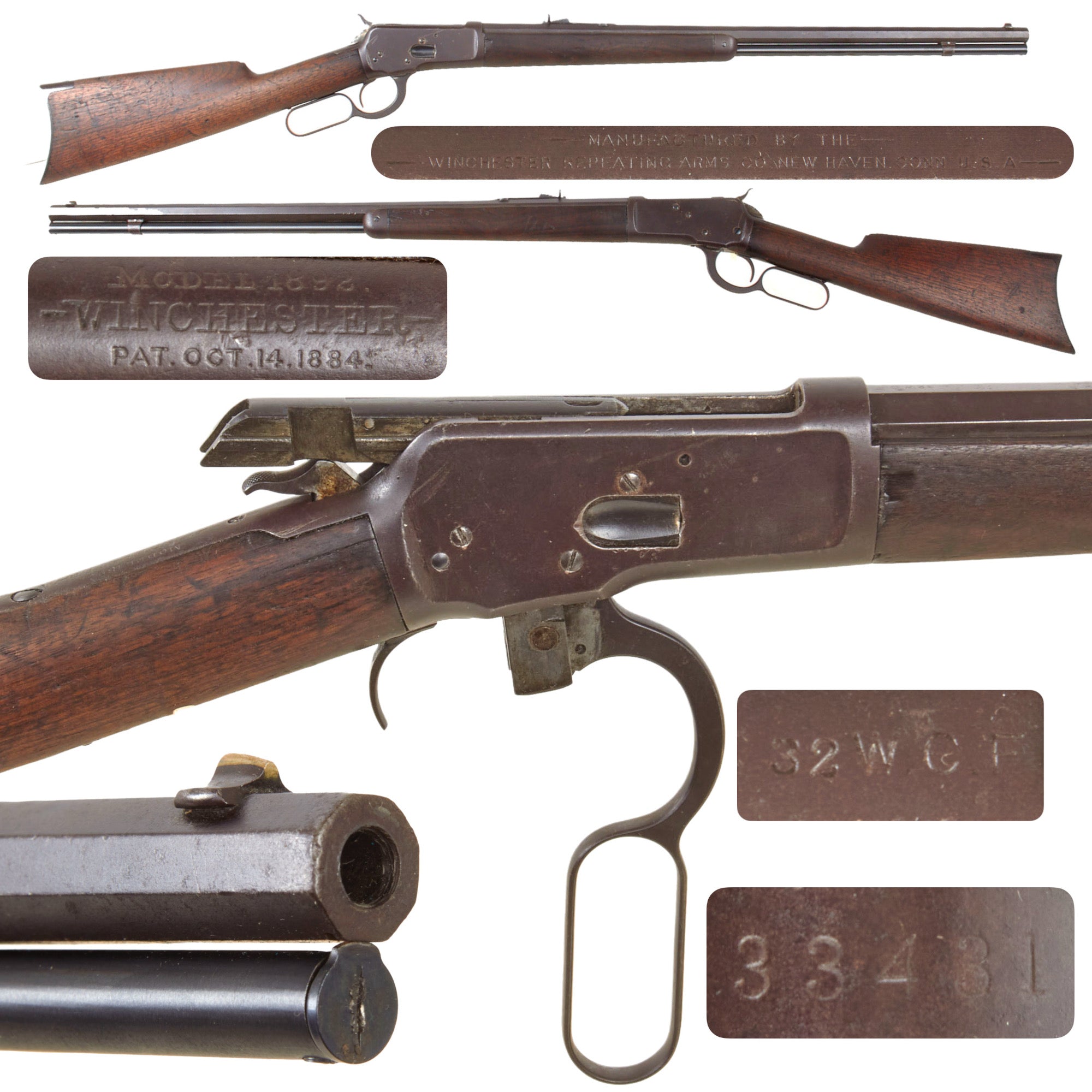 Original Item: Only One Available. "John Wayne's favorite gun!" This fine "frontier used" rifle is in .32-20 caliber (Marked 32 W.C.F. above the chamber) with a desirable 24 inch octagonal barrel and full-length magazine tube. Features the classic front sight and iconic "buckhorn" adjustable rear sight. Serial number 33431 denotes year of manufacture as 1893, the SECOND YEAR OF PRODUCTION. The address marking on top of the barrel is still fully legible:-