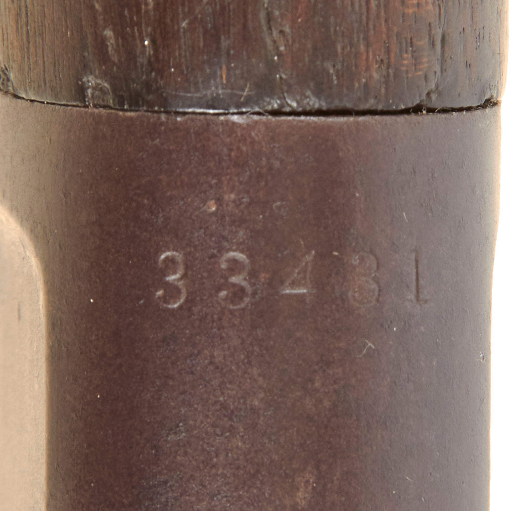 Original walnut stocks are in very good solid condition with the classic deep red brown color of aged oiled walnut, and have a lovely polished glow. They have no major structural issues, however there is definitely wear from service, including dents, gouges, and some small chunks missing. The fore stock has some chipping where it meets the receiver, and the butt stock does show some stress cracks on the right side. Features a crescent butt plate without a storage compartment.