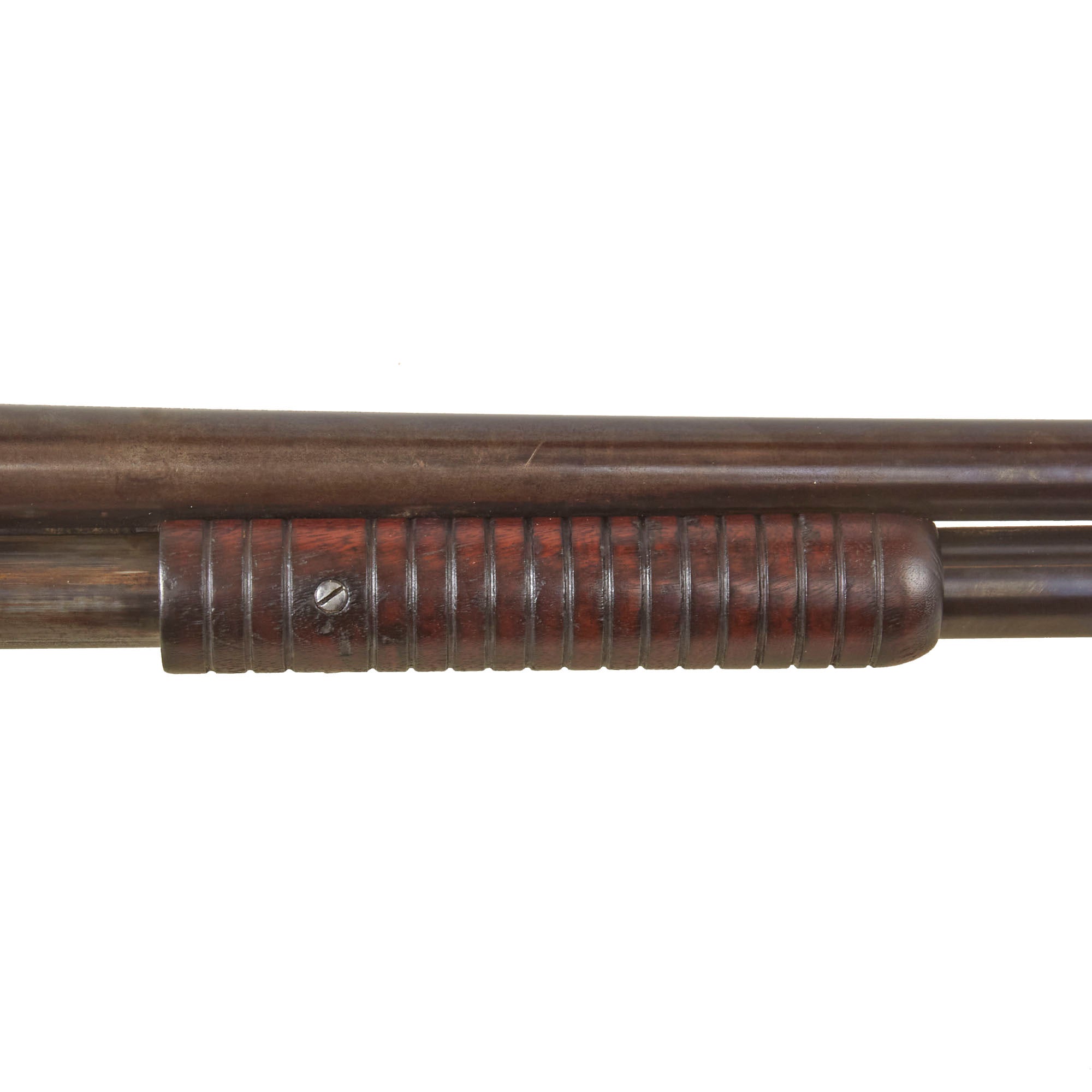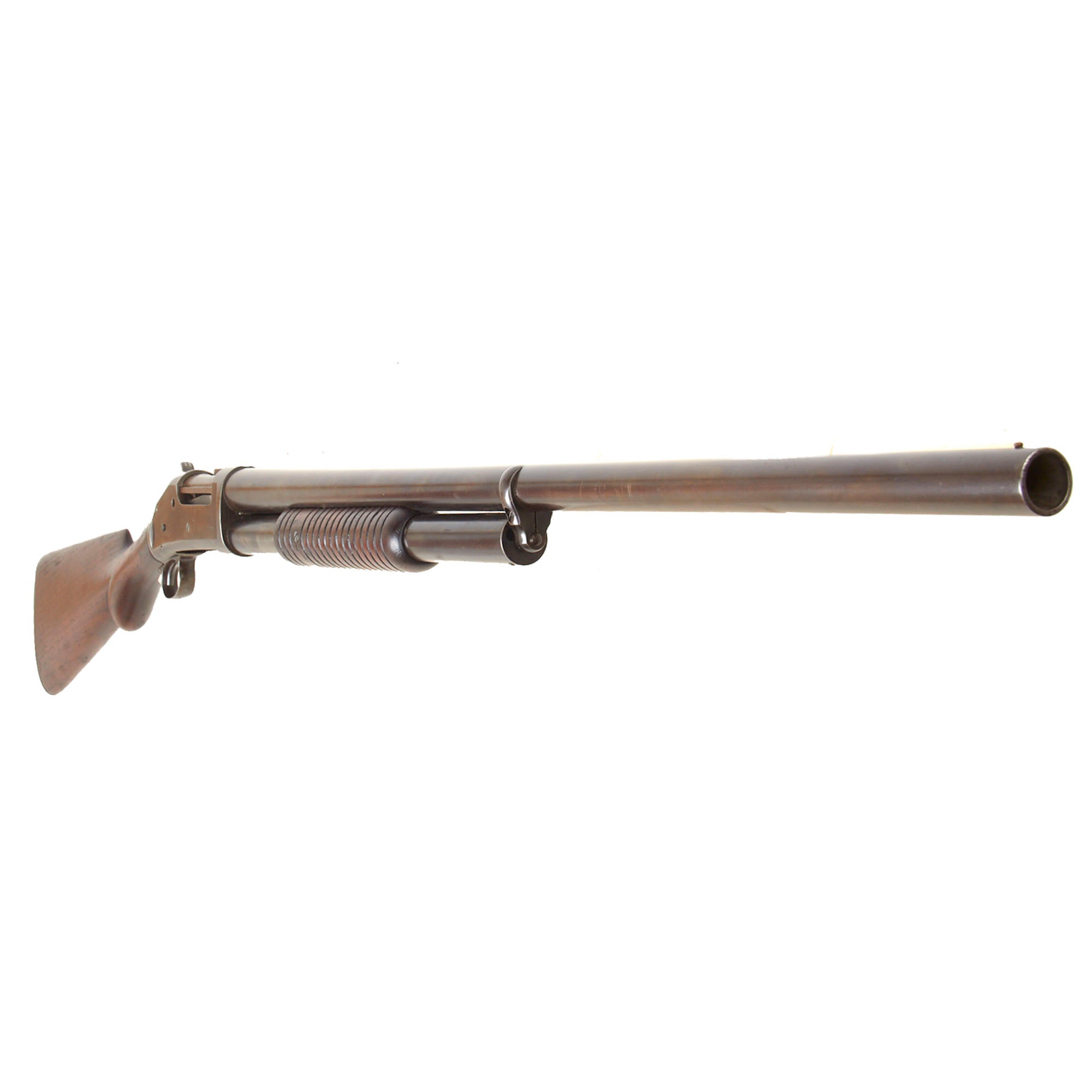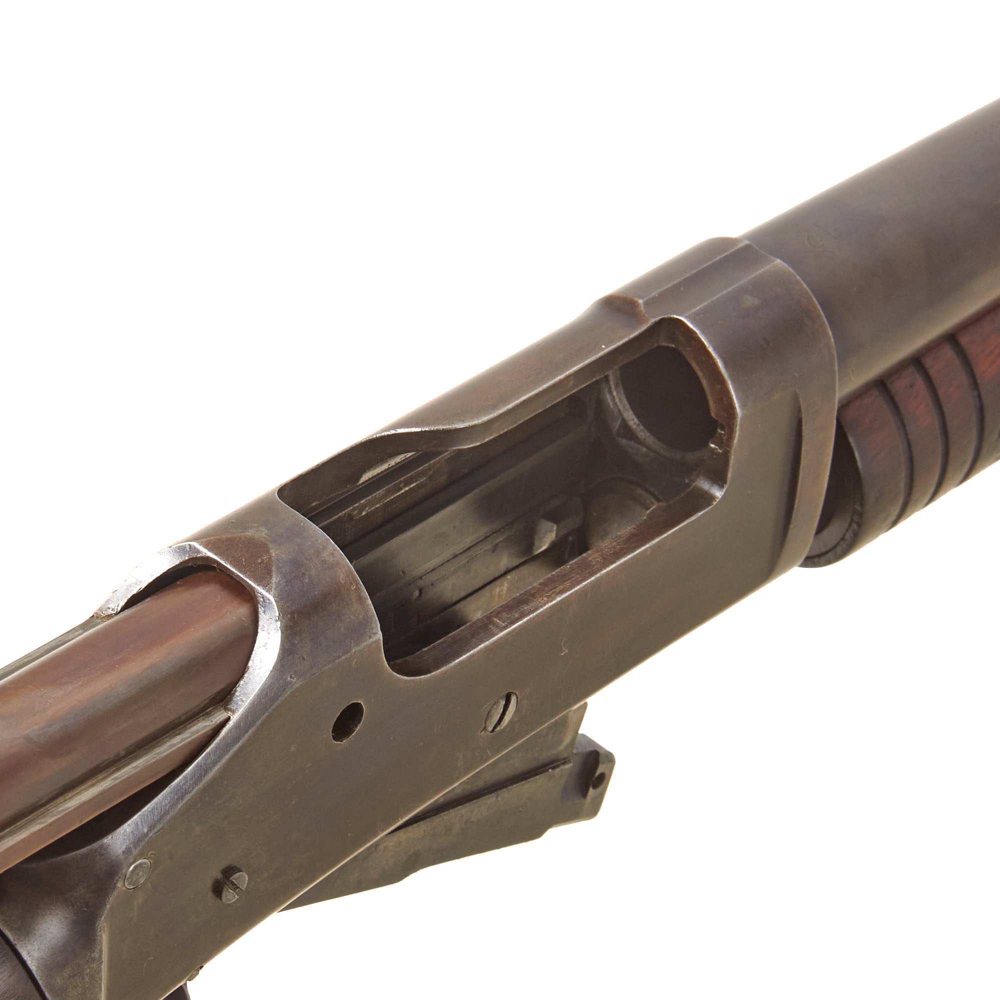 The bore is clear and partly bright, with past powder fouling and oxidation present in areas. It looks to have seen a good amount of use while in service. The metalwork overall is faded to a lovely plum patina on the barrel, which was original blued. The magazine has more of the bluing intact in front of the fore stock, while behind it the finish is worn to plum. When cycling the gun we can see that the under the pump / slide most of the finish is missing. The action was originally case hardened, but now is worn to mottled blue brown patina in most areas, except on the carrier, which still retains a good amount of the original bluing. The action works well, though we have no way to check to see if it still feeds well. We did notice that hammer very often does not end up fully cocked after cycling, and needs to be pulled back manually.